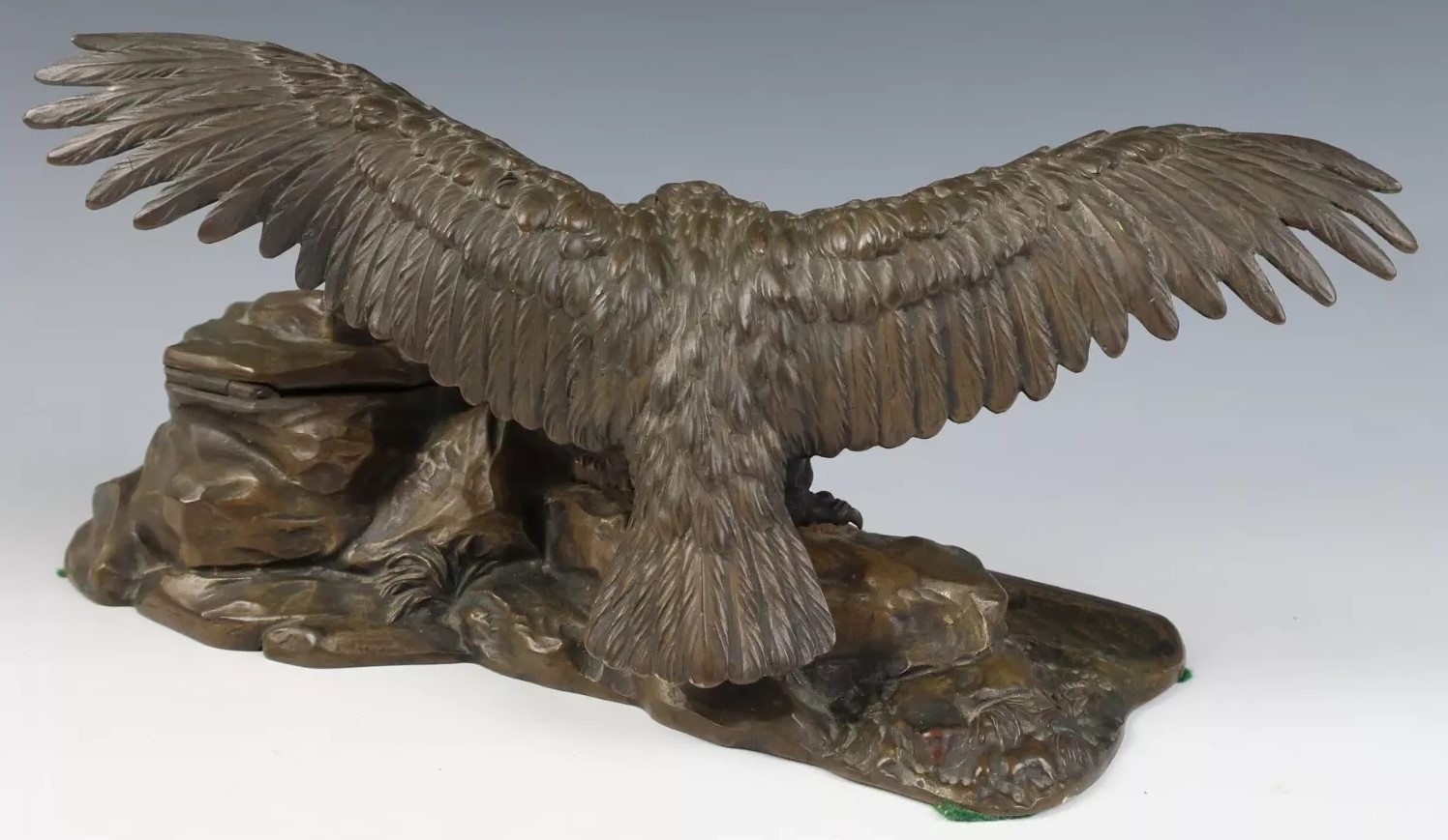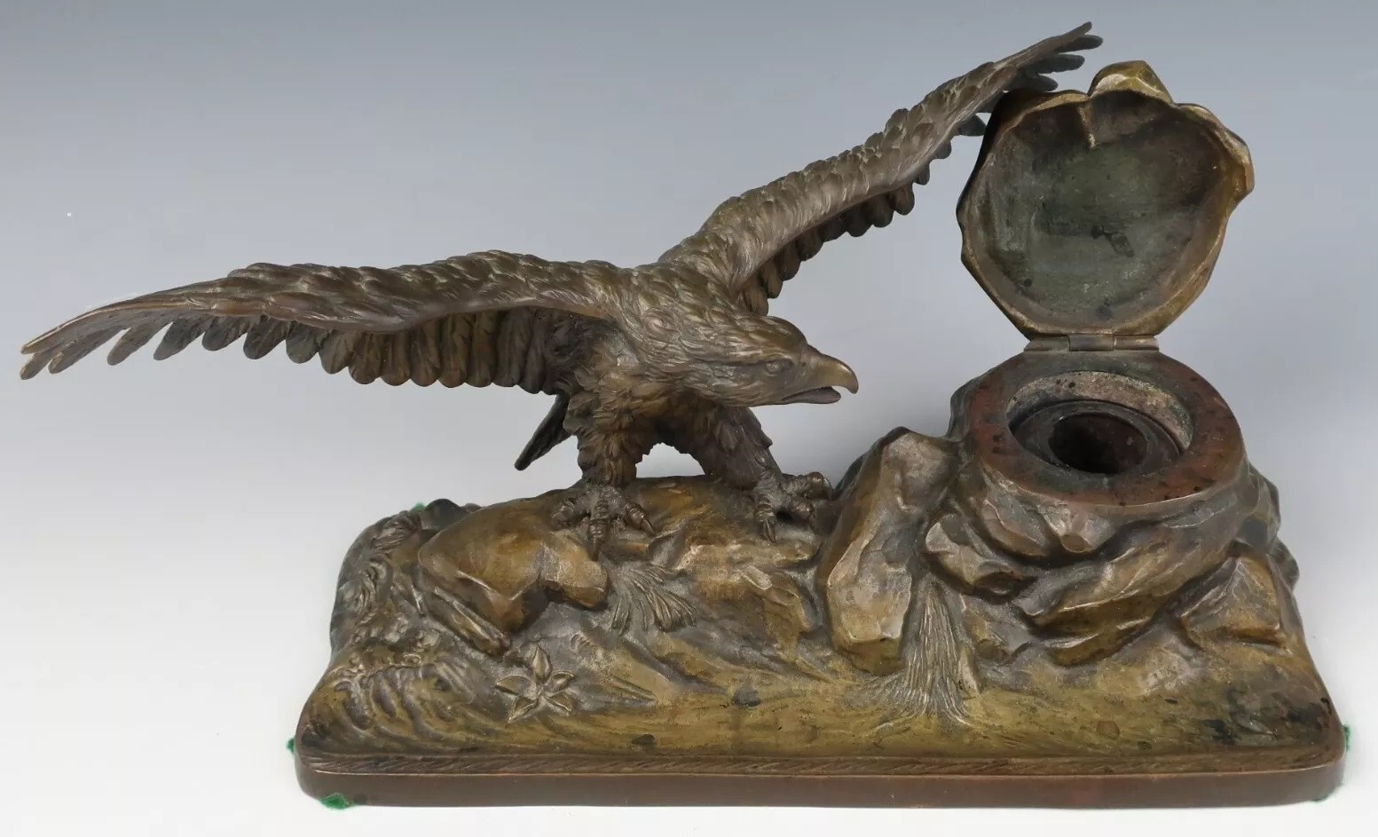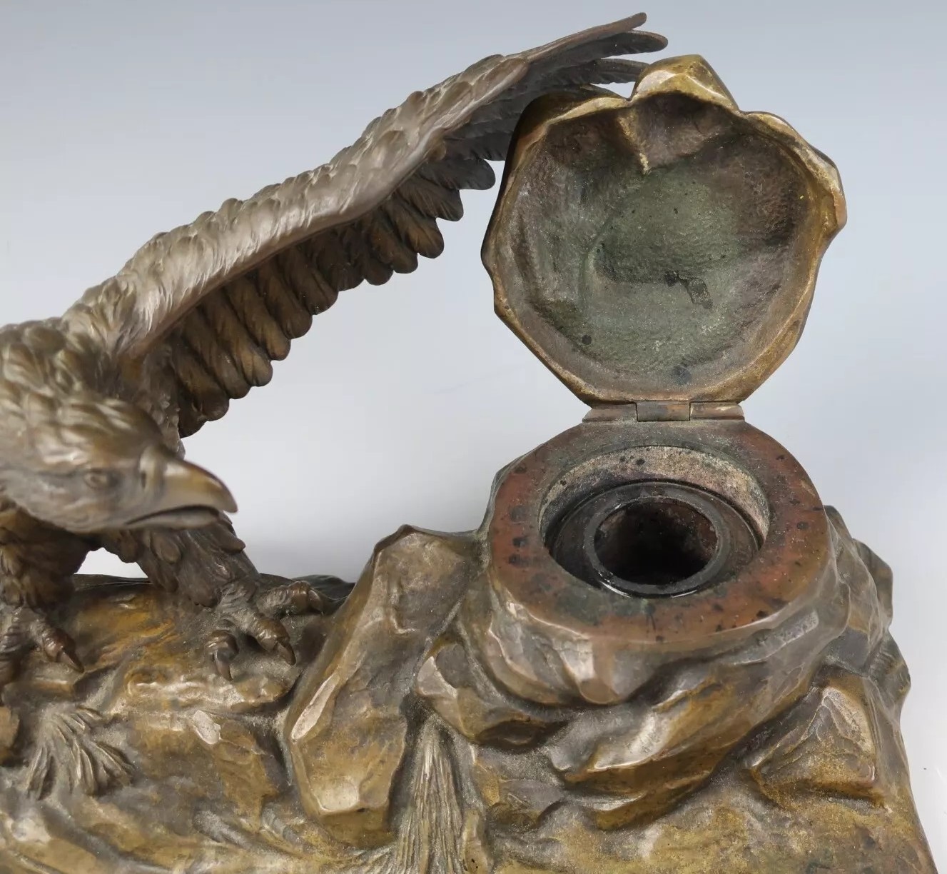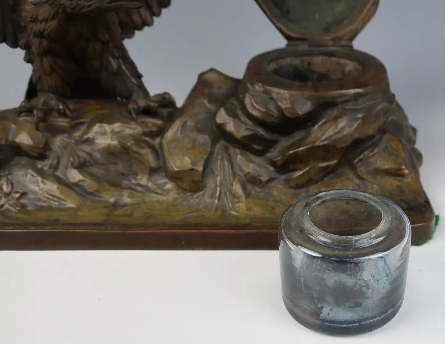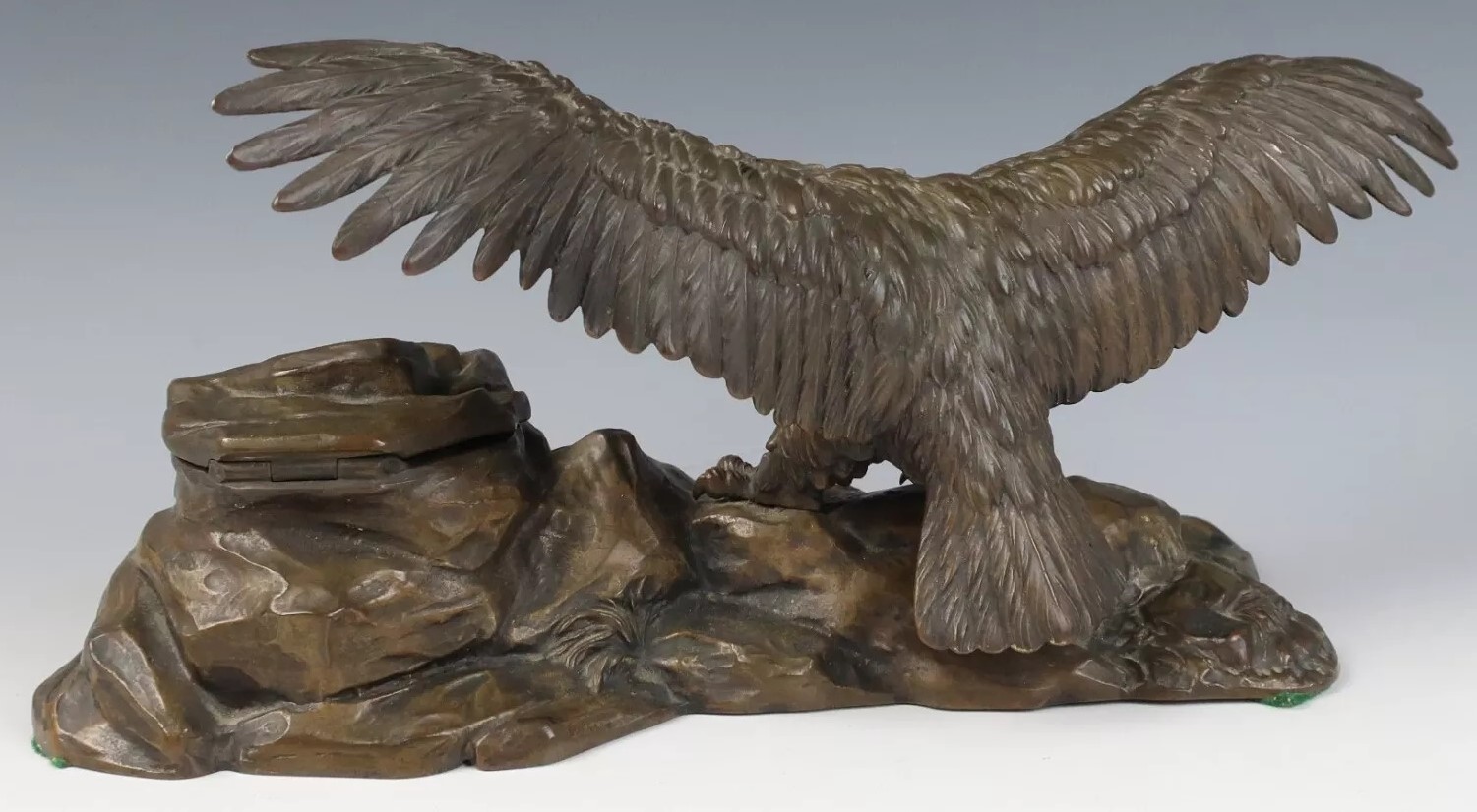 An eagle with outstretched wings is perched atop a rocky formation which holds the inkwell.