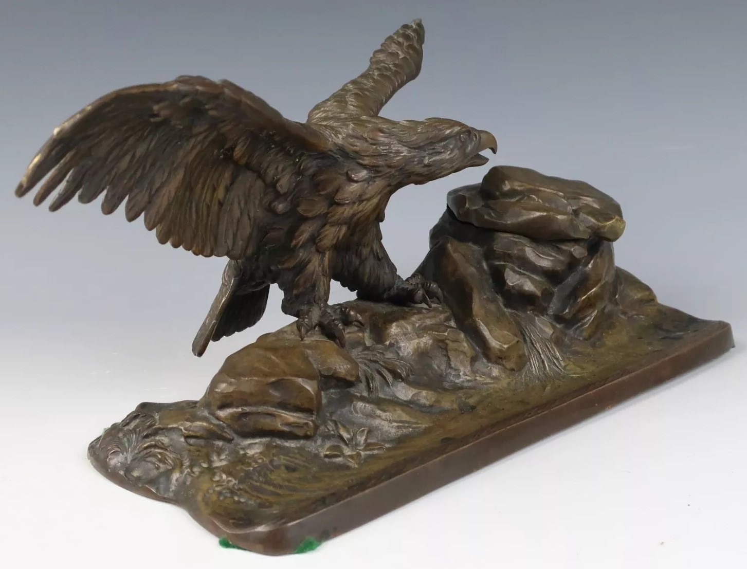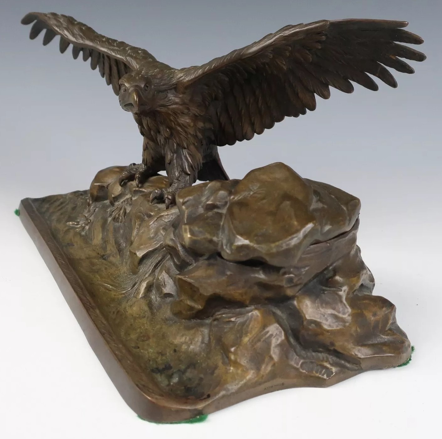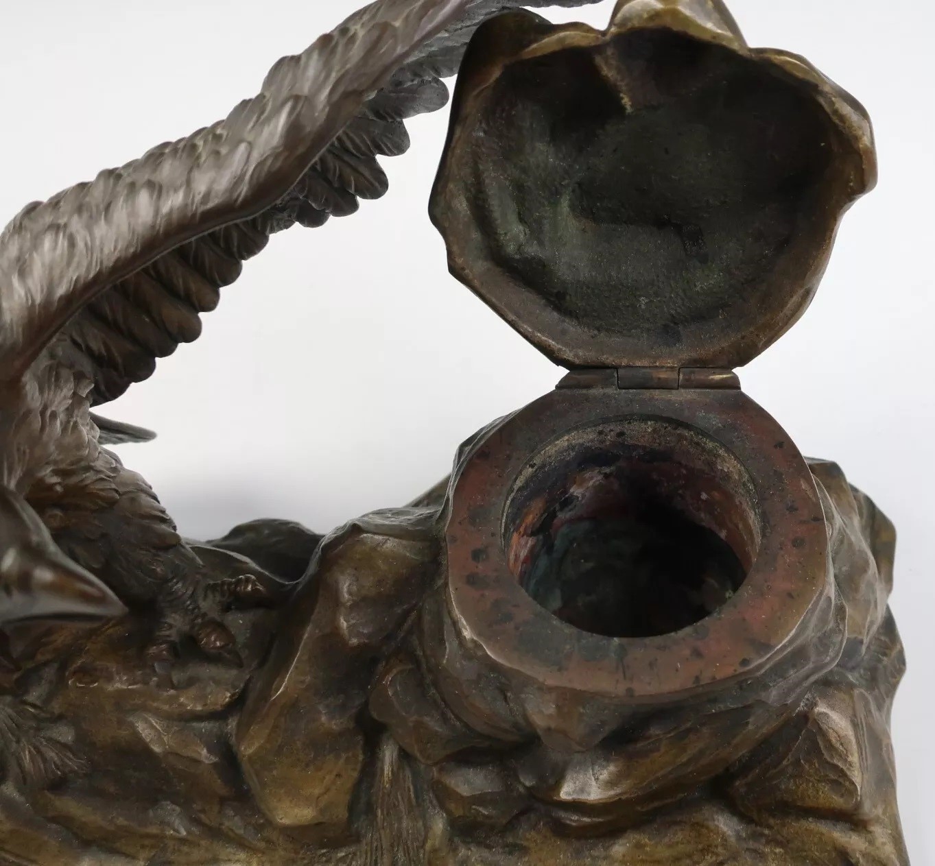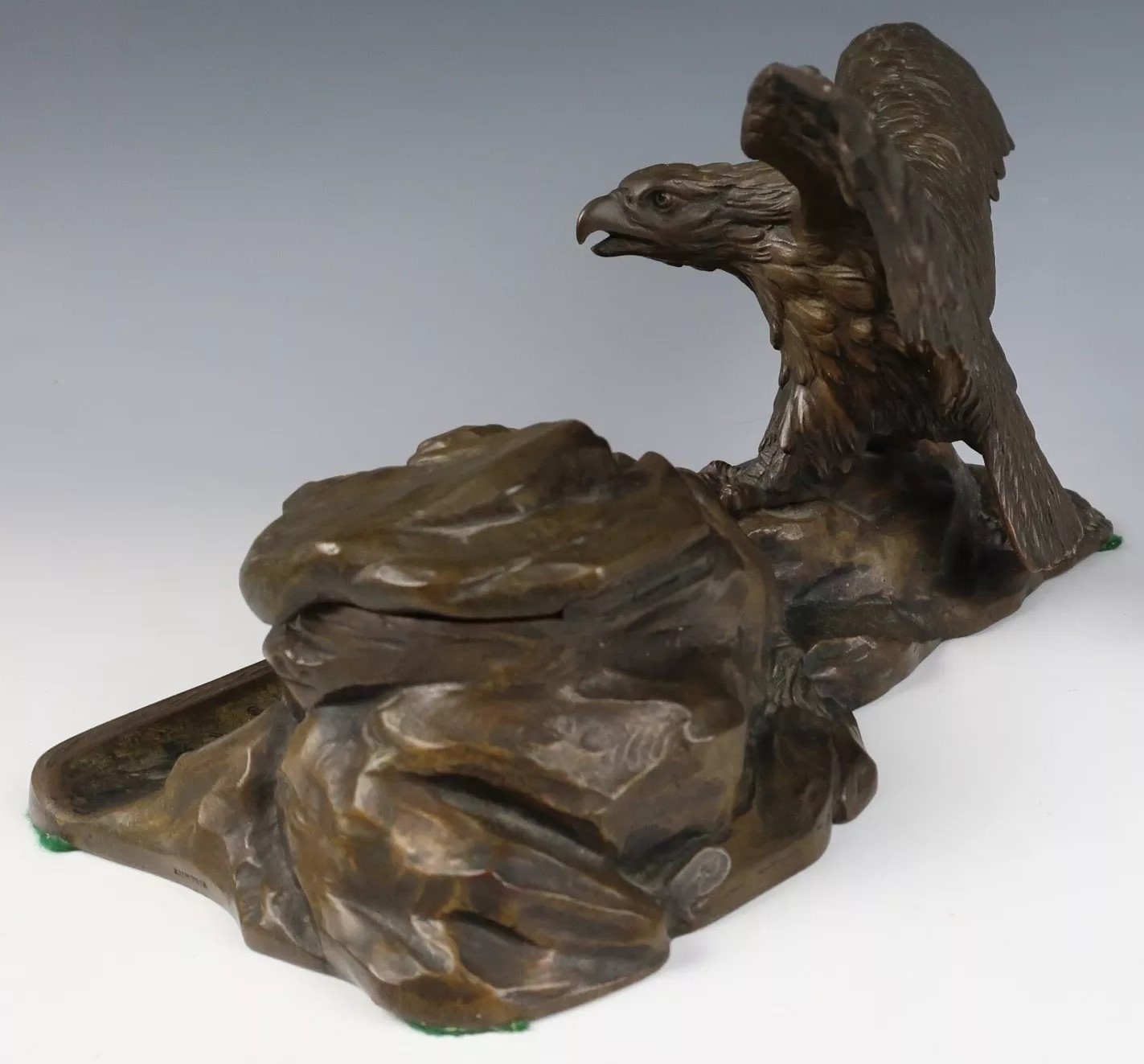 An eagle with outstretched wings is perched atop a rocky formation which holds the inkwell.