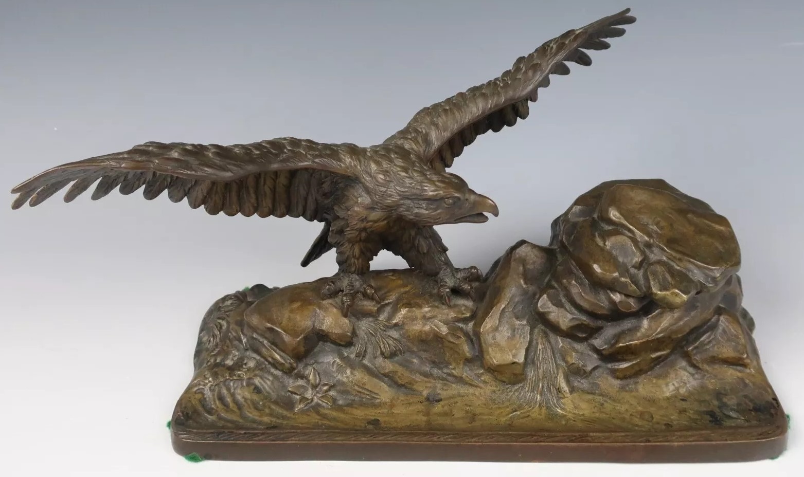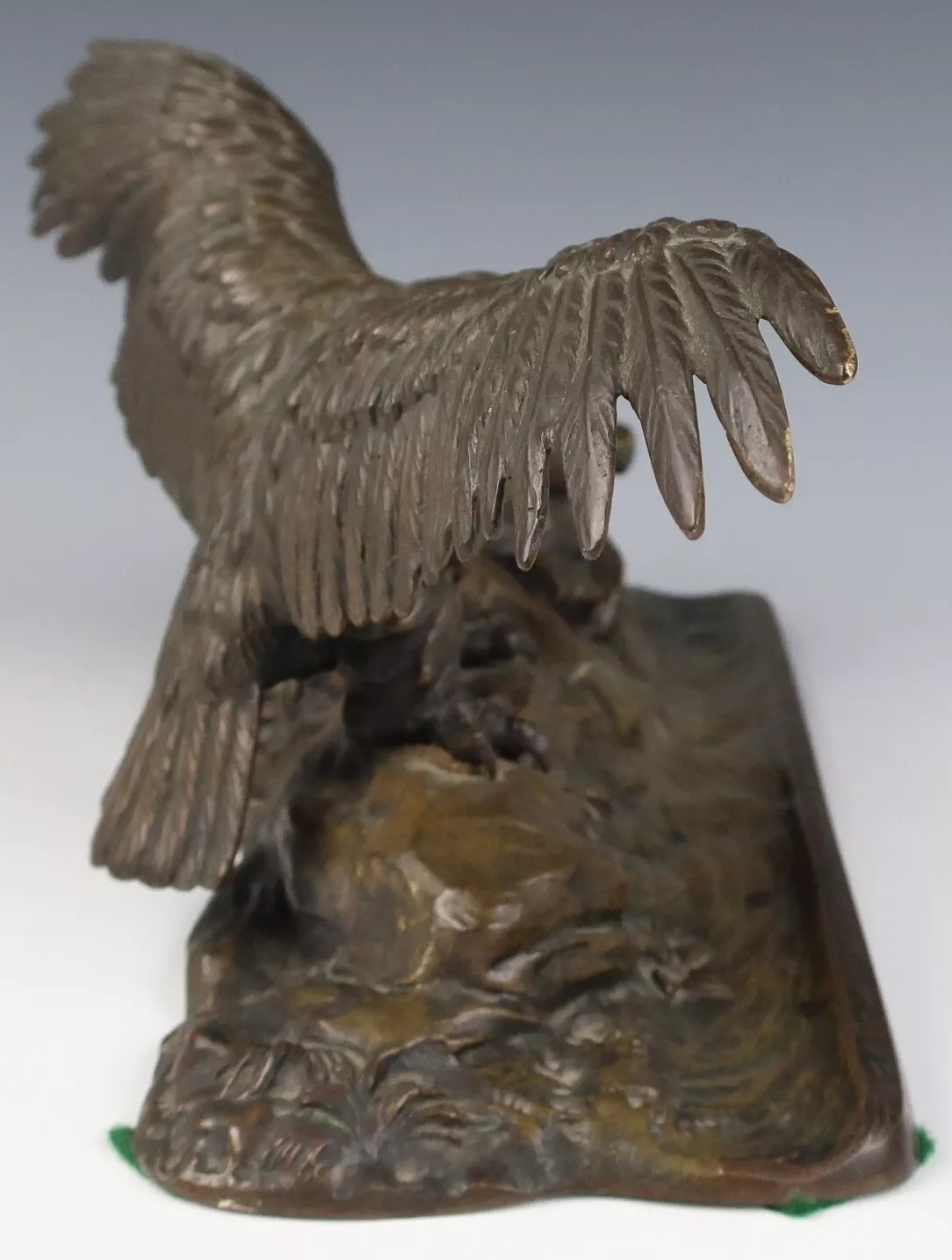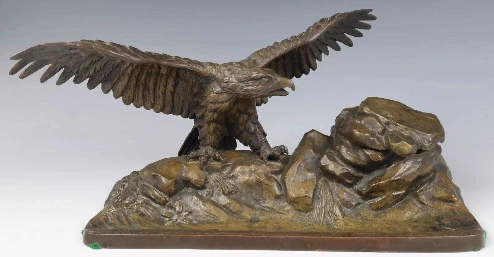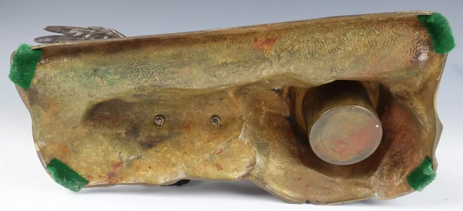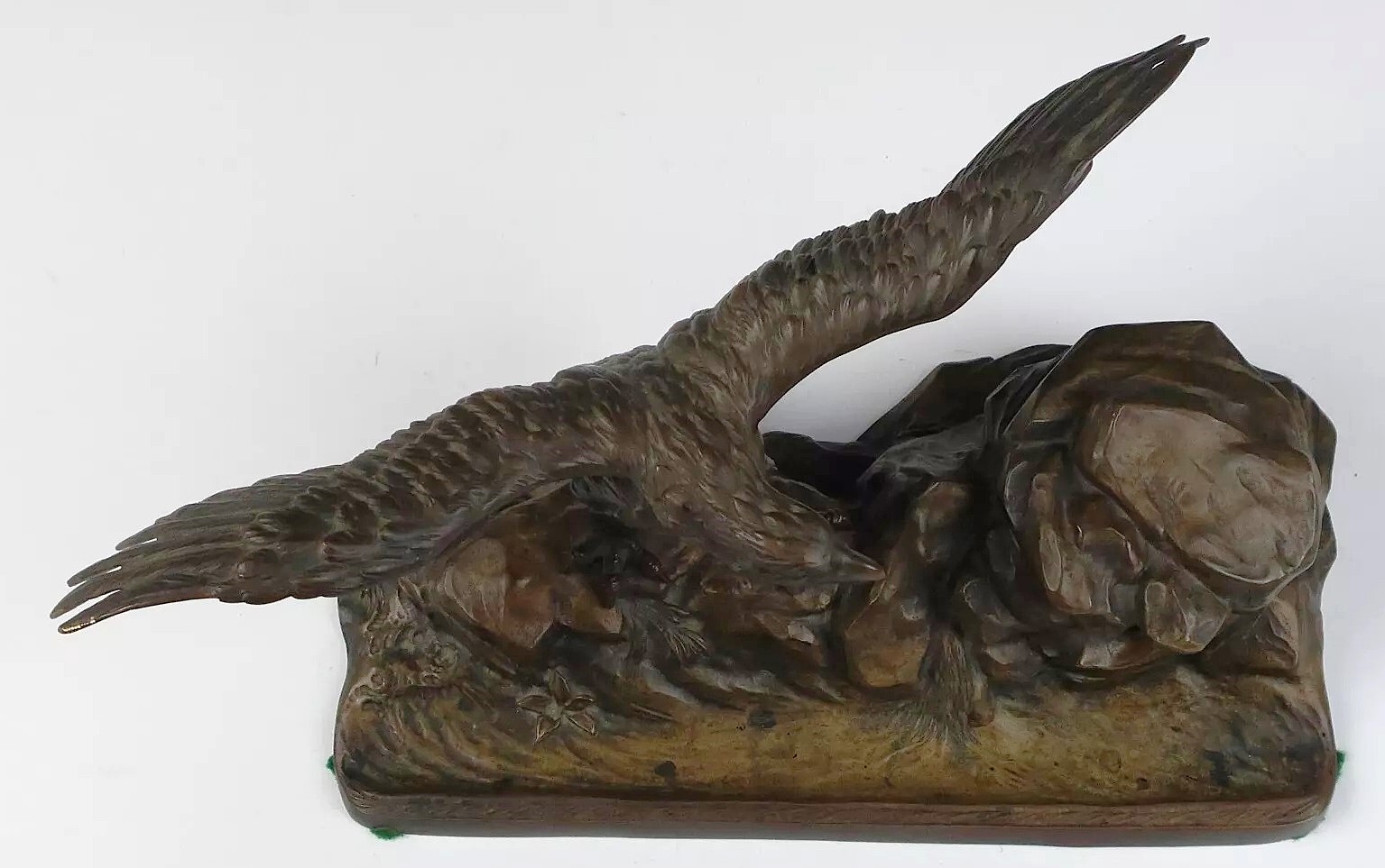 An eagle with outstretched wings is perched atop a rocky formation which holds the inkwell.