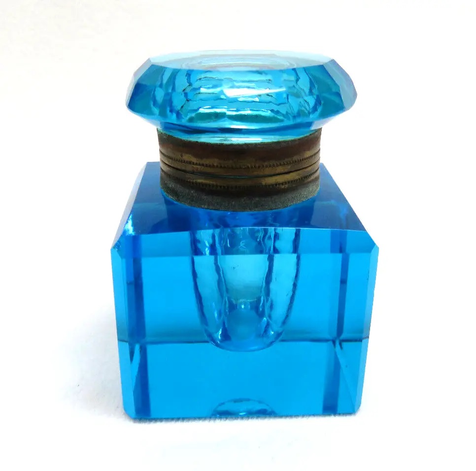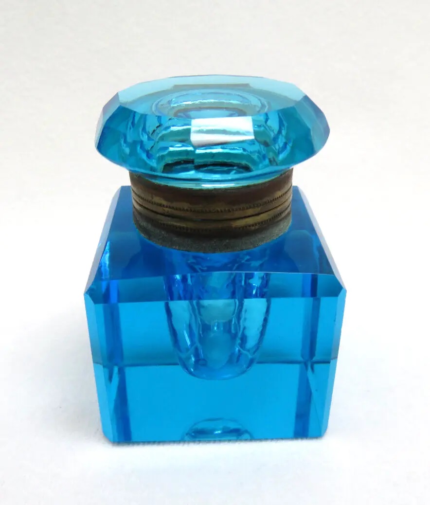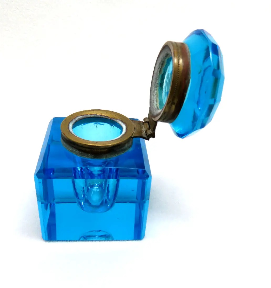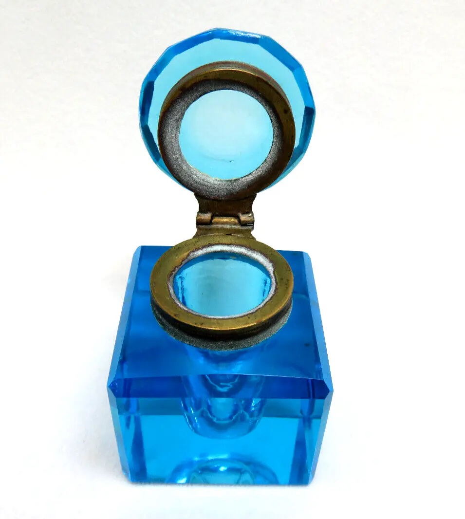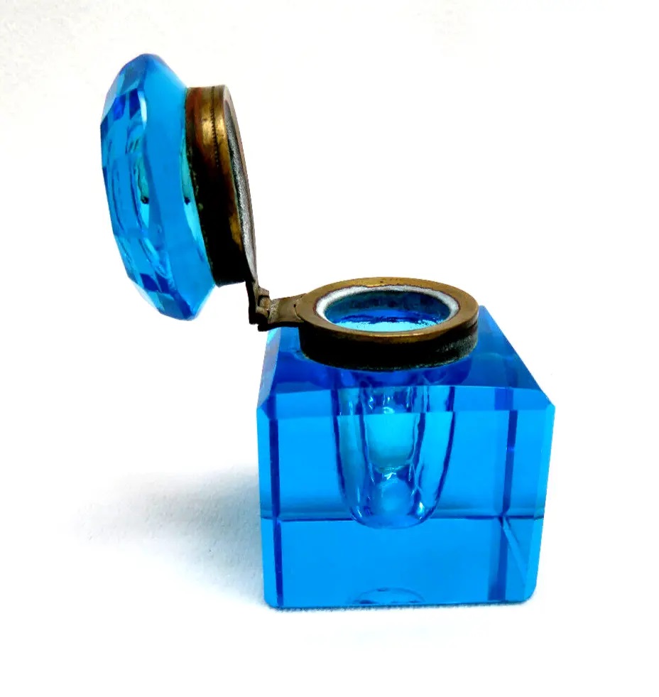 Hand-blown and cut crystal inkwell with faceted square body and cushion-shaped top with hinged brass mounts.