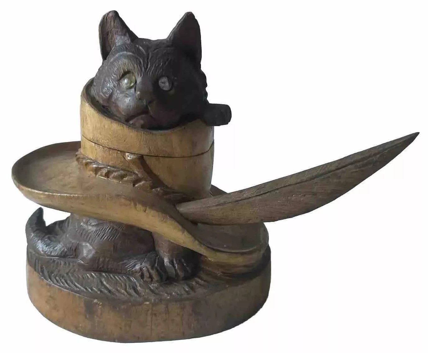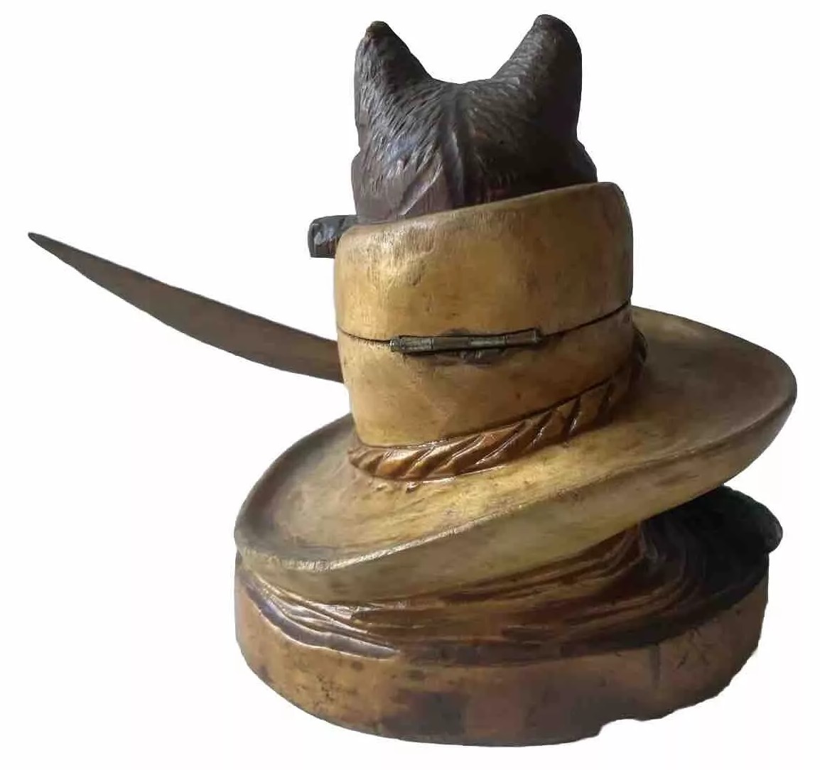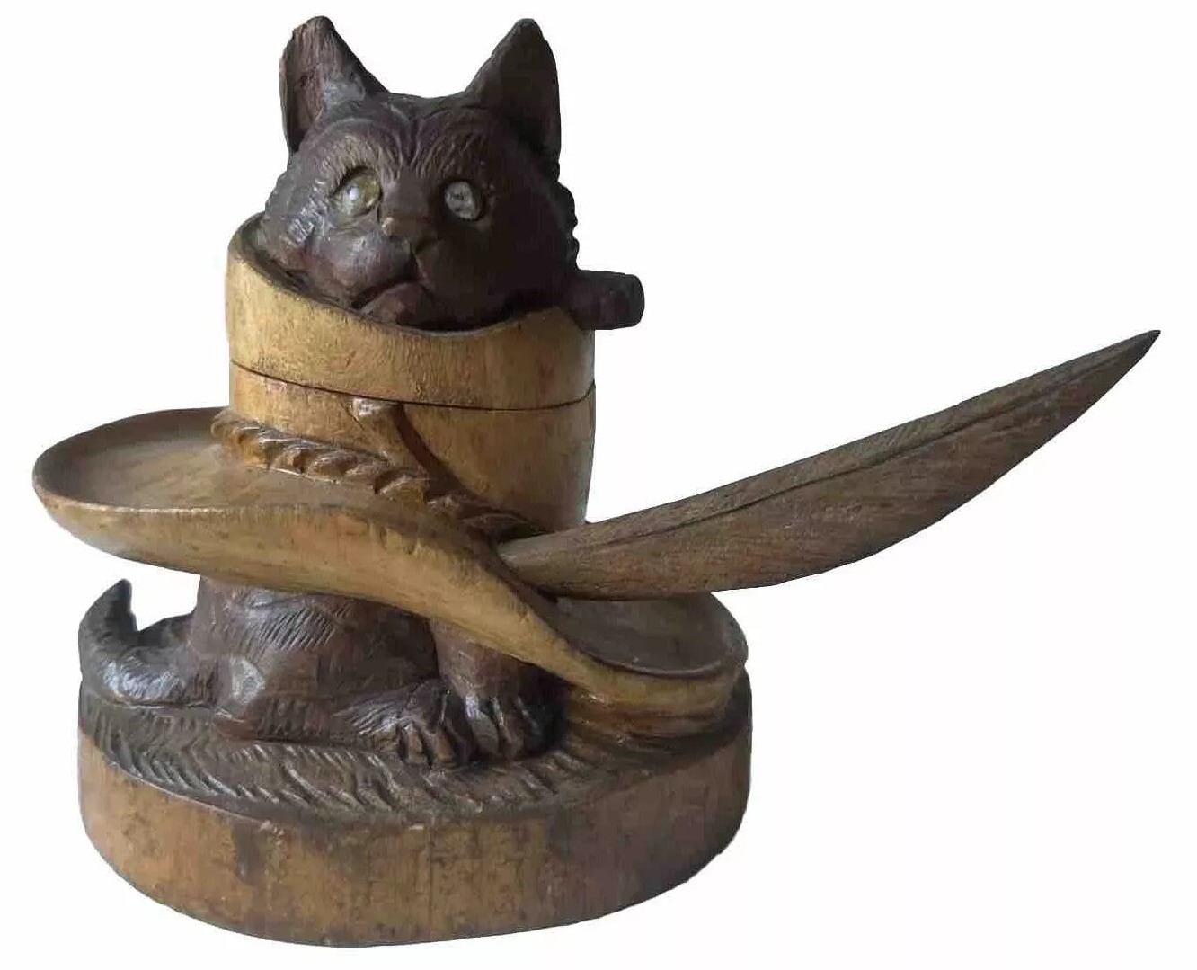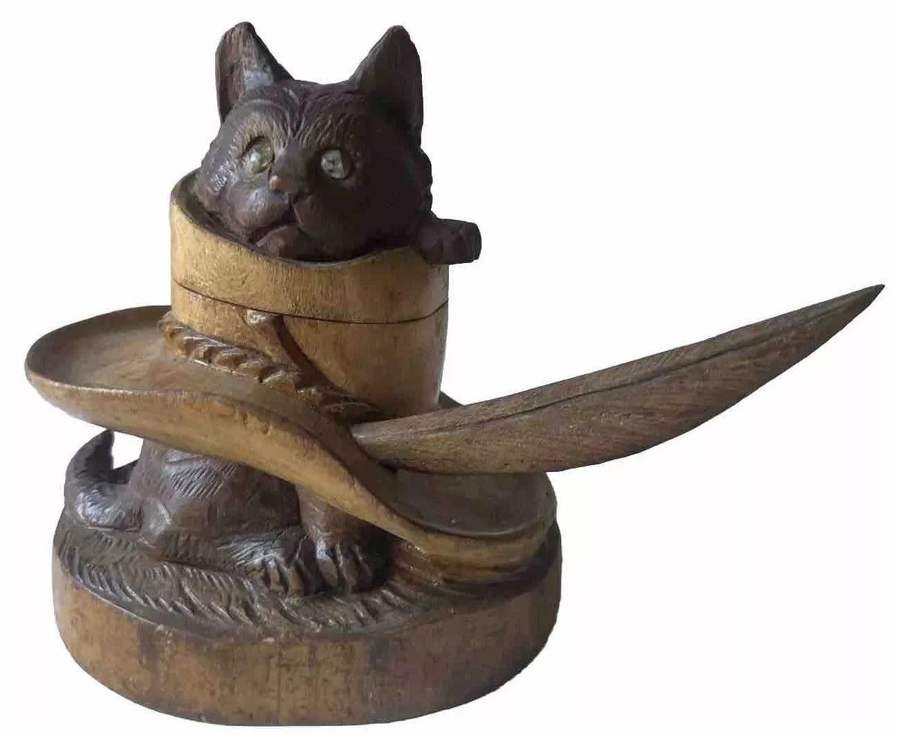 Example #2: This hand-carved Black Forest inkwell features a cat with expressive glass eyes, popping out of a hat. The cat’s head is intricately detailed, with carved fur that adds to its lifelike appearance. The hat, which forms the main body of the inkwell, has a brim that wraps around the cat, and there’s a feather quill resting on the brim.