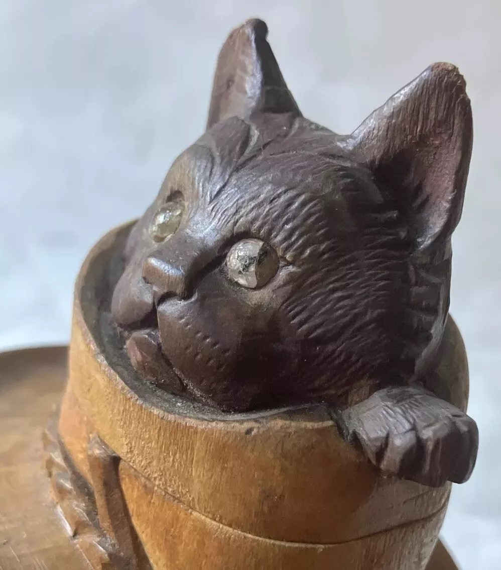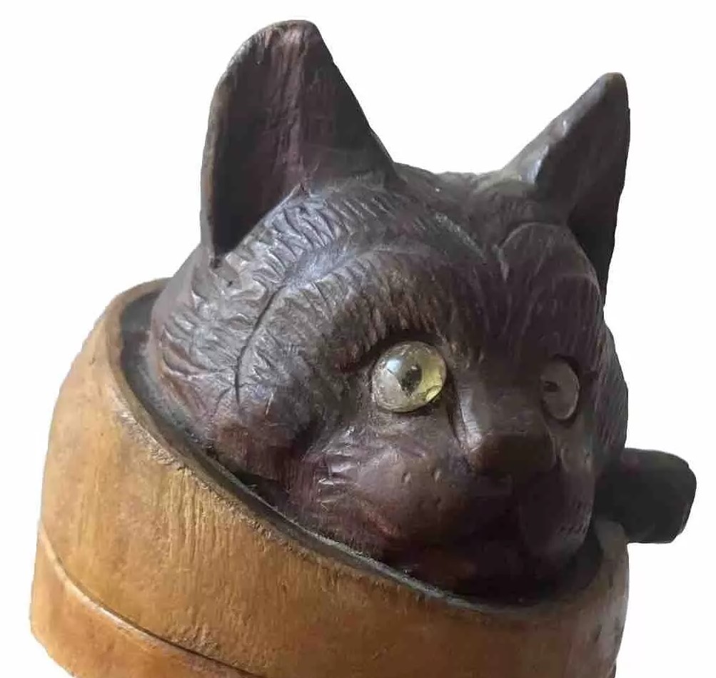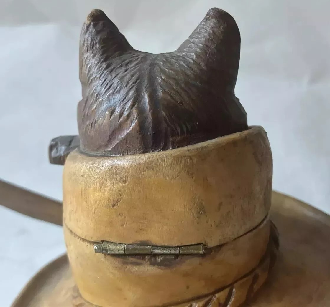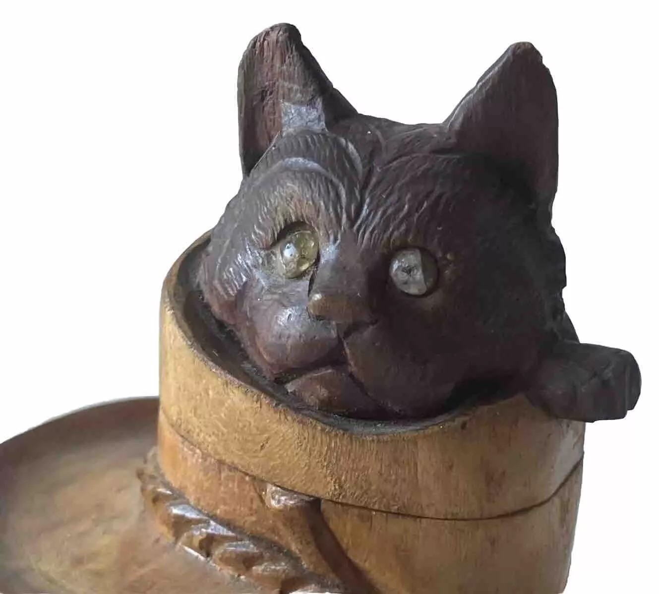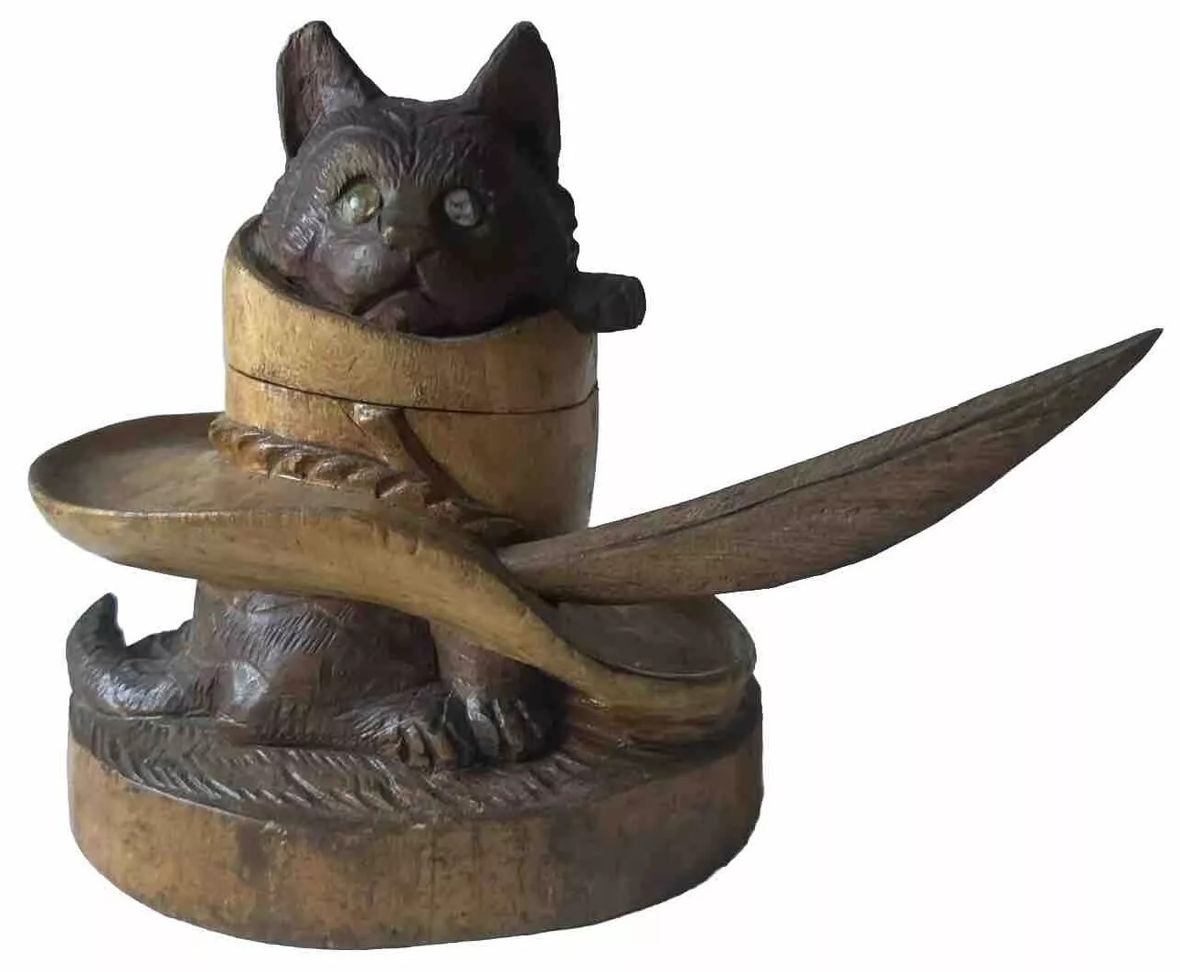 Example #2: This hand-carved Black Forest inkwell features a cat with expressive glass eyes, popping out of a hat. The cat’s head is intricately detailed, with carved fur that adds to its lifelike appearance. The hat, which forms the main body of the inkwell, has a brim that wraps around the cat, and there’s a feather quill resting on the brim.