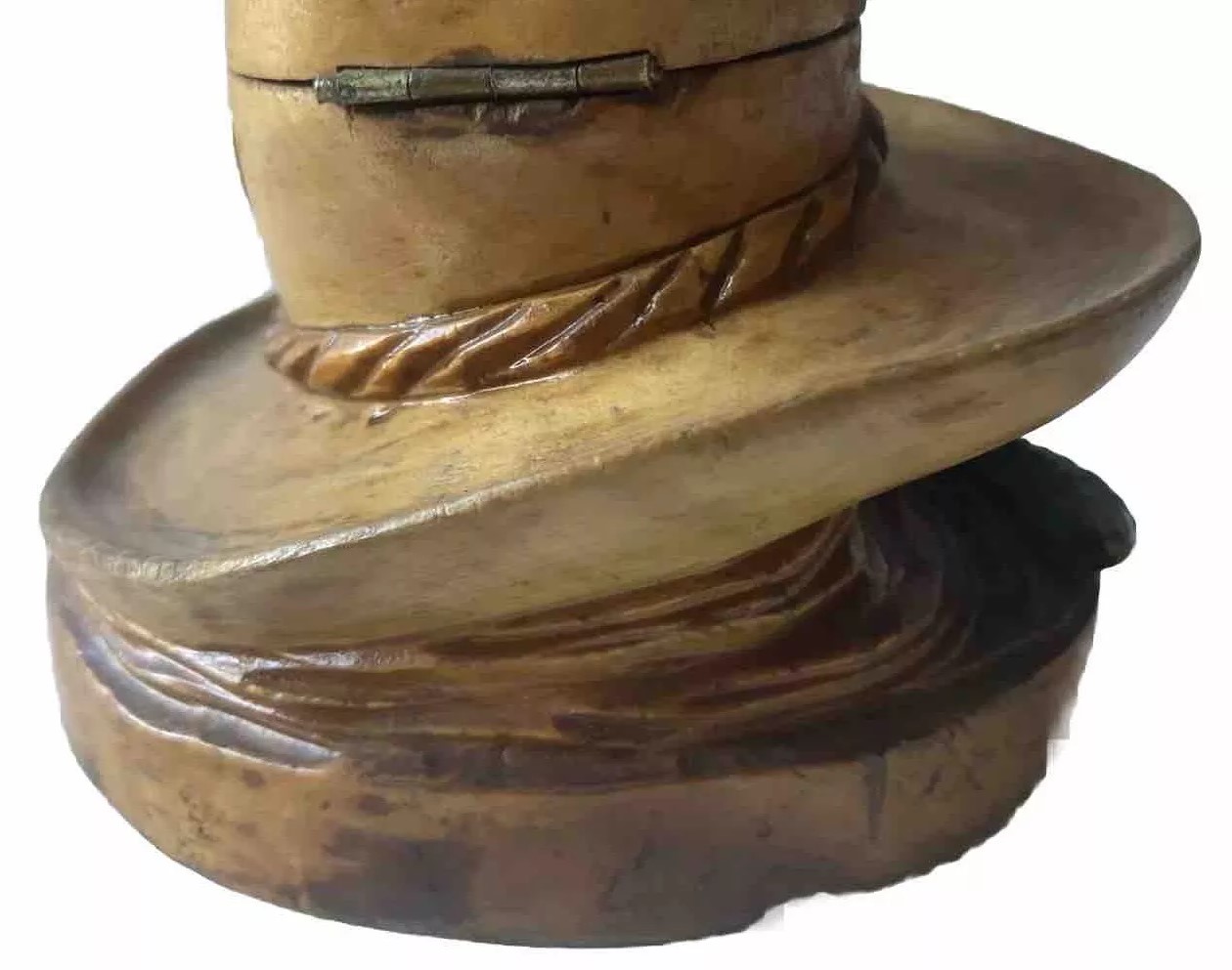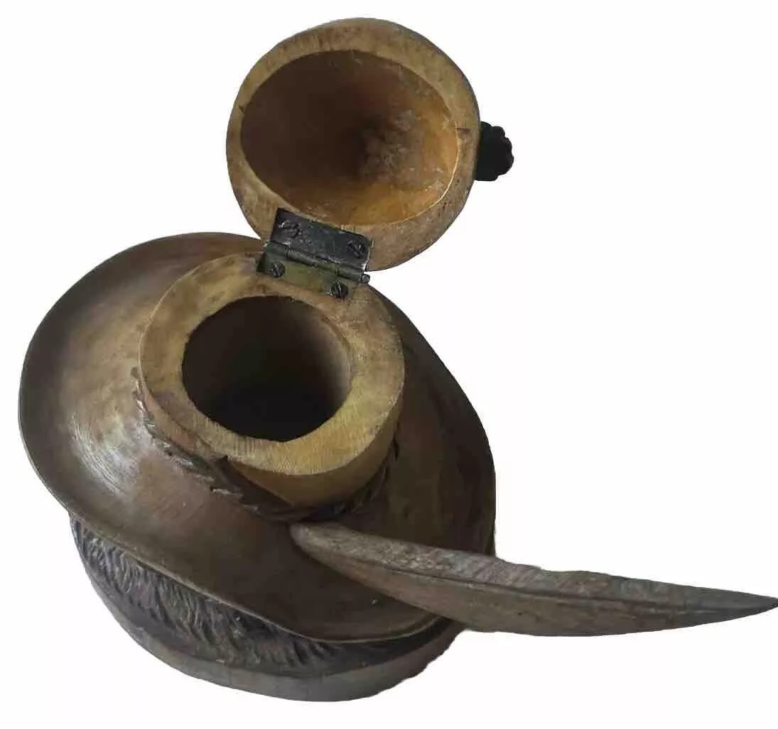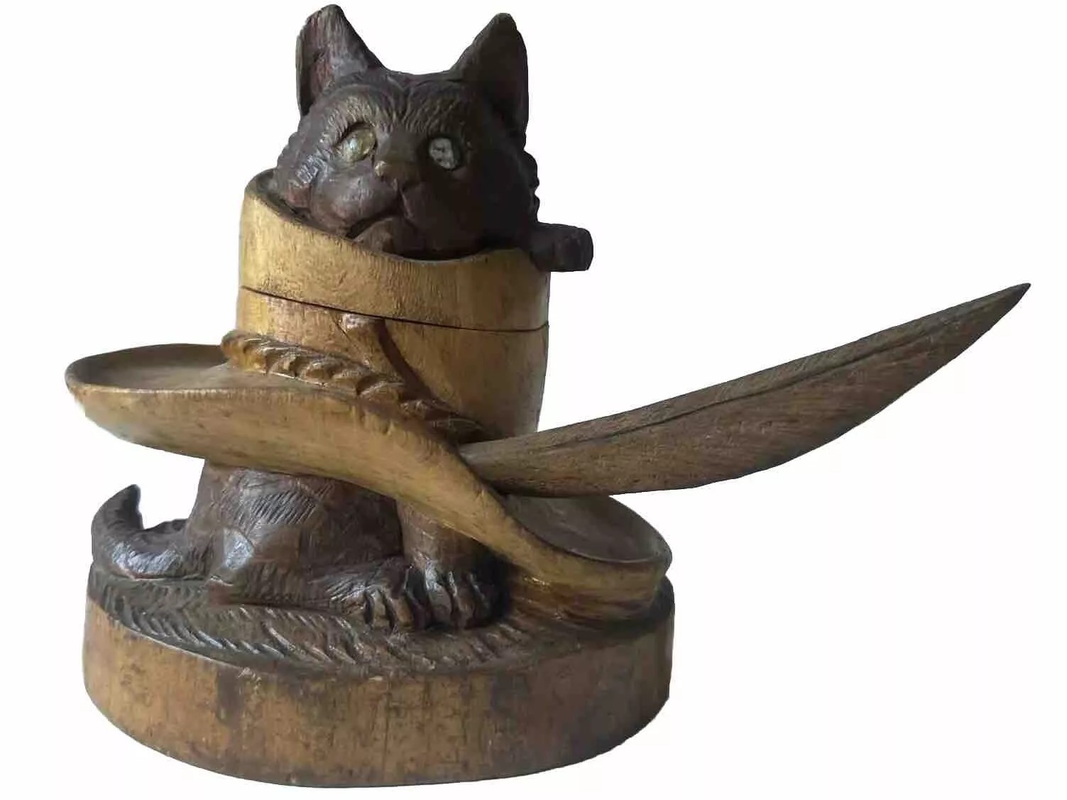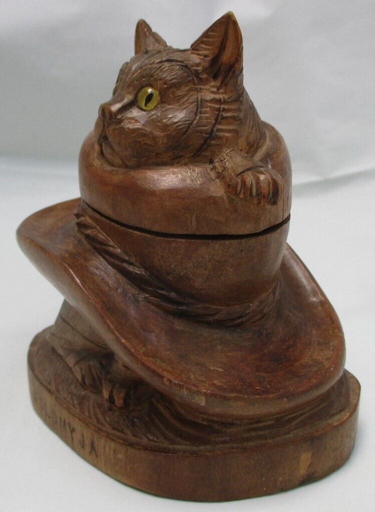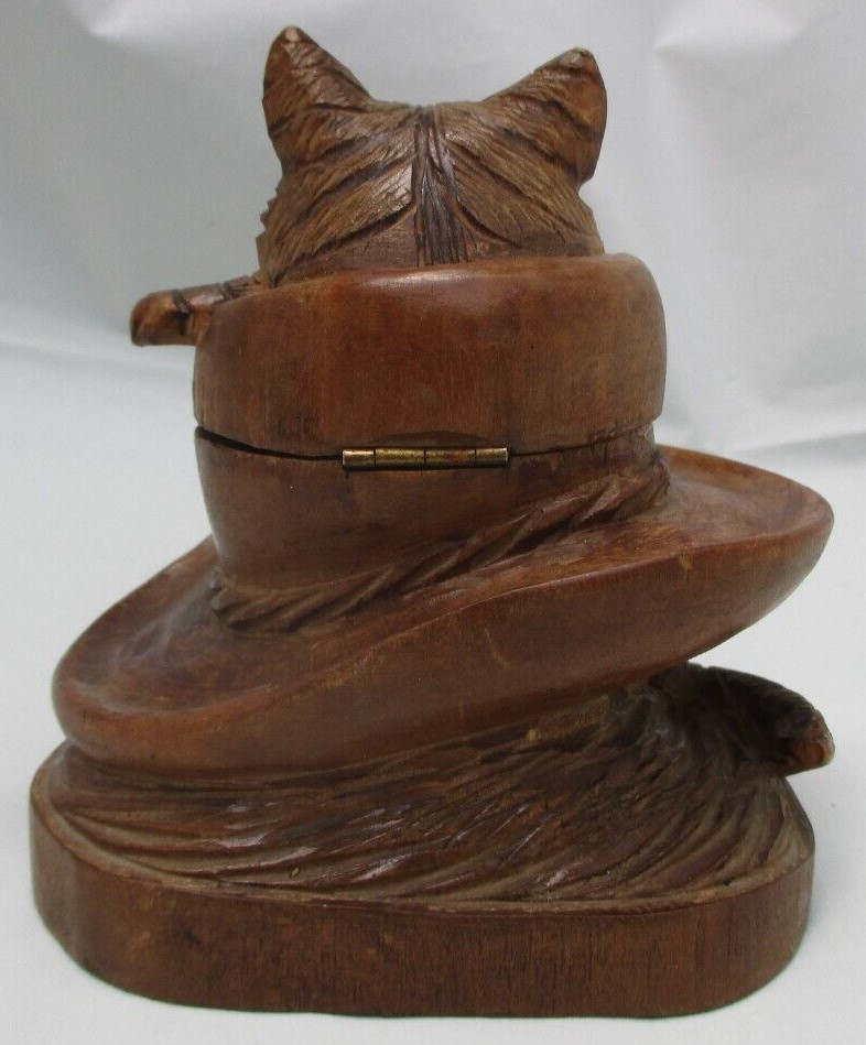 Example #2: This hand-carved Black Forest inkwell features a cat with expressive glass eyes, popping out of a hat. The cat’s head is intricately detailed, with carved fur that adds to its lifelike appearance. The hat, which forms the main body of the inkwell, has a brim that wraps around the cat, and there’s a feather quill resting on the brim.