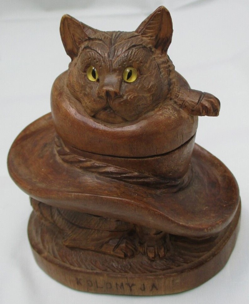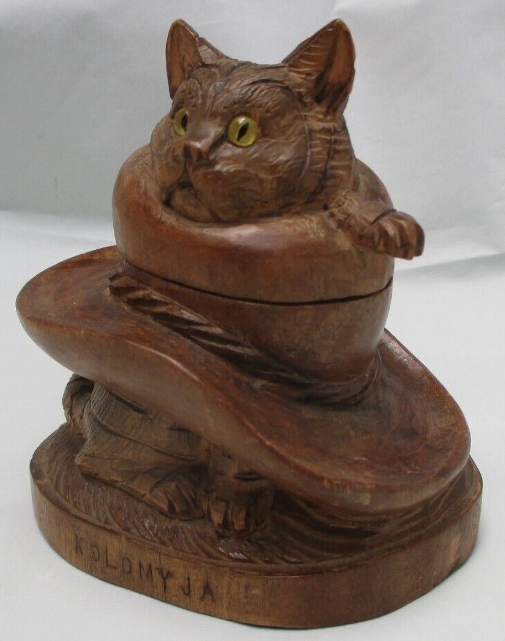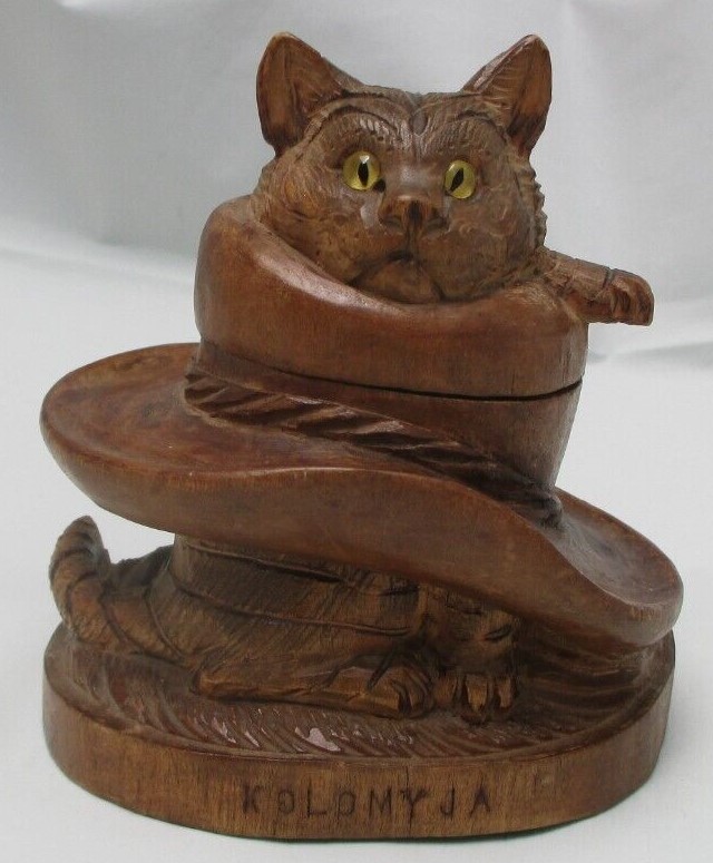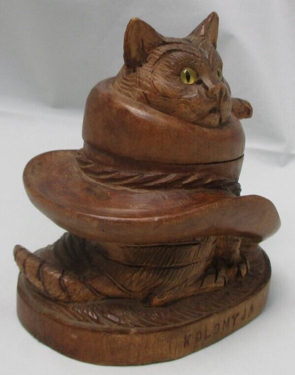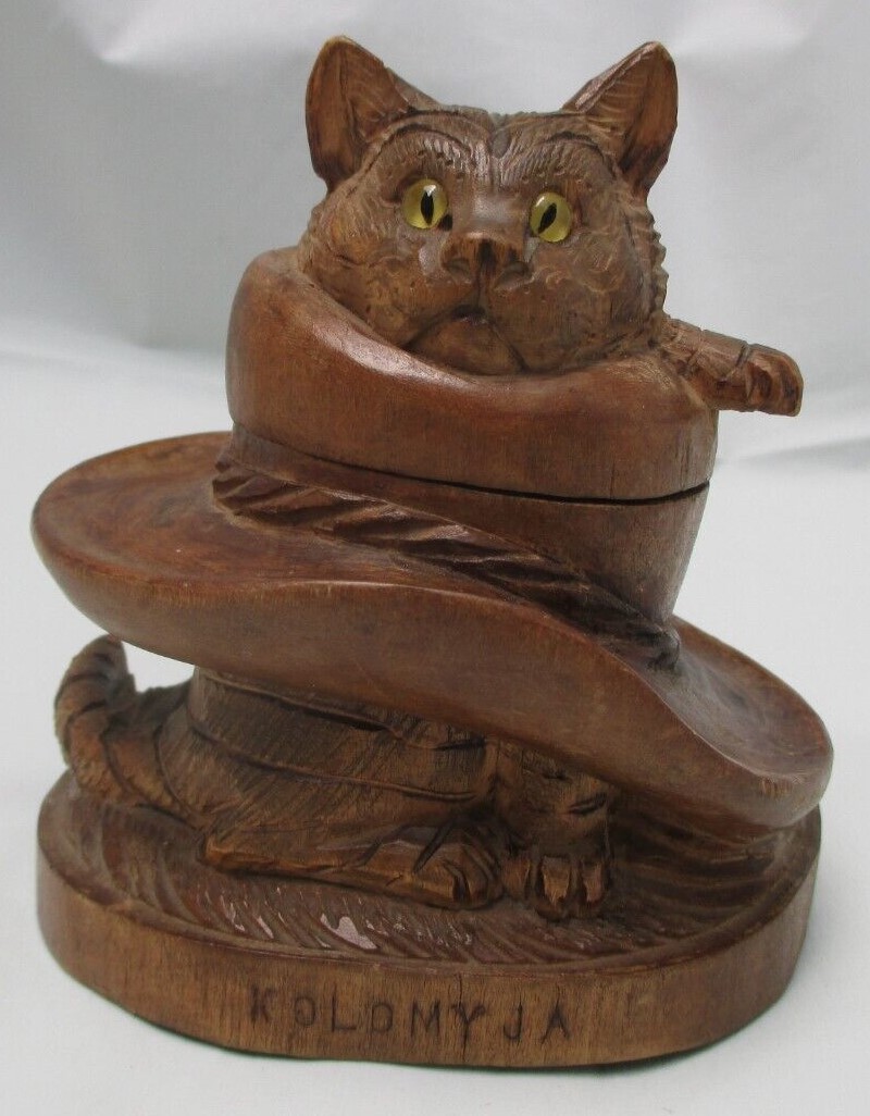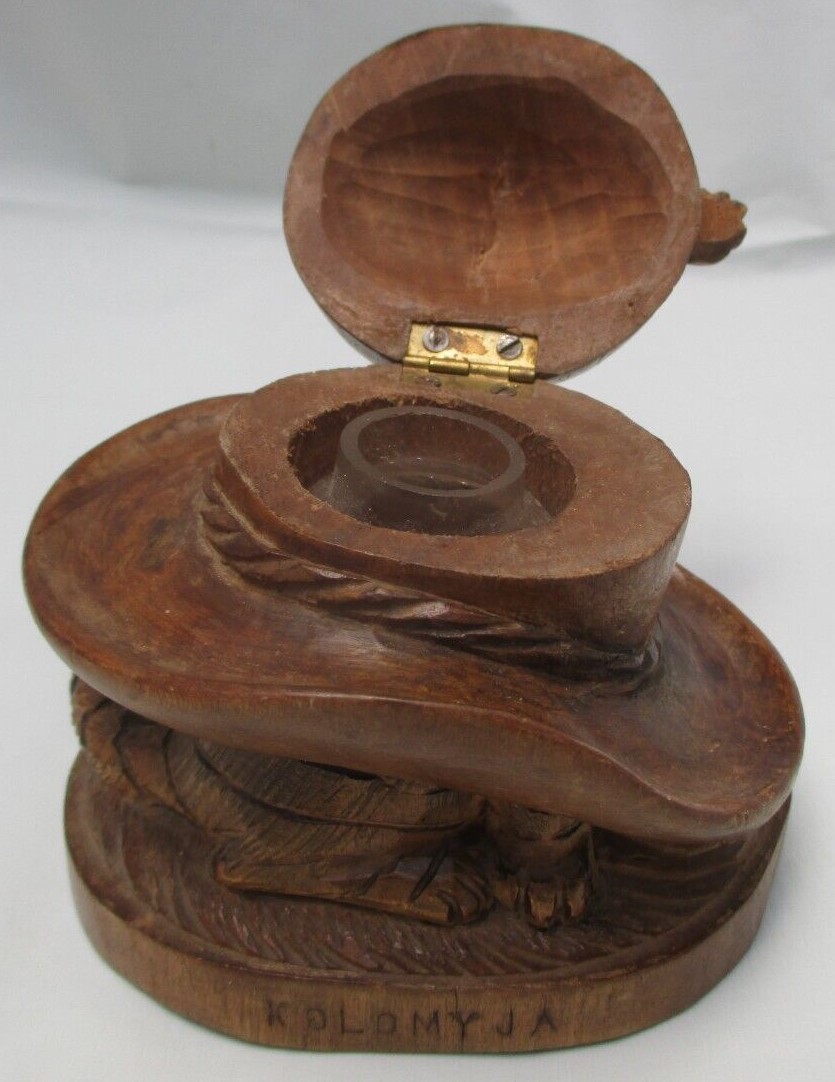 This hand-carved inkwell features a cat with glass eyes, seemingly stuck in a hat. The hat is hinged at the top allowing access to the glass inkwell inside. The craftsmanship showcases detailed wood carving, mimicking fur and fabric folds. On the base, the word “Kolmyja” is carved. Kolmyja is a city in Ukraine.