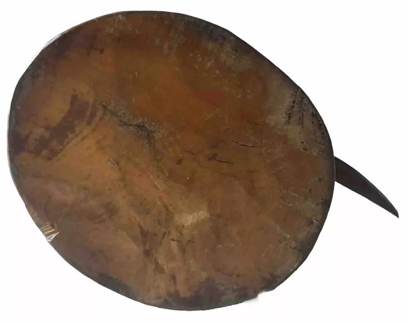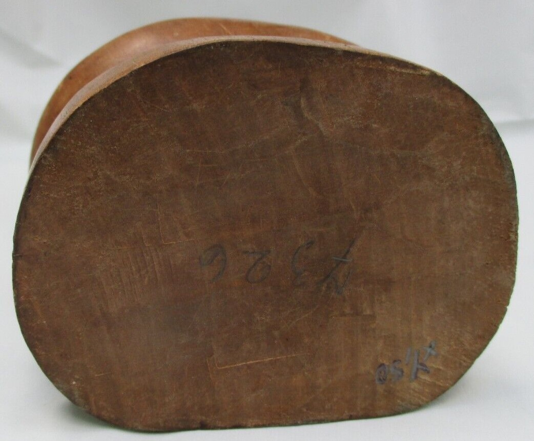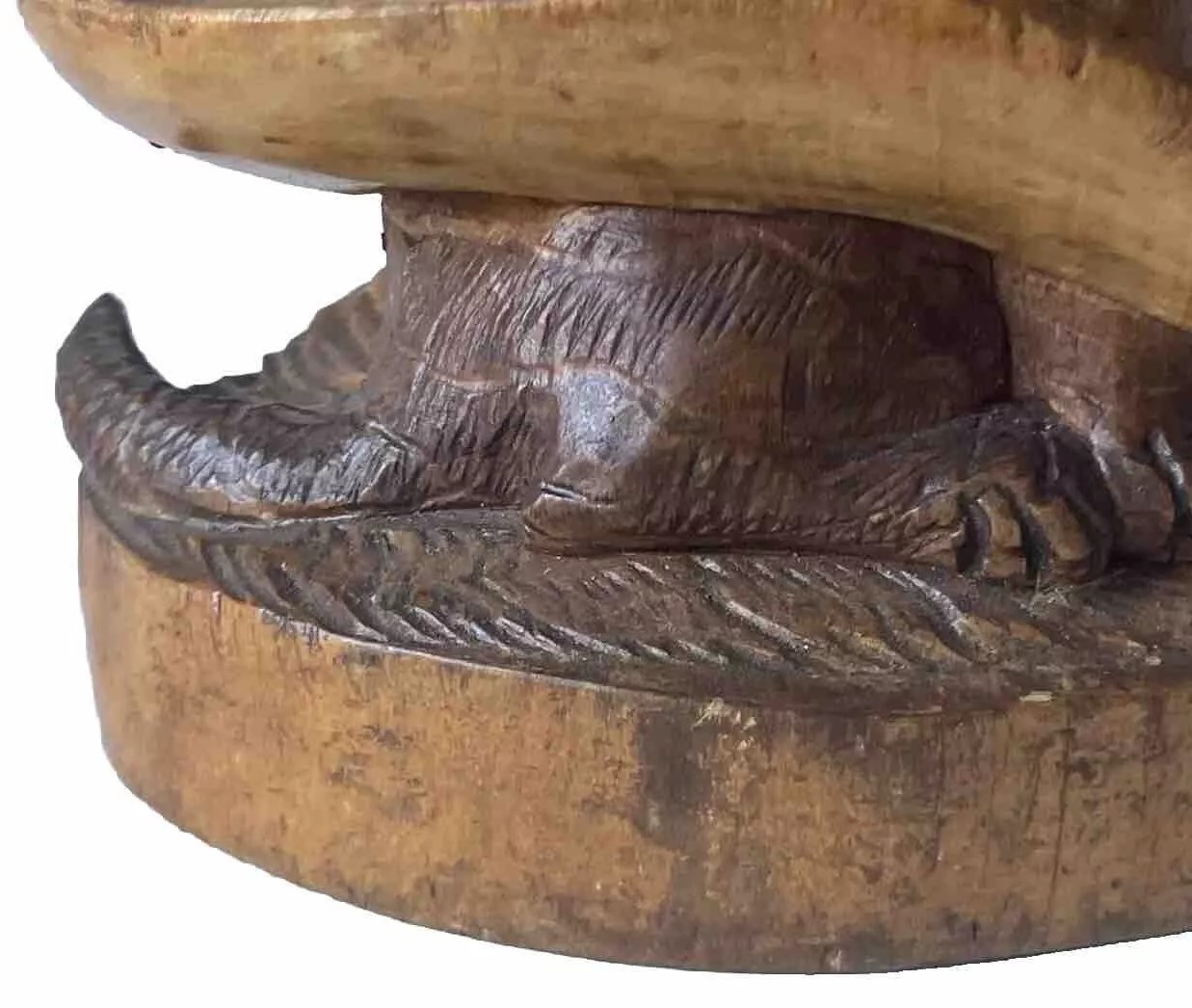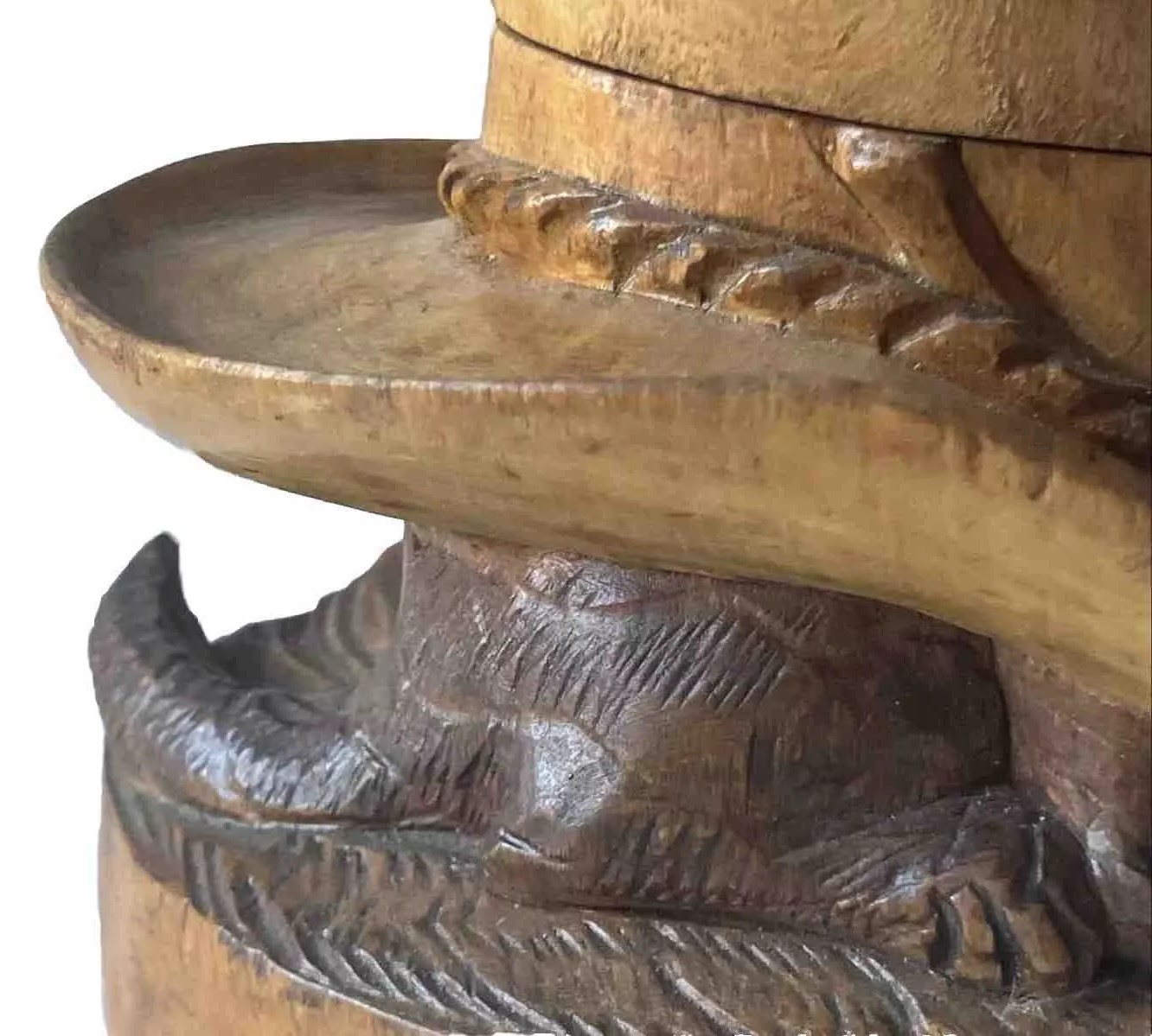 This hand-carved inkwell features a cat with glass eyes, seemingly stuck in a hat. The hat is hinged at the top allowing access to the glass inkwell inside. The craftsmanship showcases detailed wood carving, mimicking fur and fabric folds. On the base, the word “Kolmyja” is carved. Kolmyja is a city in Ukraine.