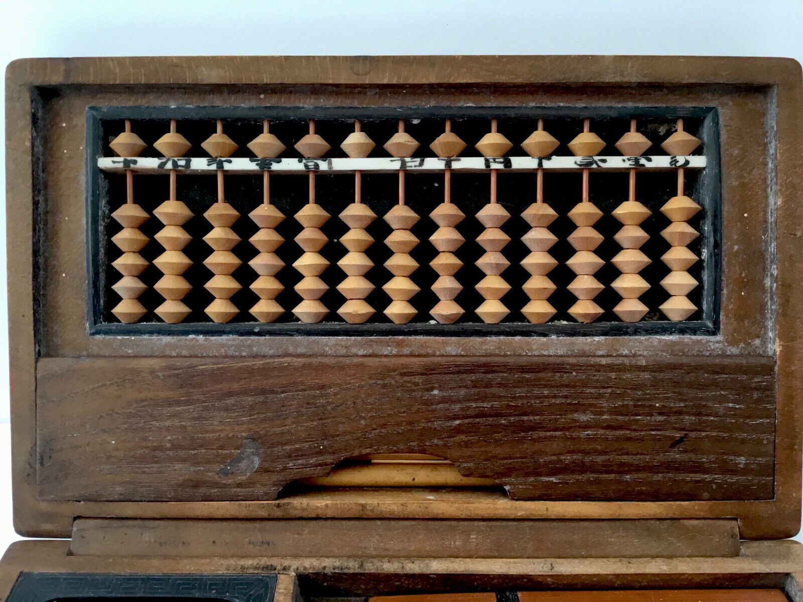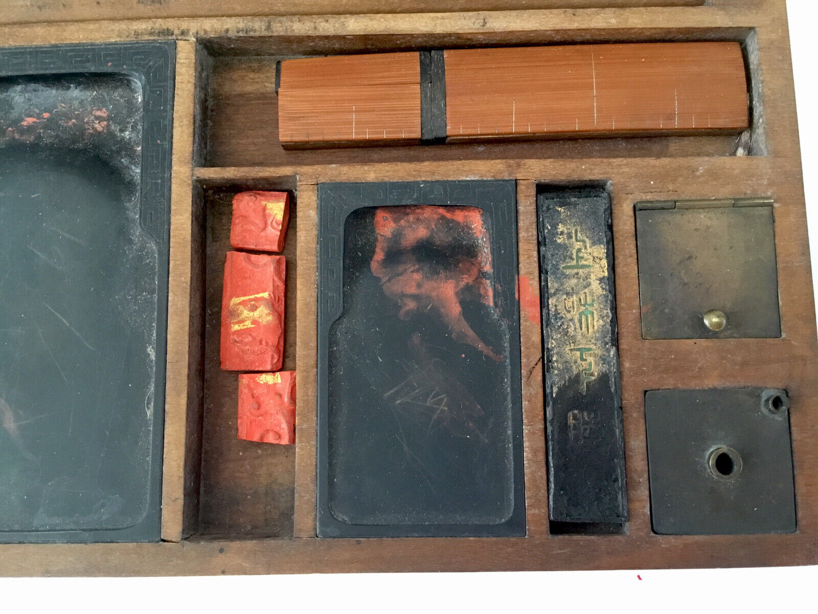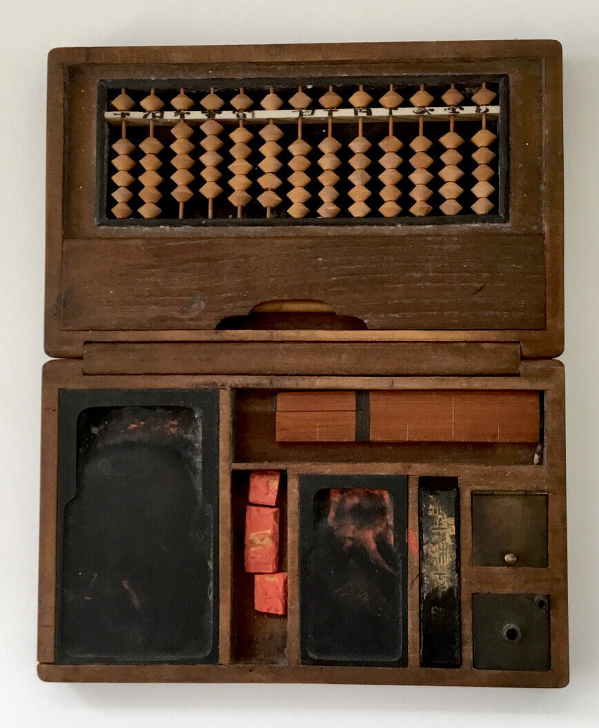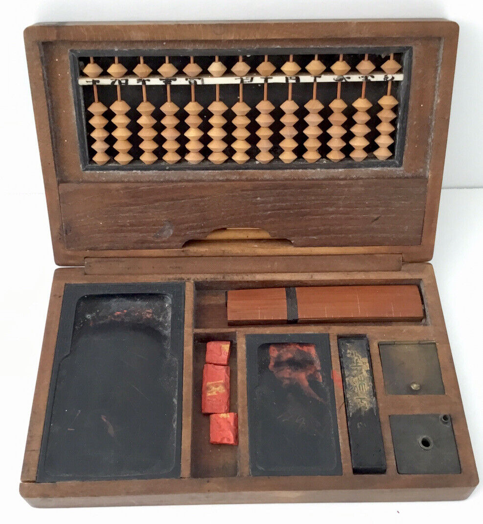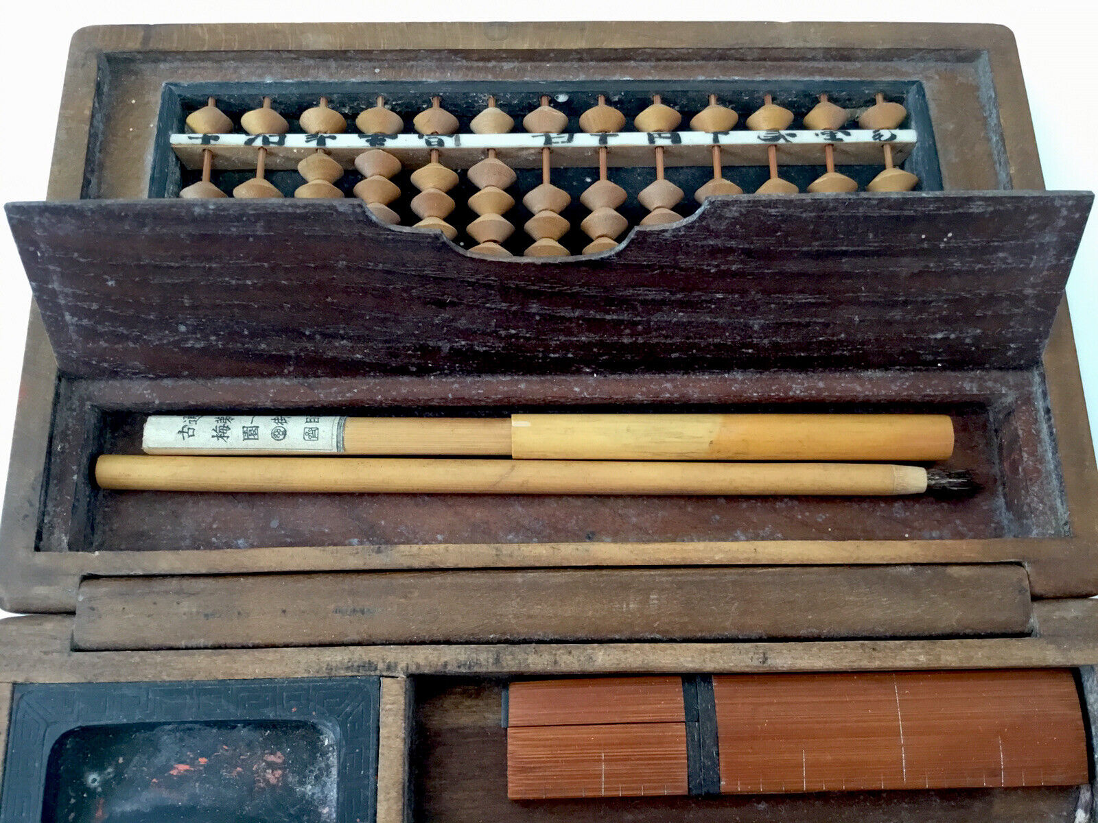 Antique Japanese calligraphy set with abacus, brass inkwell, holder, ink stone, brushes, seals in a wooden travel box.