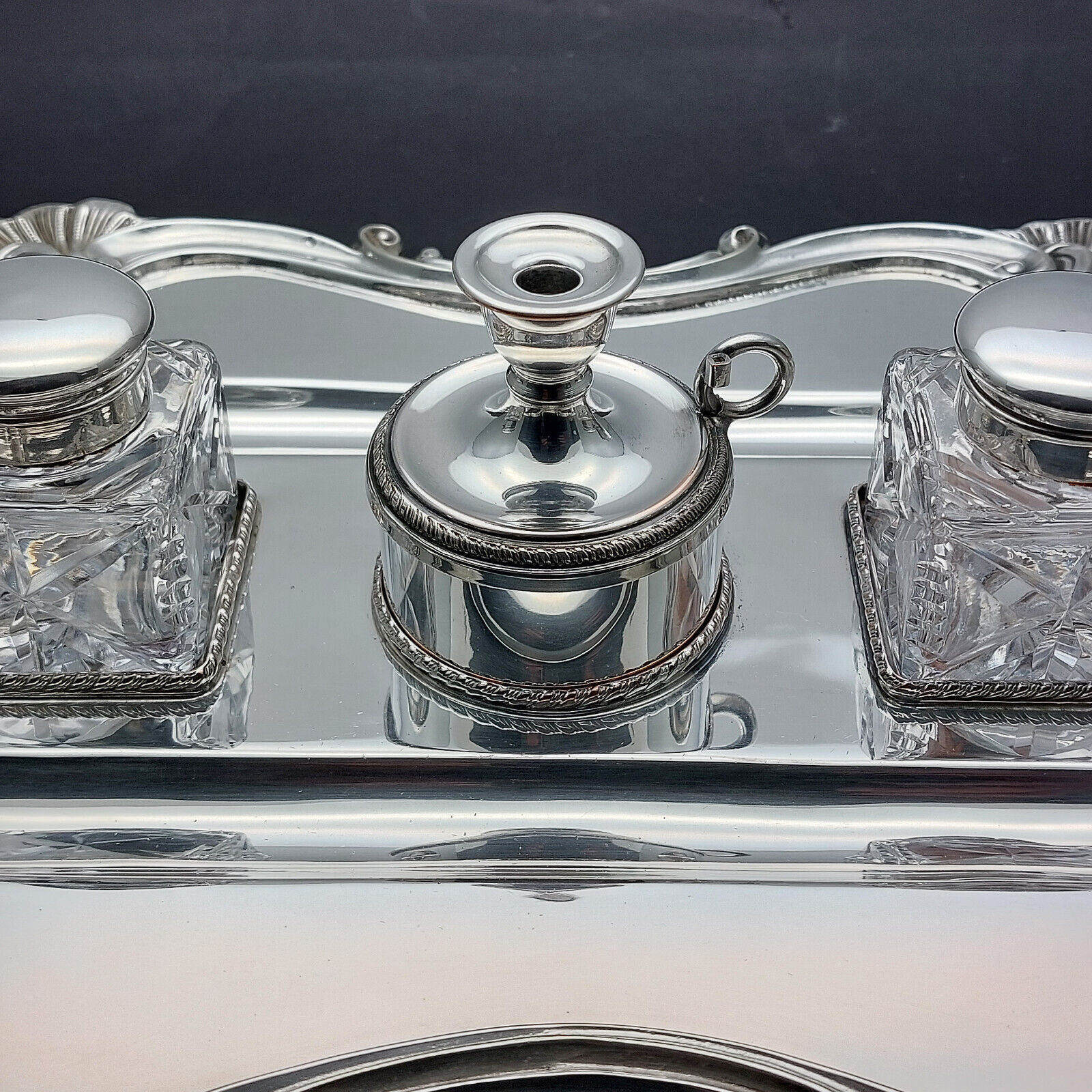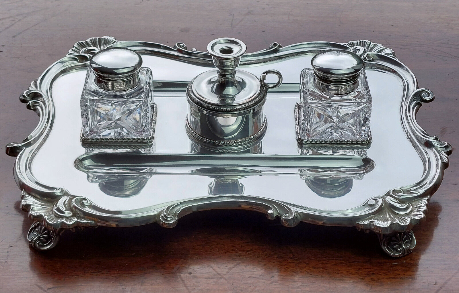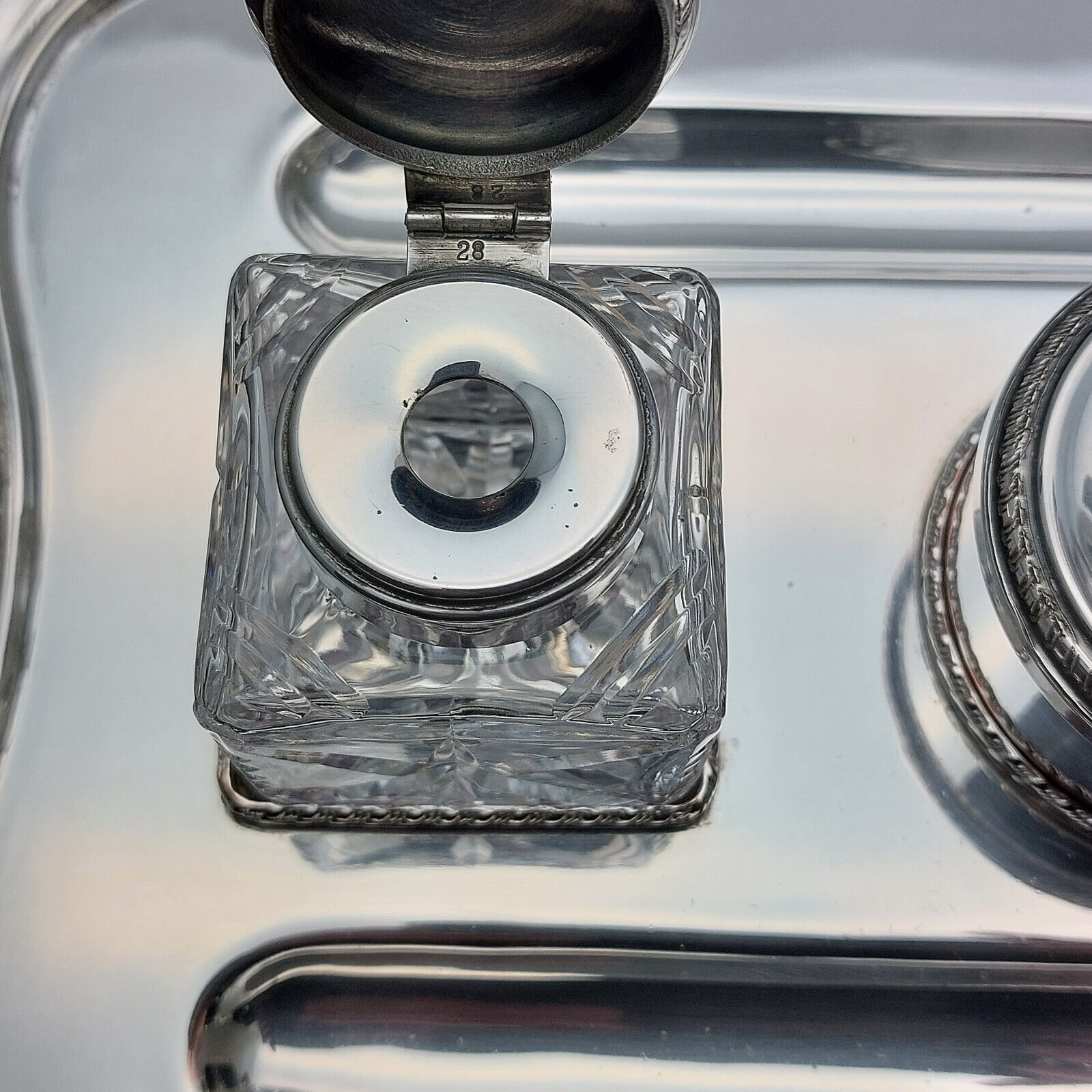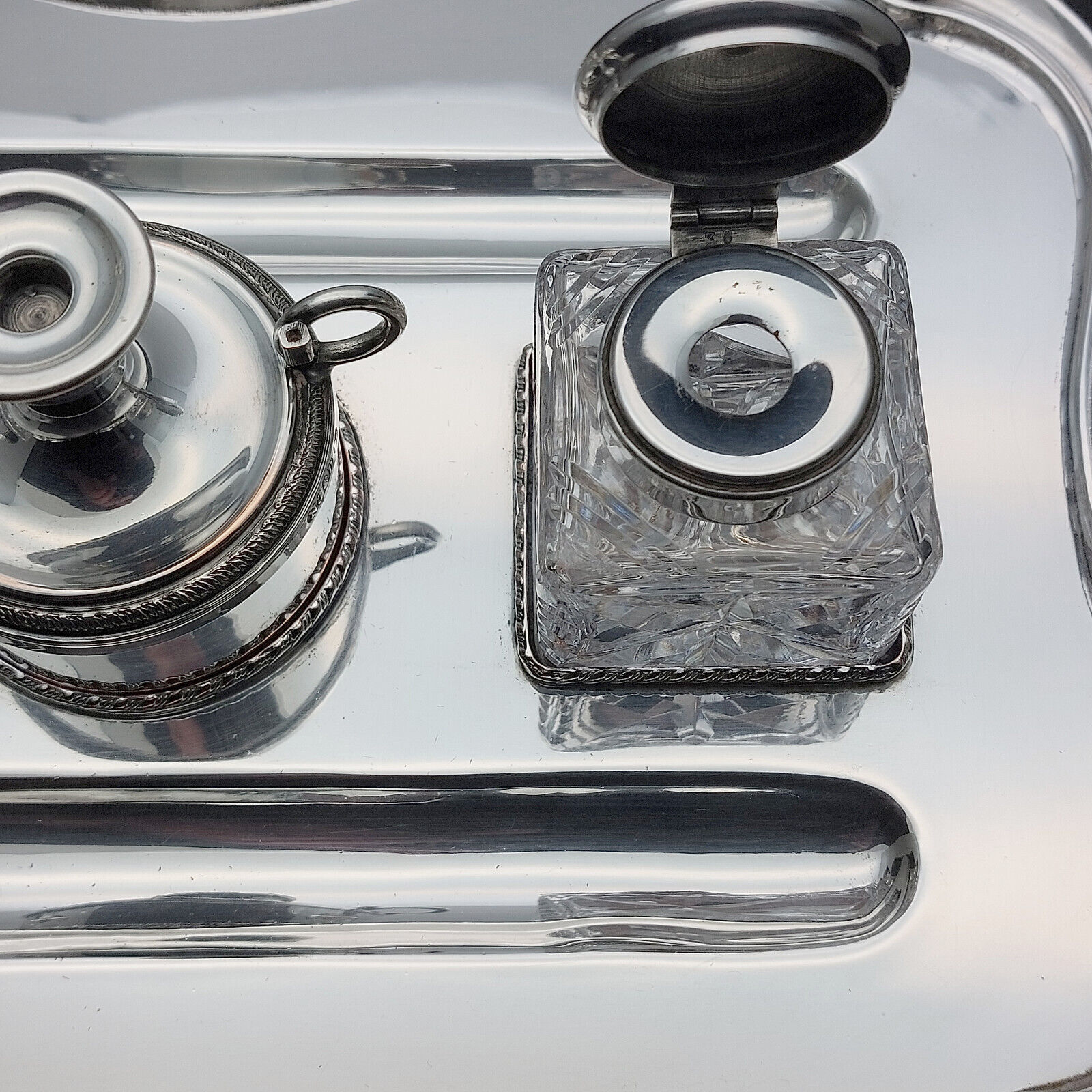Condition: Stand is gleaming silver with some very minor surface marks, no dents. Glass is fine (some tiny fleabites only) with some very minor ink residue. Both wells have some minor marks to their plating at the apertures from use. Missing its snuffer to the candle holder.
