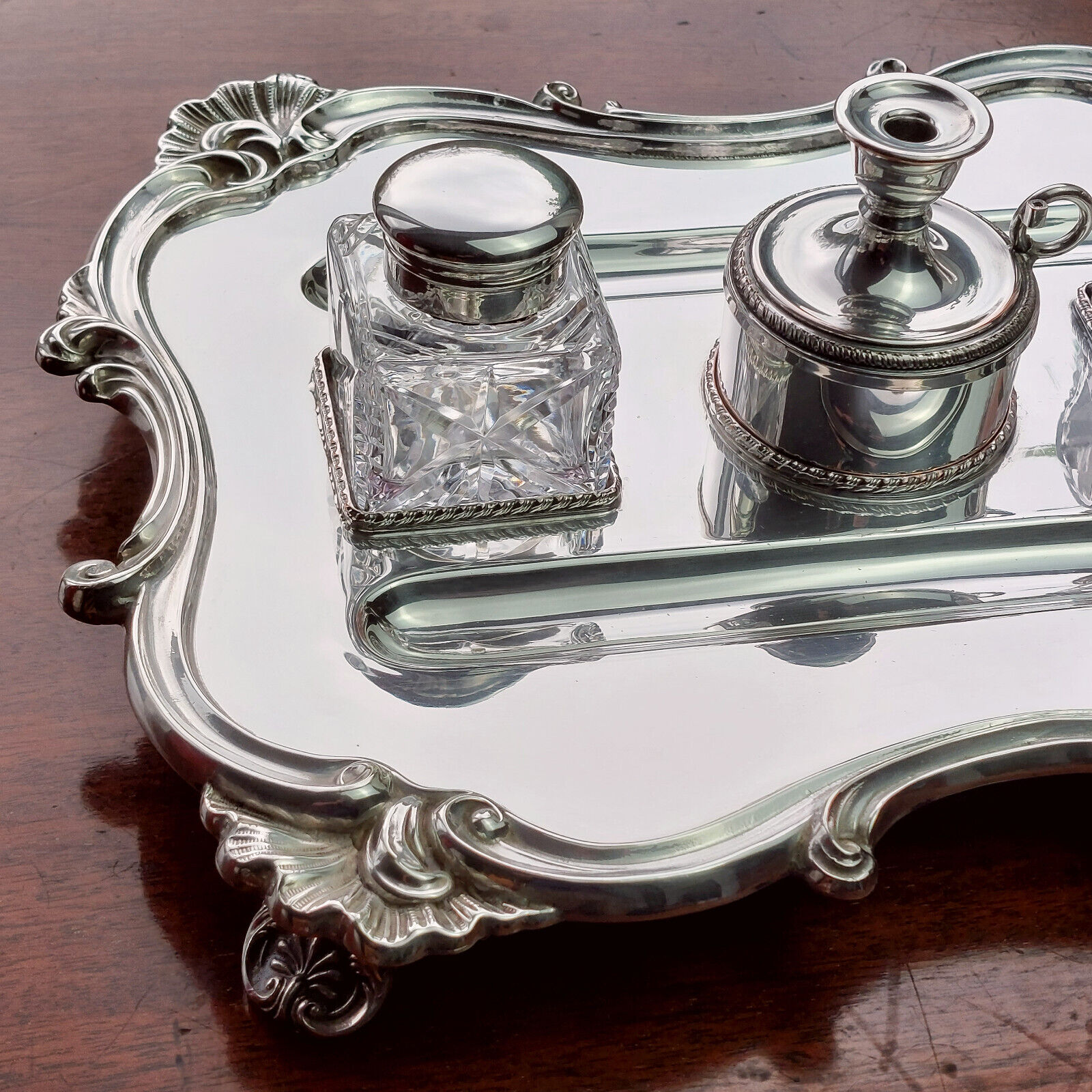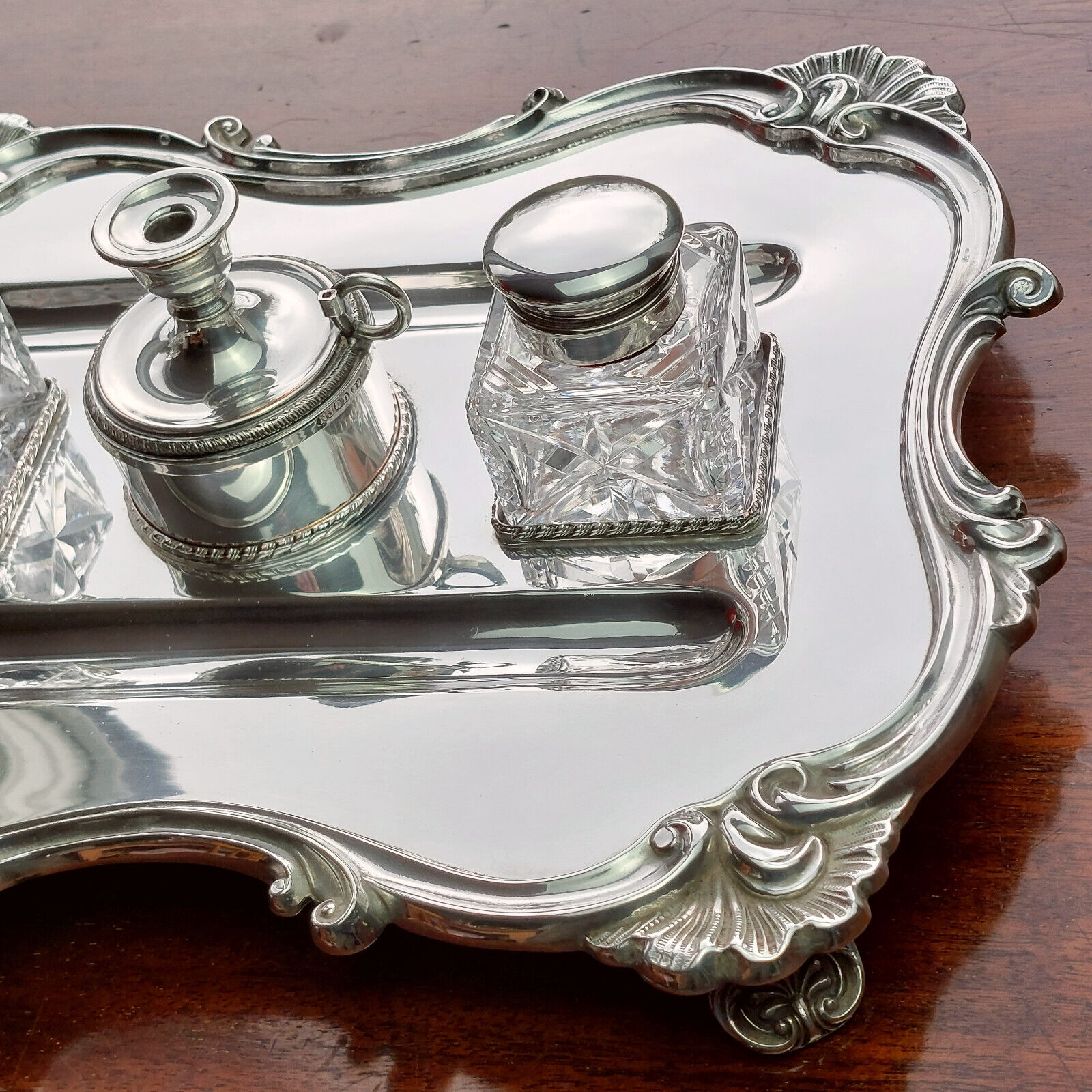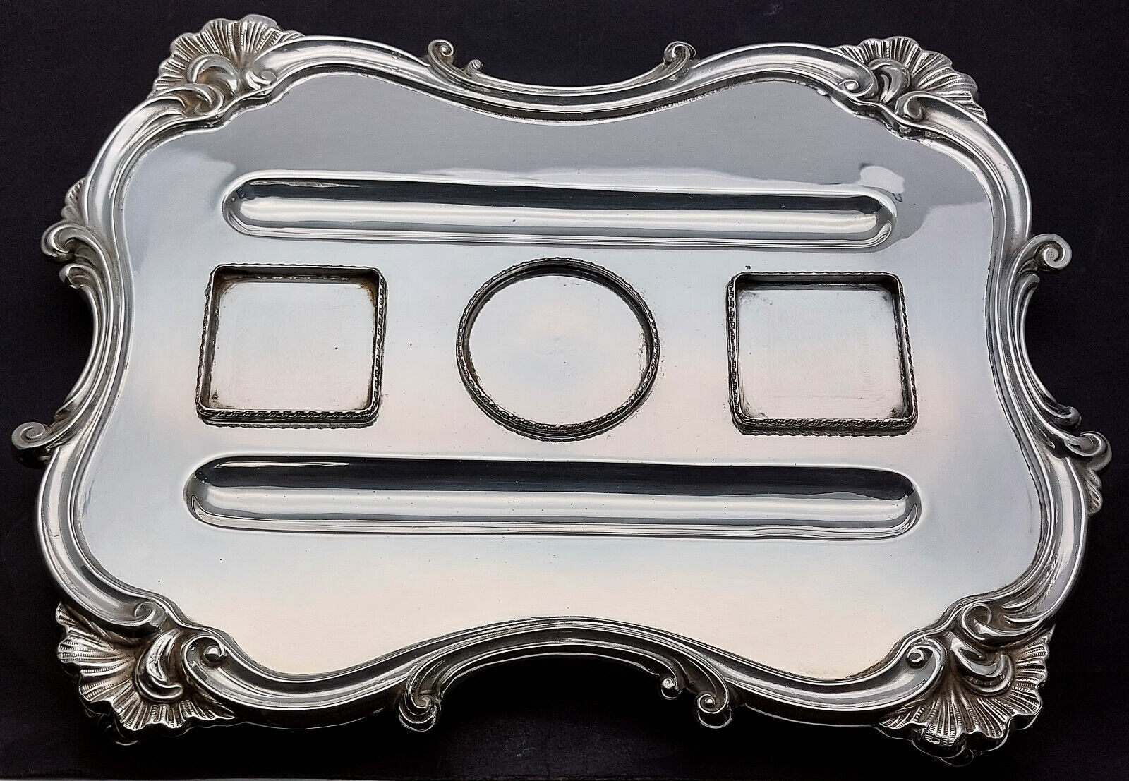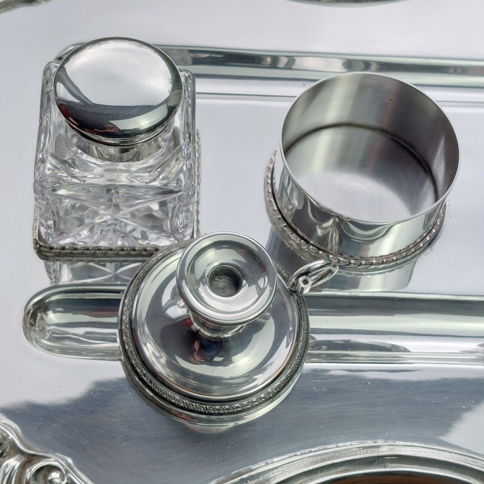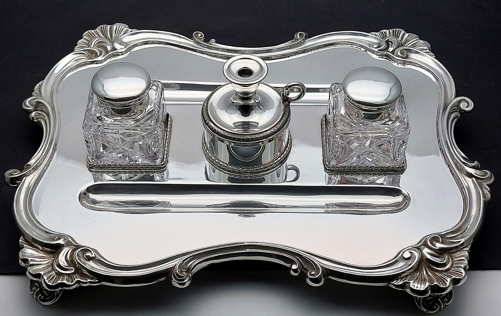 Condition: Stand is gleaming silver with some very minor surface marks, no dents. Glass is fine (some tiny fleabites only) with some very minor ink residue. Both wells have some minor marks to their plating at the apertures from use. Missing its snuffer to the candle holder.