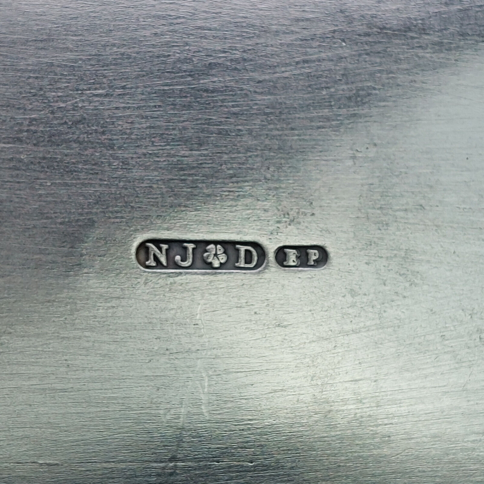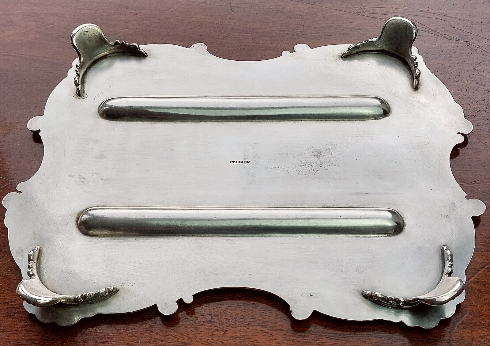 A gorgeous and very large inkwell standish in the Georgian style but made later, probably Edwardian. The removable candle holder sits on a sealing wax compartment. Marked ‘NJ’ (flower) ‘D’ (unidentified maker – possibly Dublin).