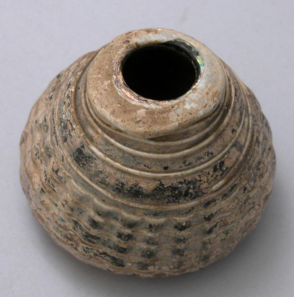 Part of the Islamic Art Collection at the Metropolitan Museum of Art (NYC), it was made with mold blown glass with applied trails. It probably was made in Syria and dates to the 13th century.