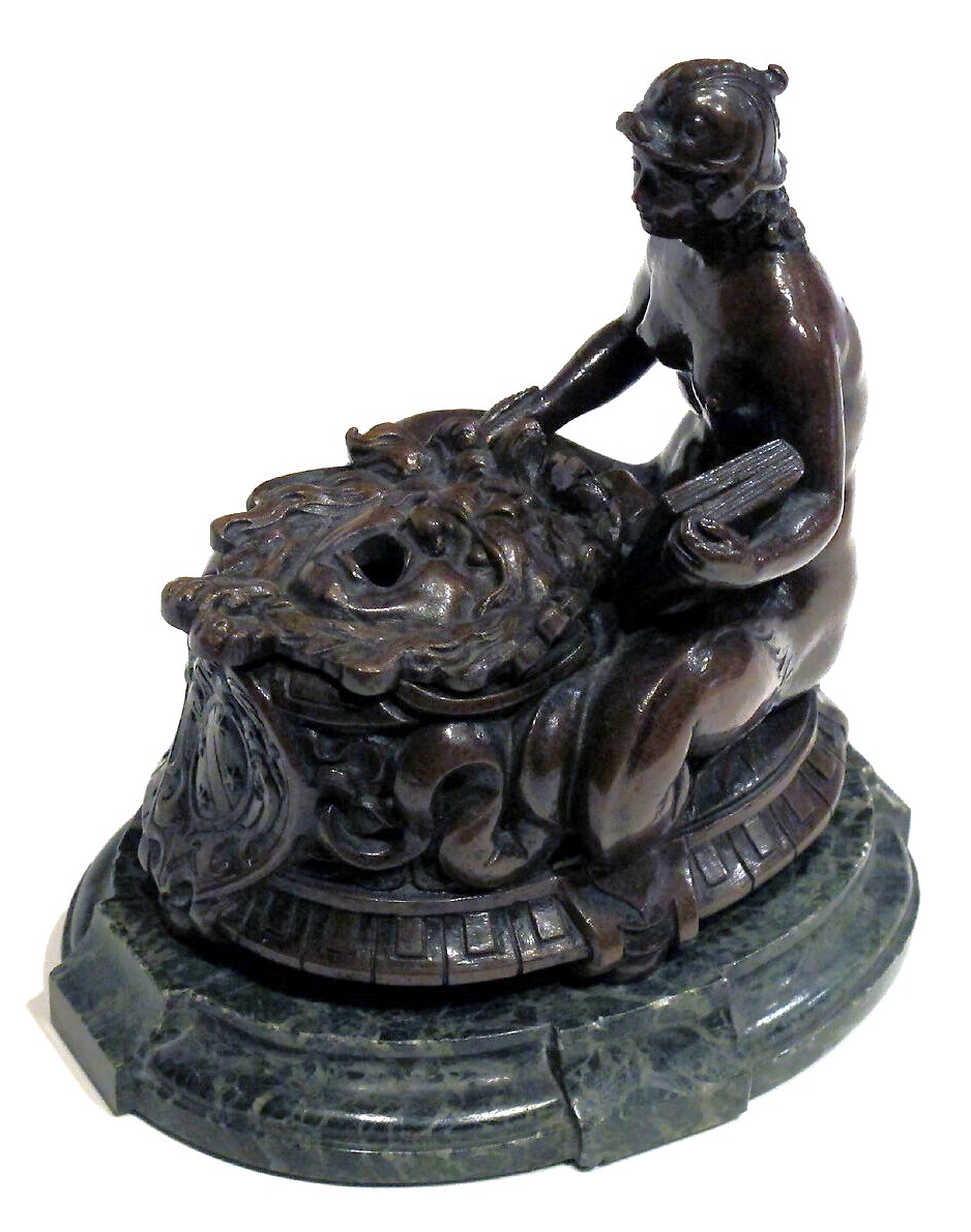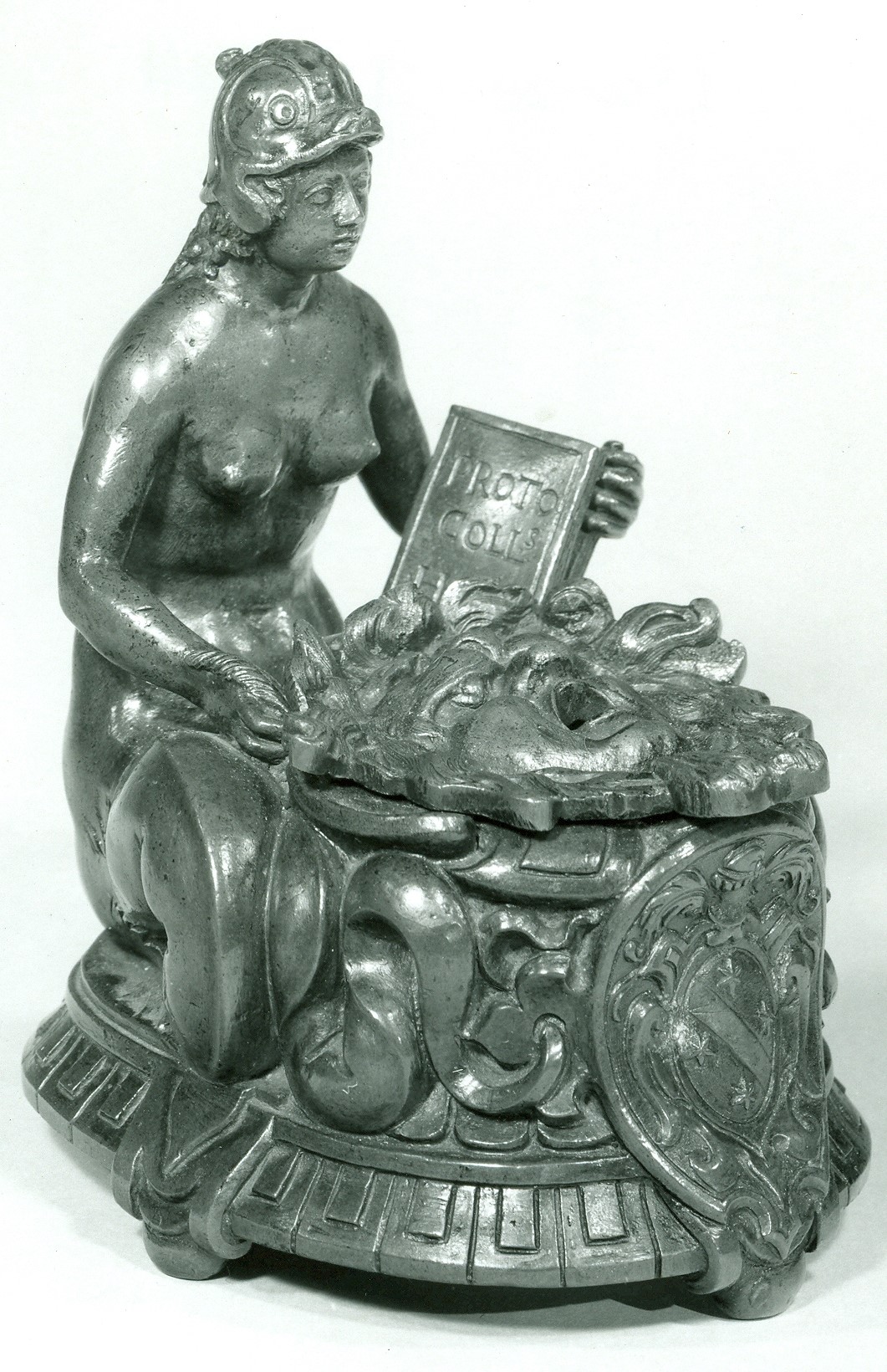 Copper alloy with light reddish-brown patina and remains of black lacquer patina. The bowl-shaped receptable for an inkwell is held by a seated mermaid with twin tails. The nude figure wears a dolphin-shaped helmet. In her left hand is a book inscribed “Proto Coll”. In her right hand she holds a quill. On the front of the bowl, which is decorated with strapwork, an escutcheon with a coat of arms surmounted by a helmet is held by the woman’s tails. The hinged lid of the bowl is formed as the head of Hercules surmounted by a lion’s skin and a lion’s head. The bowl and mermaid rest on a oval base with four strapwork feet.