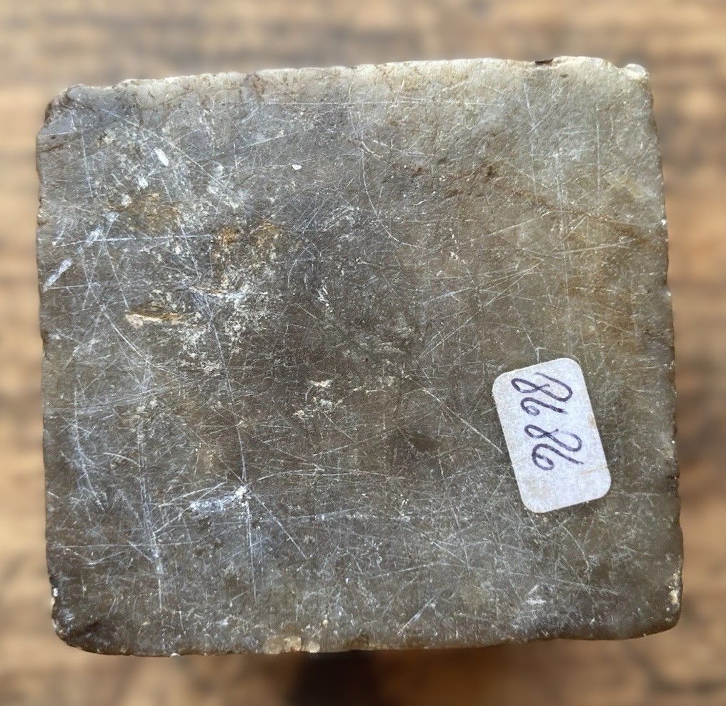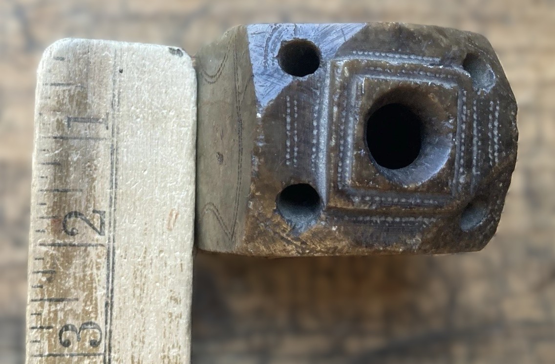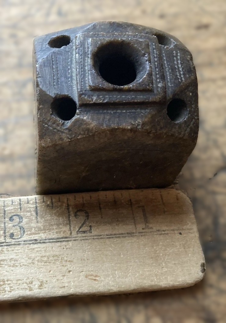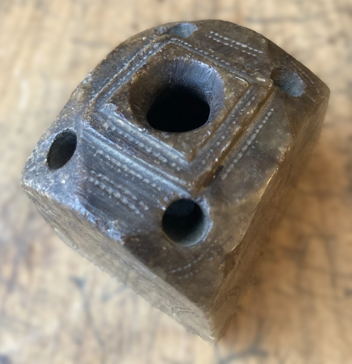 - Chip Marked “Lace” Pattern: A striking feature is the delicate hand-carved ornamentation. The repeating rows of incised dots and geometric lines create a “lace” effect, a level of detail more sophisticated than the plain, utilitarian blocks typical of the period.