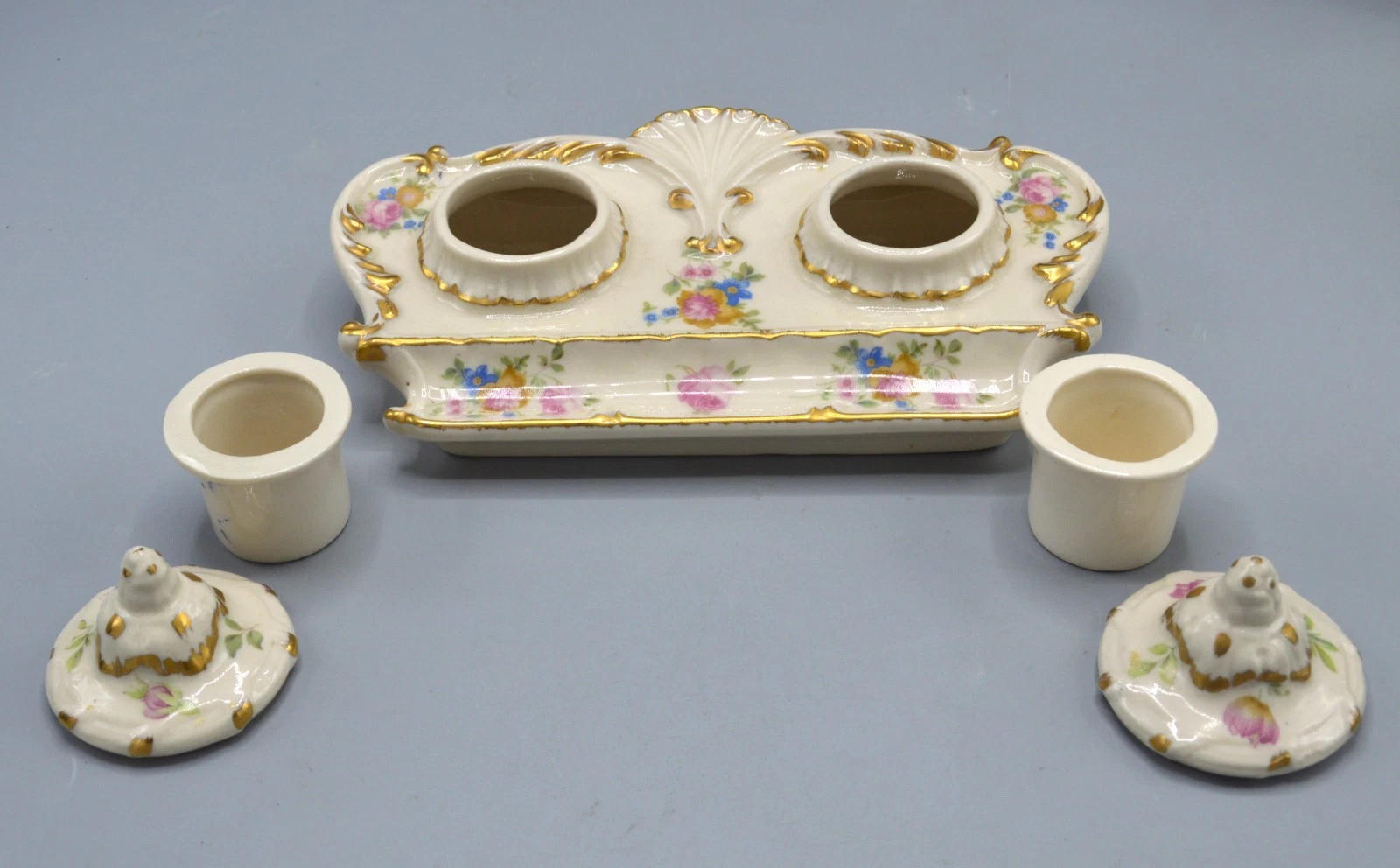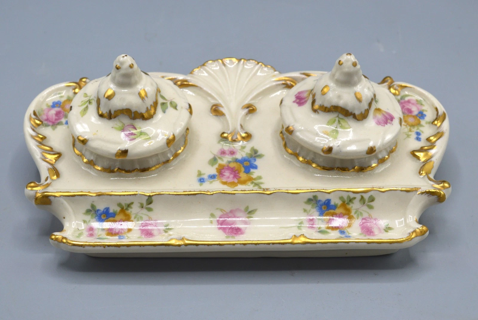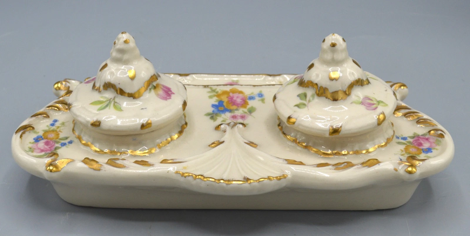 Summary: This is a c. 1950s porcelain inkstand, made in Japan, designed to look like an antique French or English piece.
