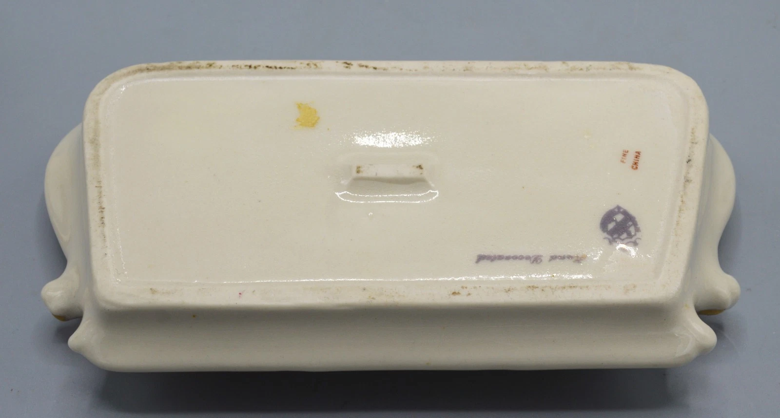 • The Clue: Authentic English porcelain using the Royal Arms (like Royal Crown Derby or Mintons) would include the specific manufacturer’s name and usually “Made in England.” The generic text “FINE CHINA” and “Hand Decorated” is the signature of 1950s/60s giftware imports.