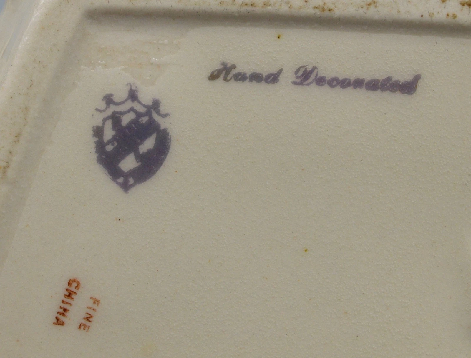 The blue stamp on the bottom features a Crown above a Shield containing three lions (passant guardant), with the text “Hand Decorated” in script and “FINE CHINA” in block letters.