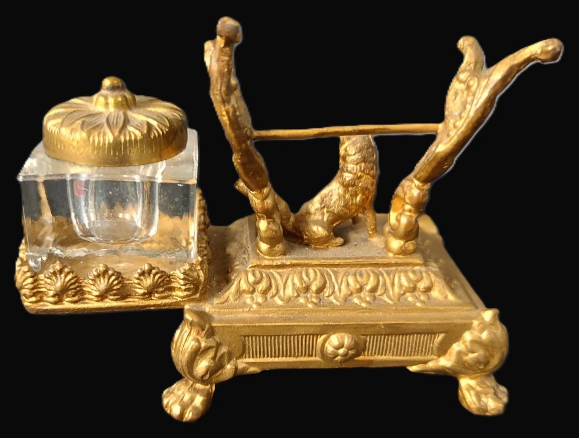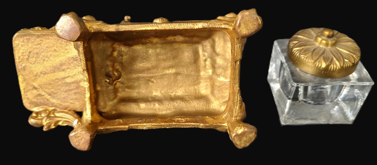 • The Lid: The glass inkwell is topped with a matching gilt bronze lift-off lid. The lid features a radiating floral or petal-like decoration and is crowned with a small spherical finial.