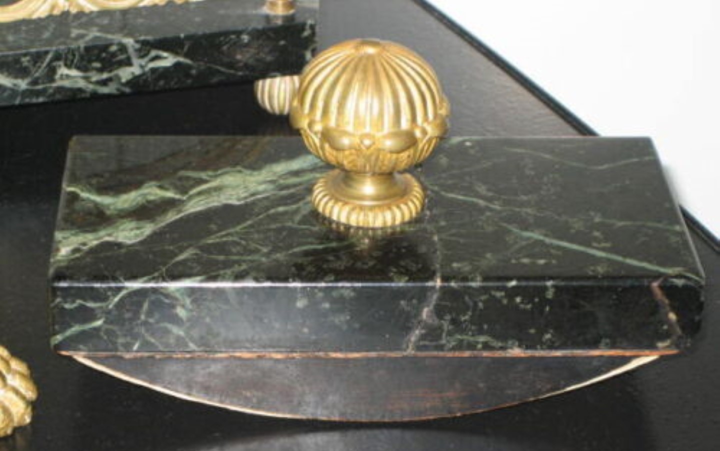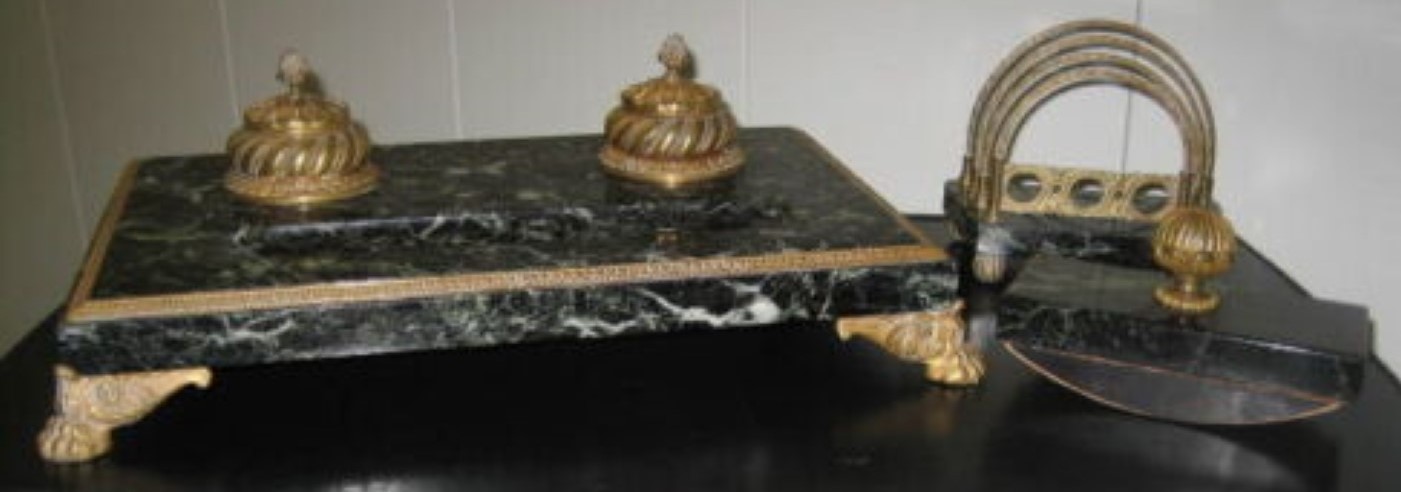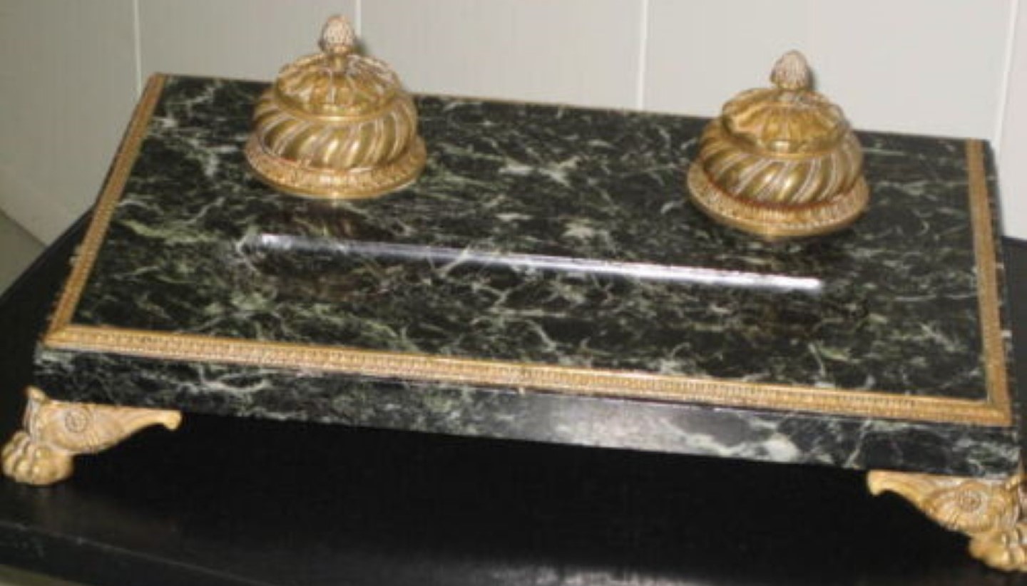 The double inkstand’s base is made from veined dark green marble. It sits on four brass feet and inlaid brass bordering and has a pen channel. Covering the inkwells are hinged brass lids ornamented with acorn finials. Each glass insert is two parts – the glass container and a glass funnel piece.