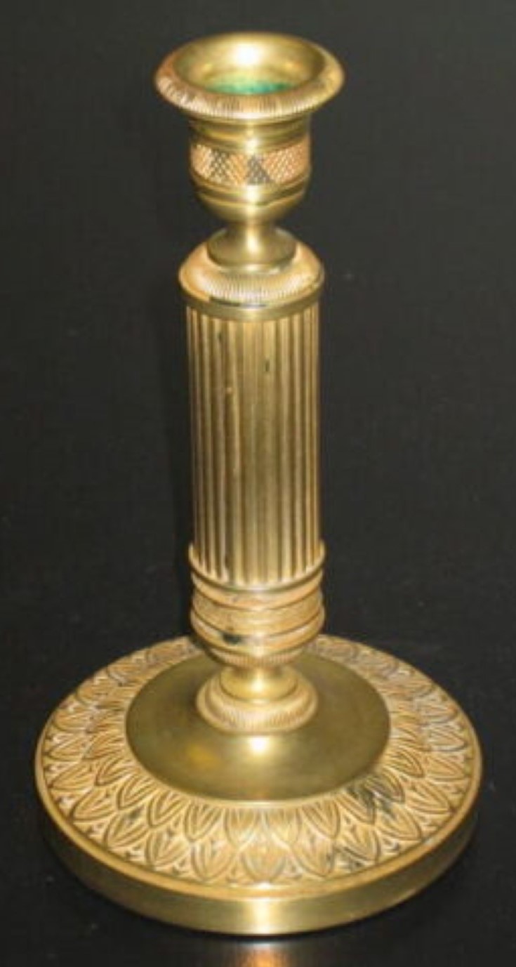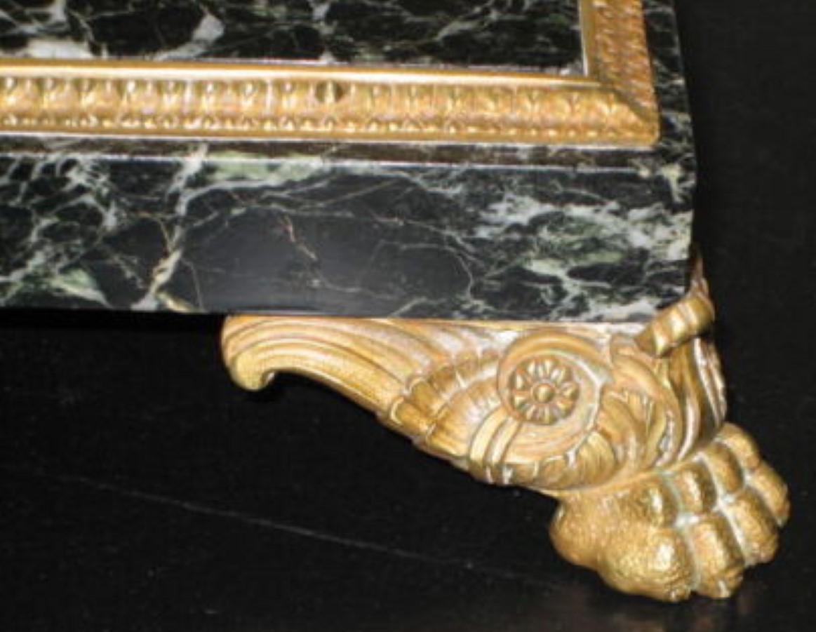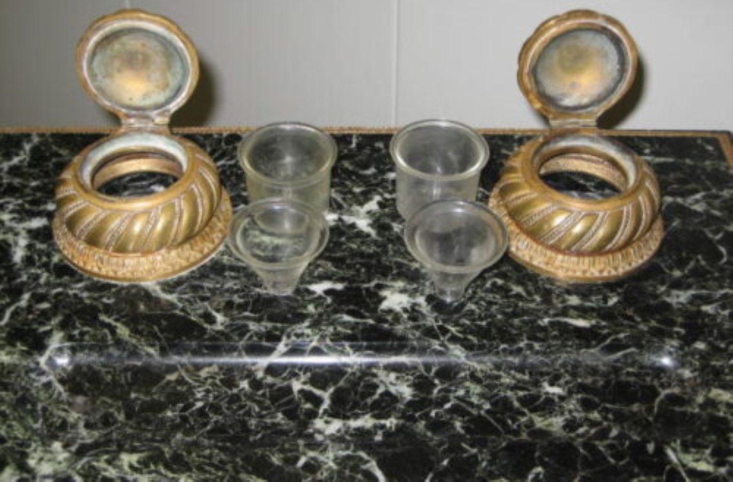 The double inkstand’s base is made from veined dark green marble. It sits on four brass feet and inlaid brass bordering and has a pen channel. Covering the inkwells are hinged brass lids ornamented with acorn finials. Each glass insert is two parts – the glass container and a glass funnel piece.