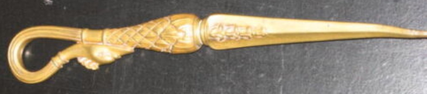 The matching ink blotter is made from the same marble and has a heavy brass handle which unscrews to change blotting paper. The letter holder has three sections divided by twisted brass rope. There is a brass candlestick and a letter opener with a swan handle.