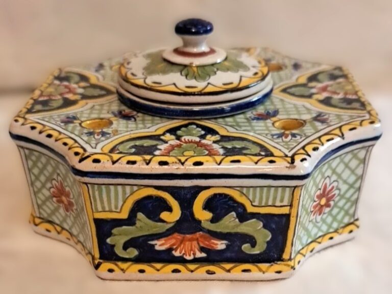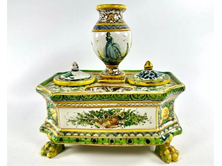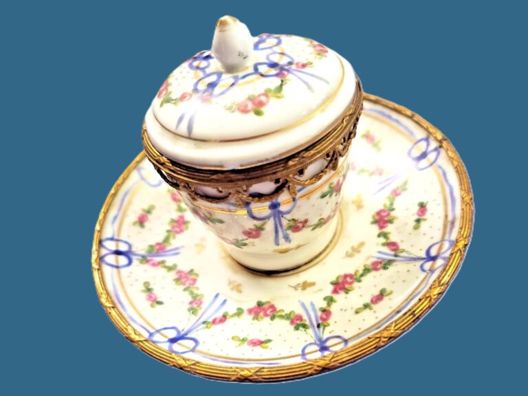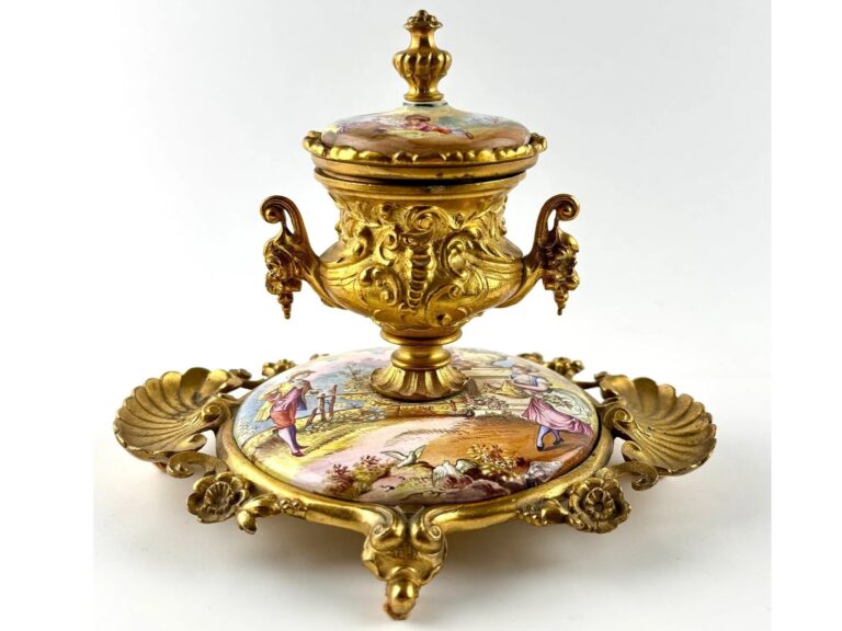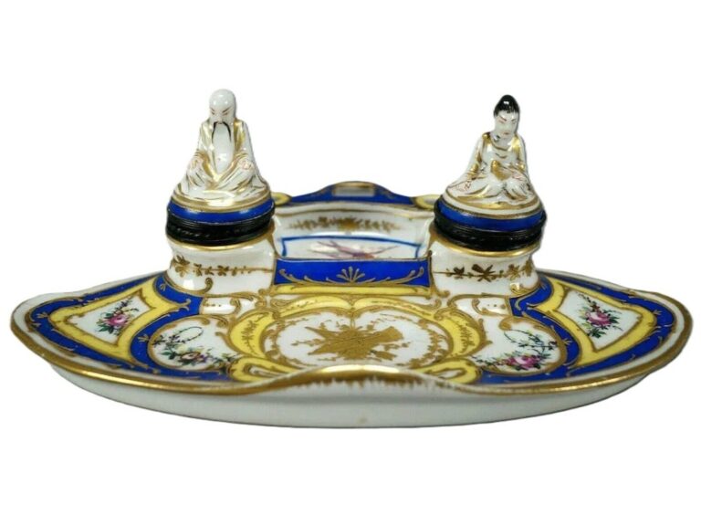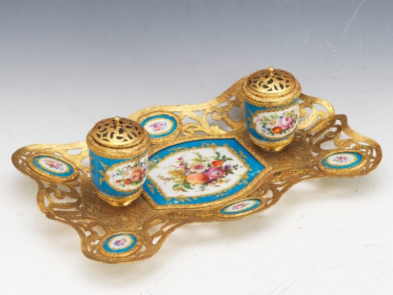 French D’oré Bronze and Hand Painted Porcelain Double Inkstand