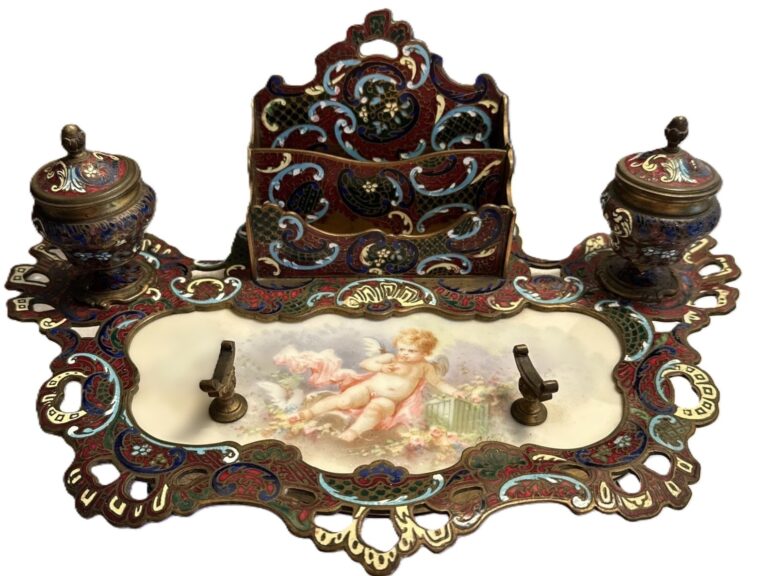 French Champlevé Enamel and Porcelain Stationery Stand (Écritoire)