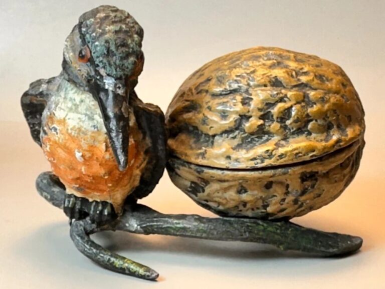 Cold-Painted Spelter Figural Inkstand: Kingfisher and Walnut