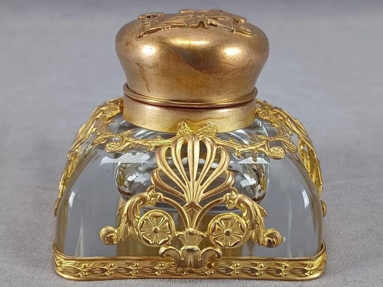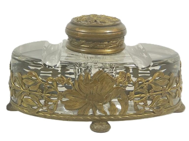 Green Crystal Glass Inkwell with Gilt Ormolu Overlay