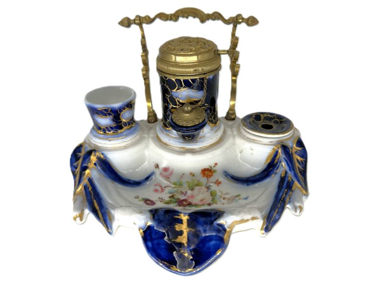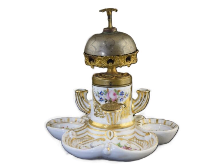 French Porcelain “Pump” Inkwell with Servants Bell