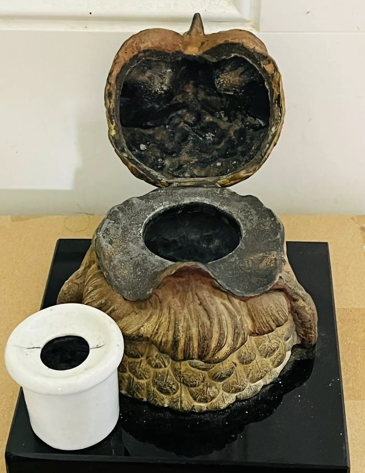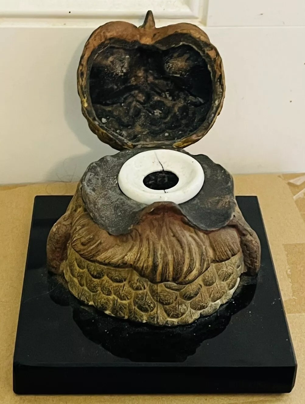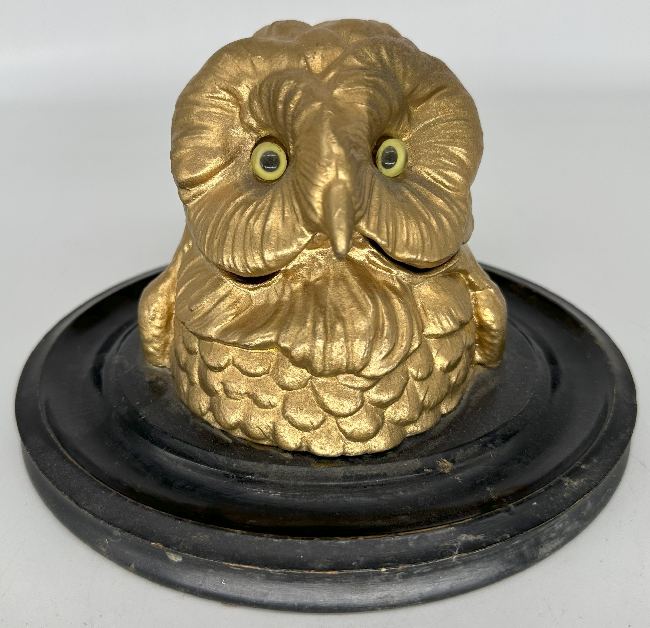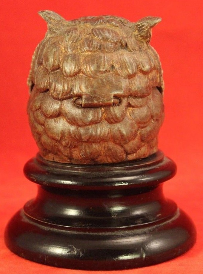 The three owls pictured here all resemble a Boreal Owl, known for its distinctive wide eyes. Their eyes are made of glass. Their bodies feature detailed feather texturing, with individual feathers sculpted in a layered pattern. The heads are hinged and open to access the inkwell.