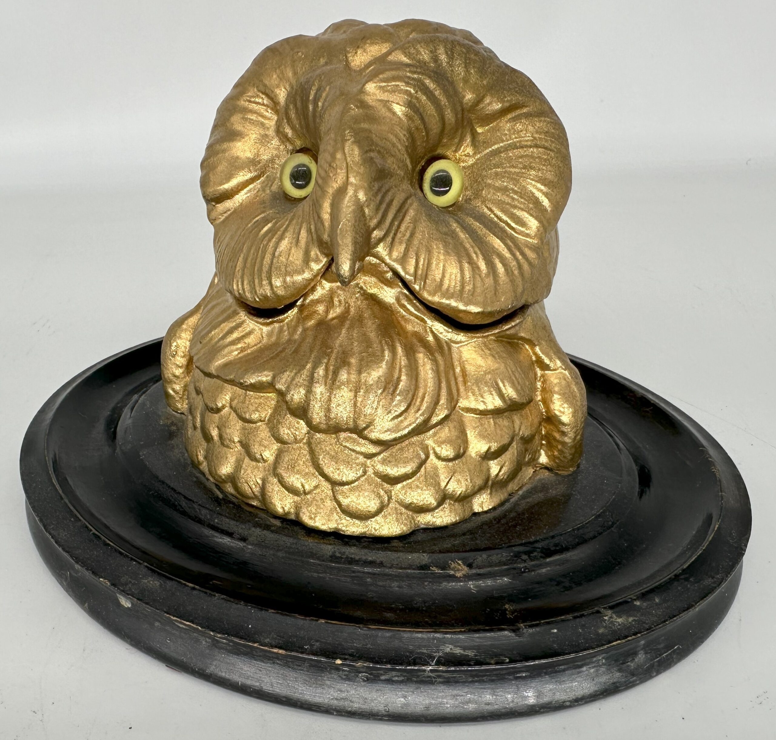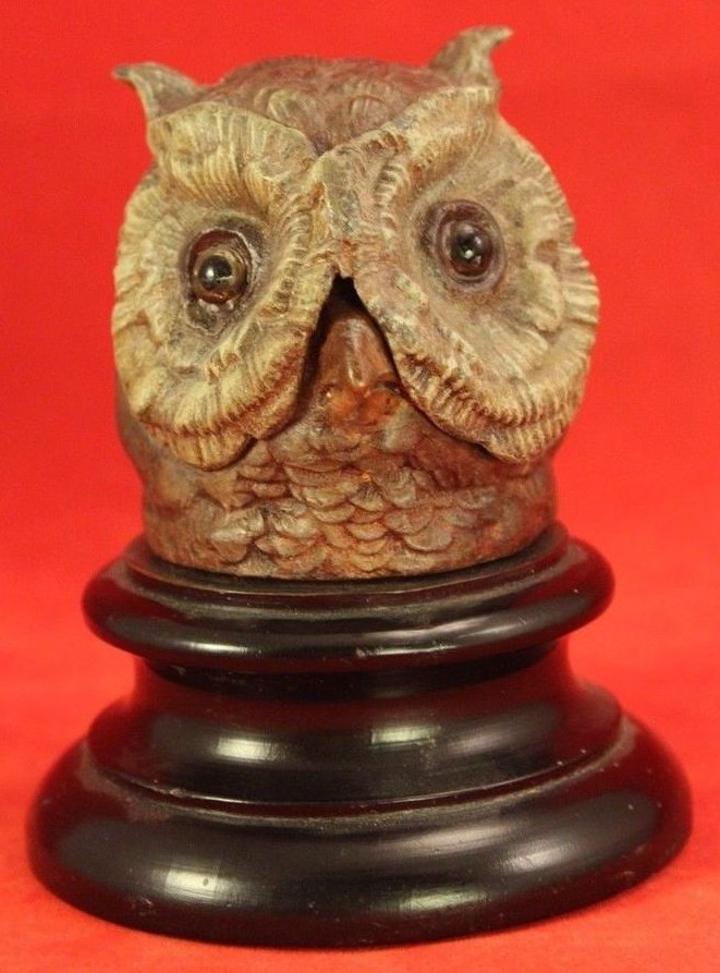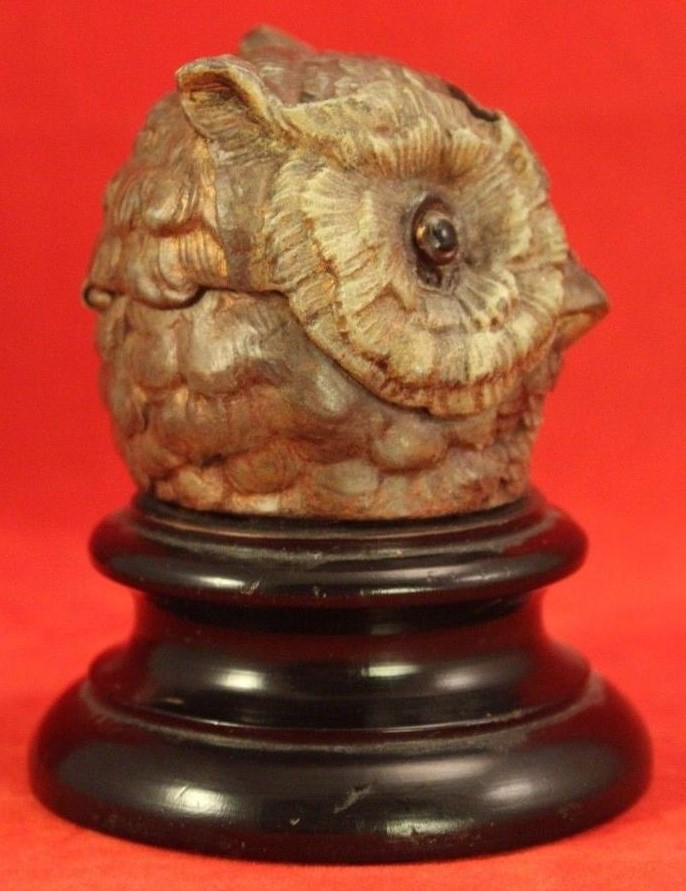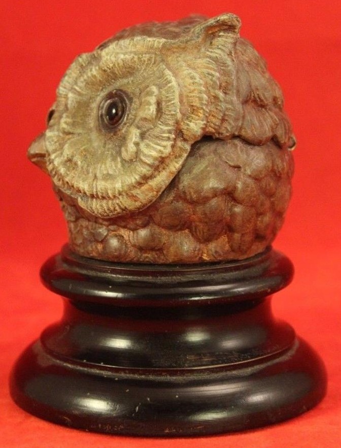 Owl #1 rests on a black turned wood base. Dimensions: 7” x 5 ¾” x 5” high. It sold for $192 in April 2021.