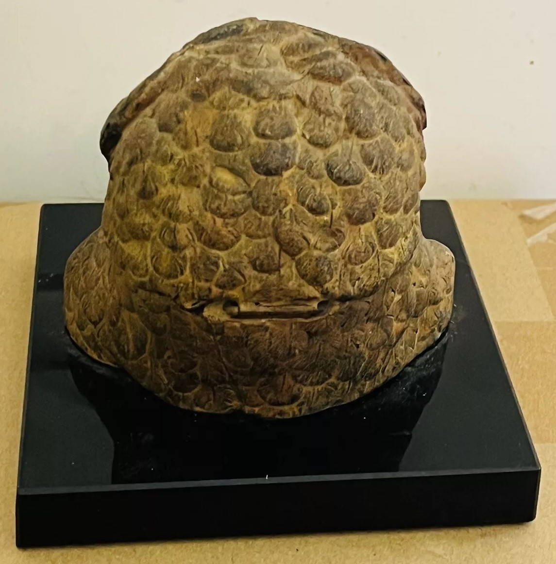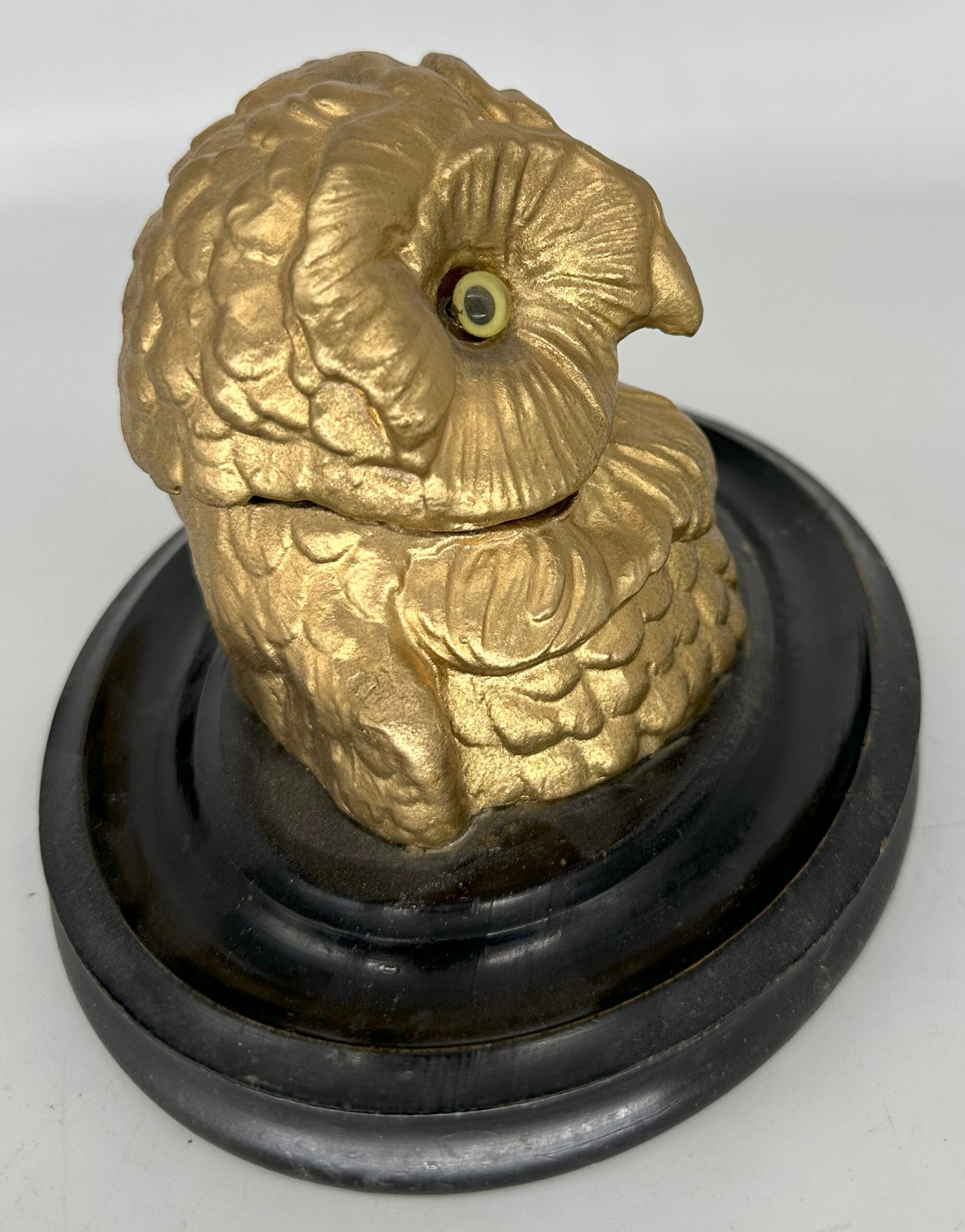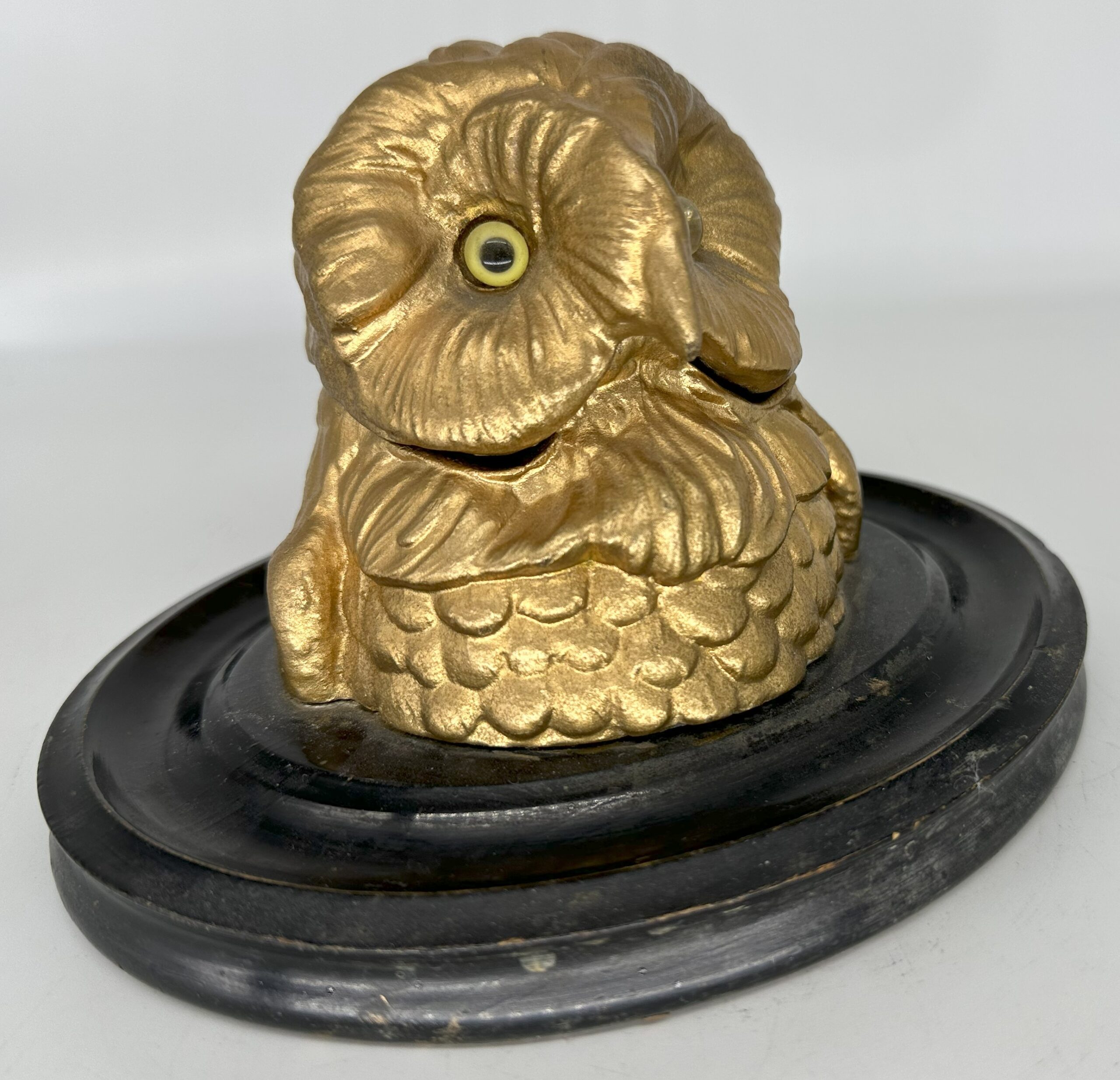Owl #1 rests on a black turned wood base. Dimensions: 7” x 5 ¾” x 5” high. It sold for $192 in April 2021.