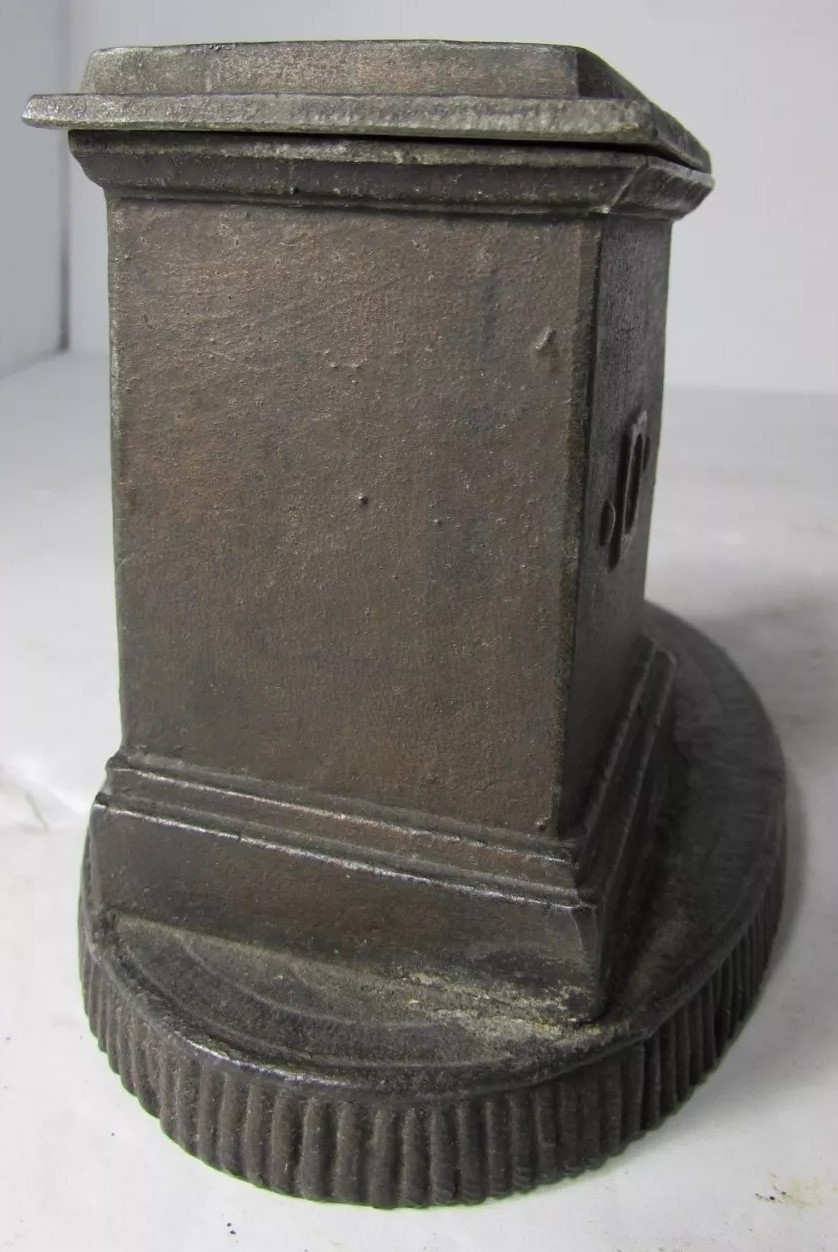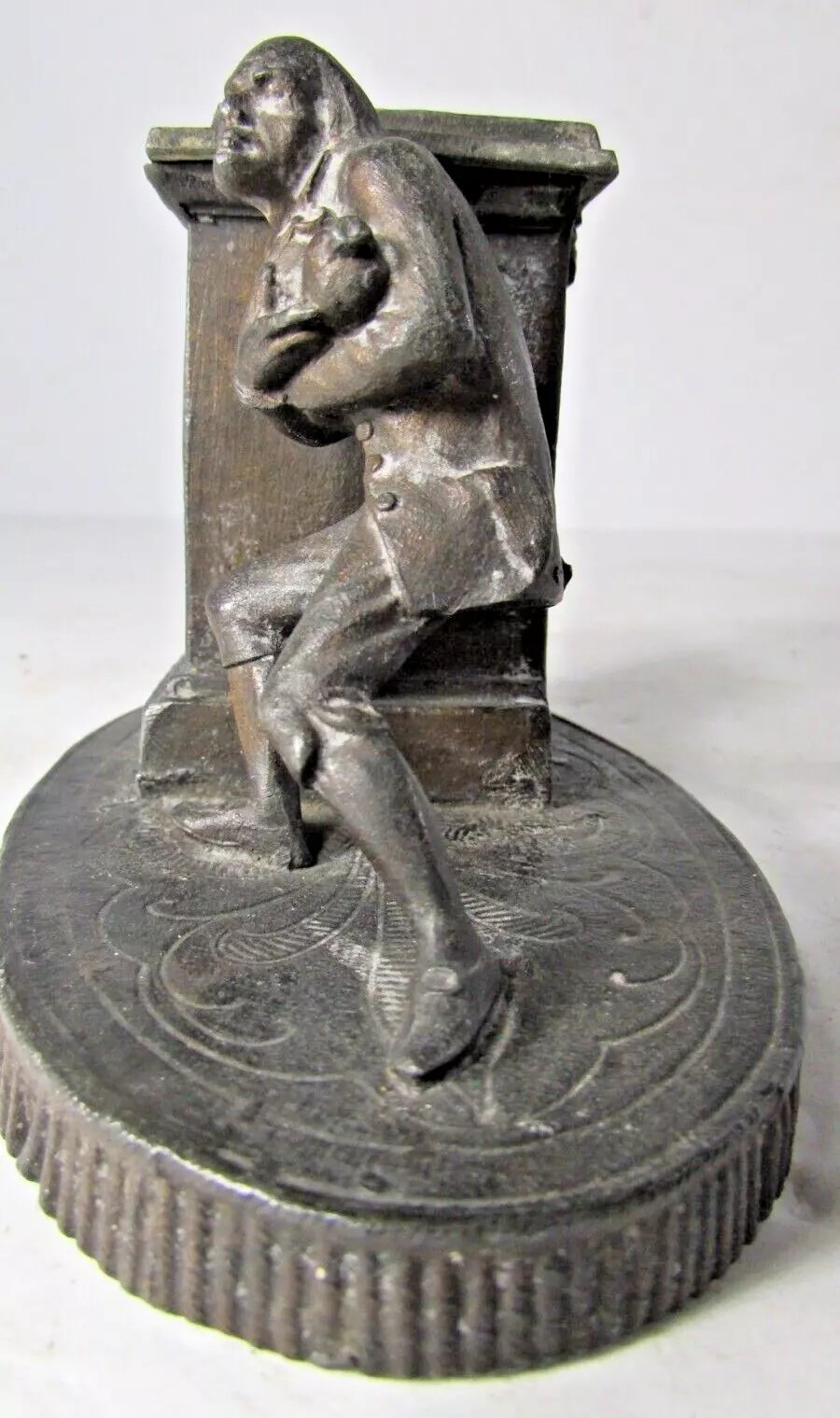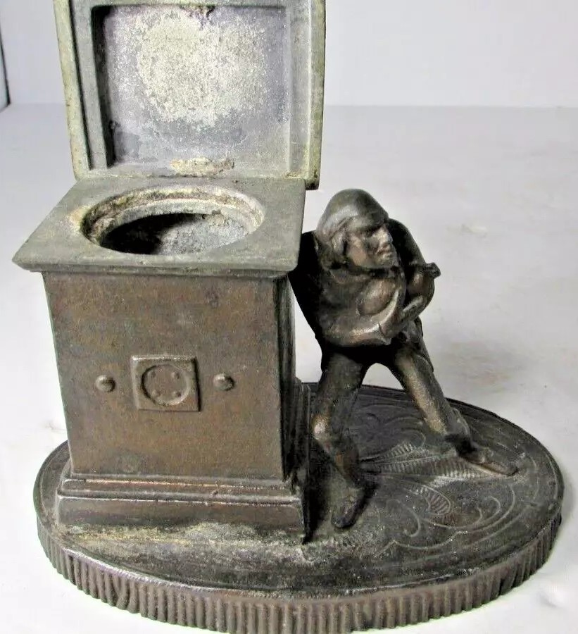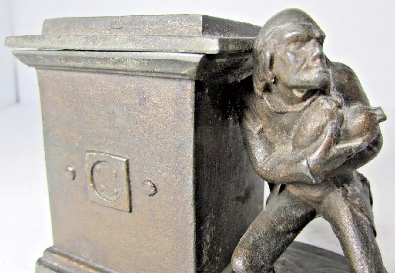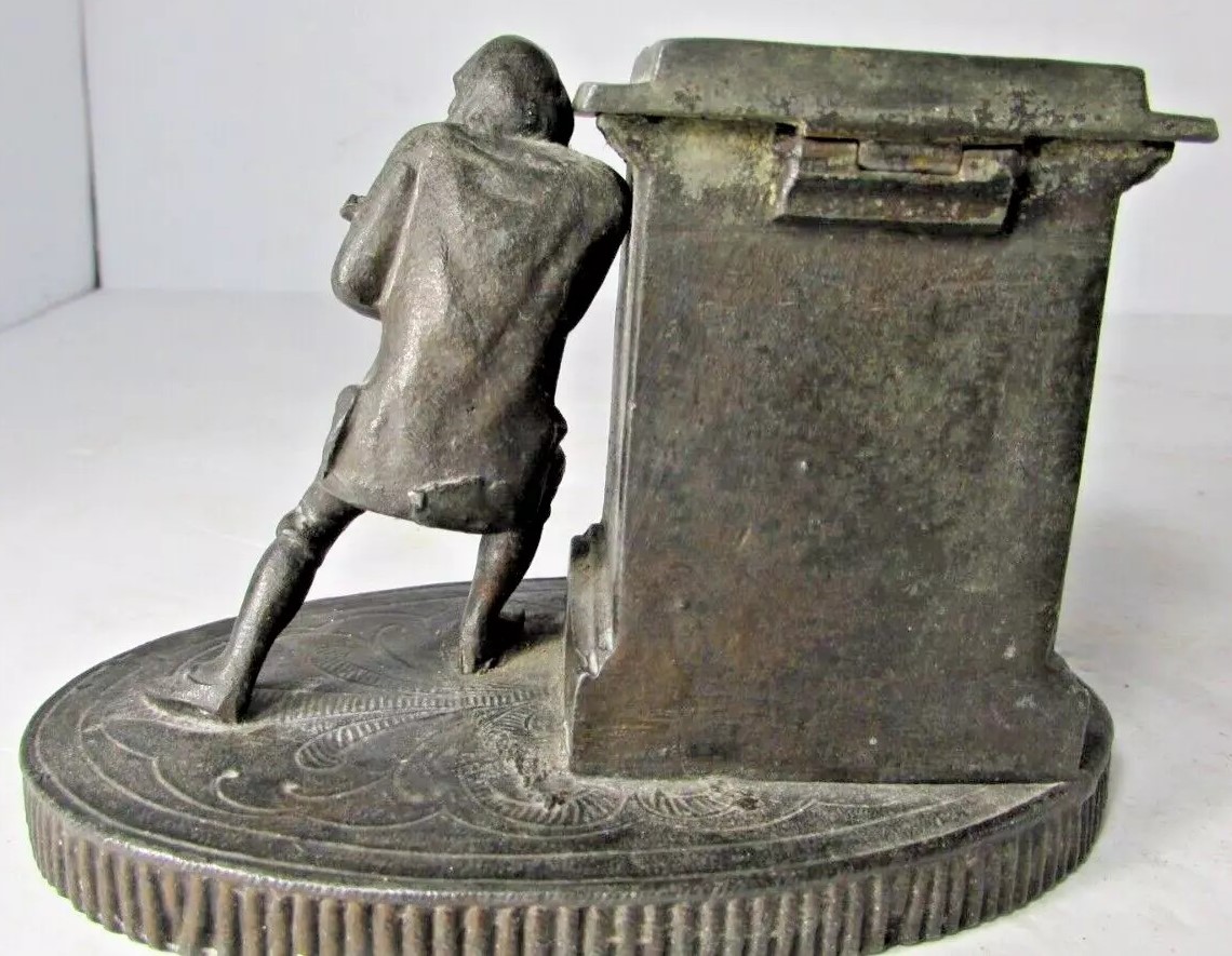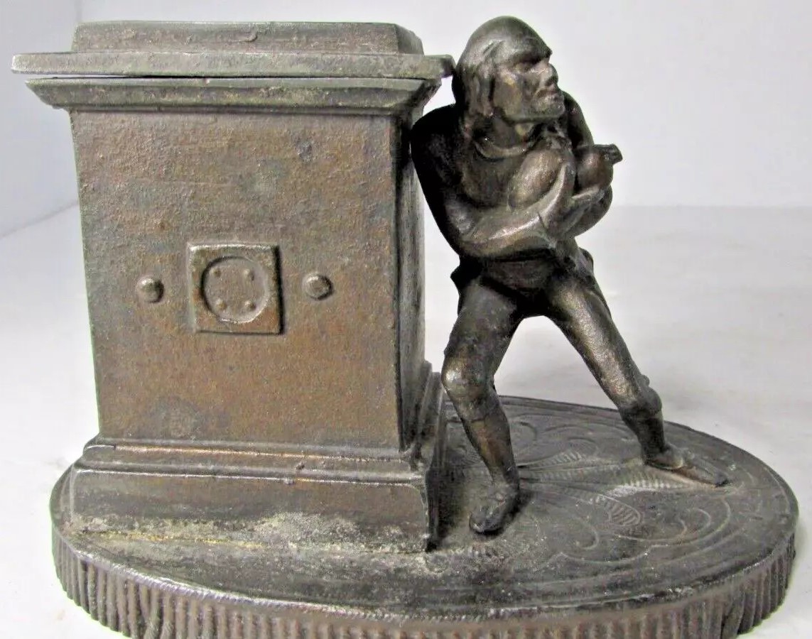 This inkstand depicts an unusual scene:  A man with a furtive look holds bags of money while standing next to a vault (which houses the inkwell). The base is marked “542 -AB”.