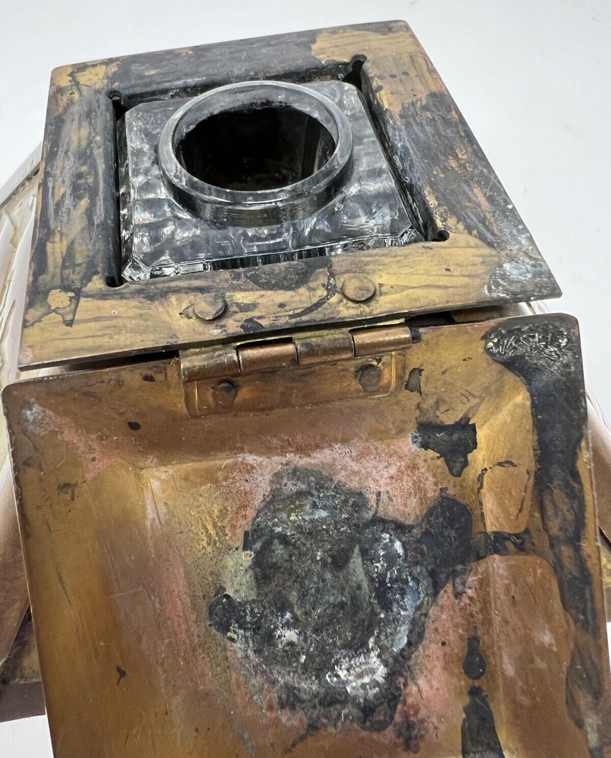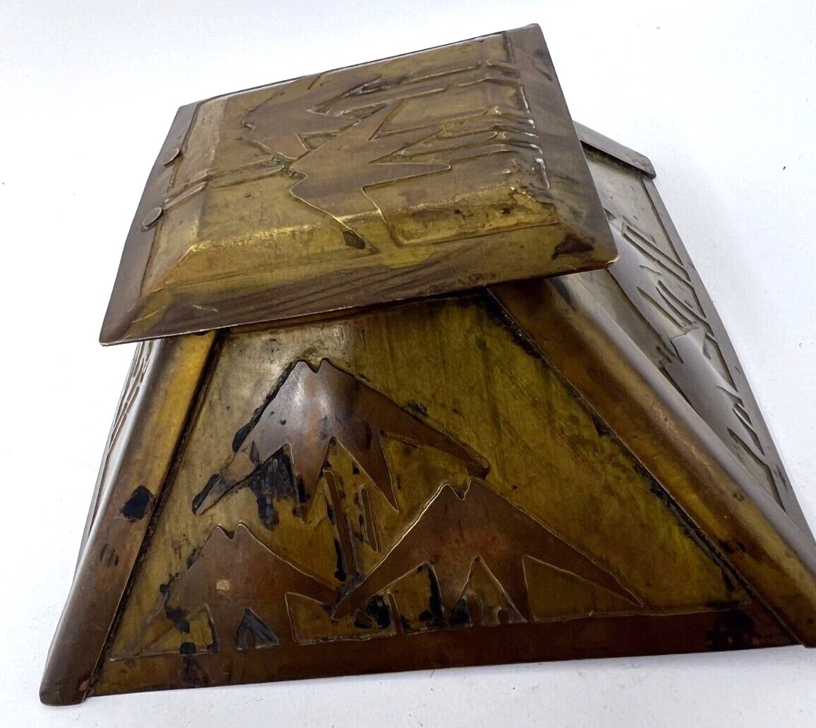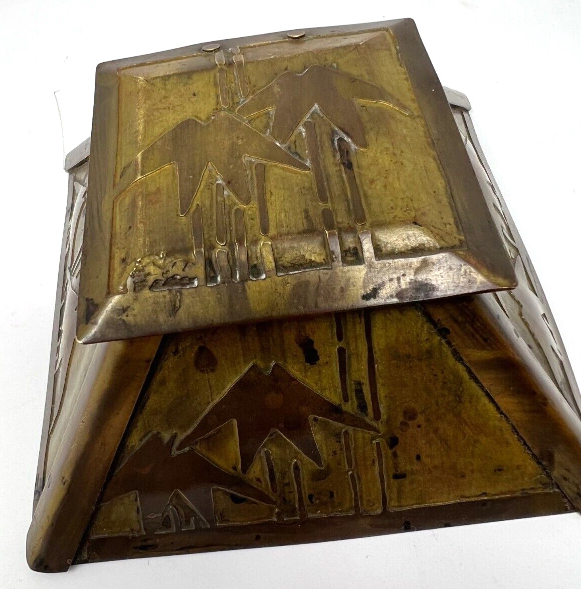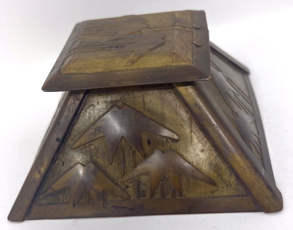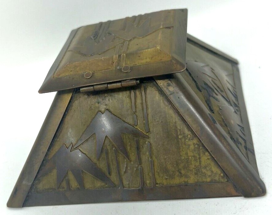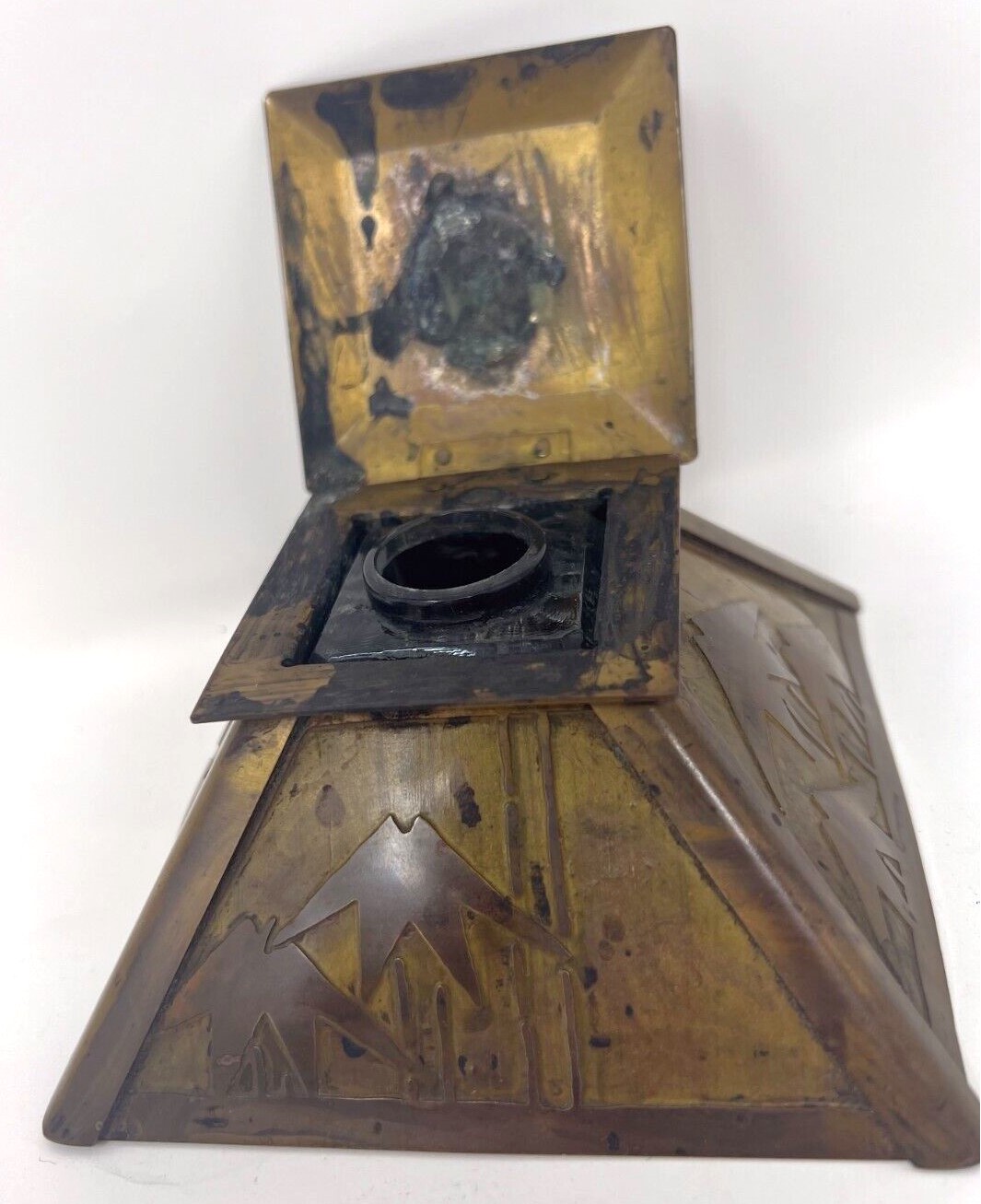 A pyramid-shaped brass inkwell decorated with abstract leaf patterns. The inkwell is attributed to Carence Crafters.