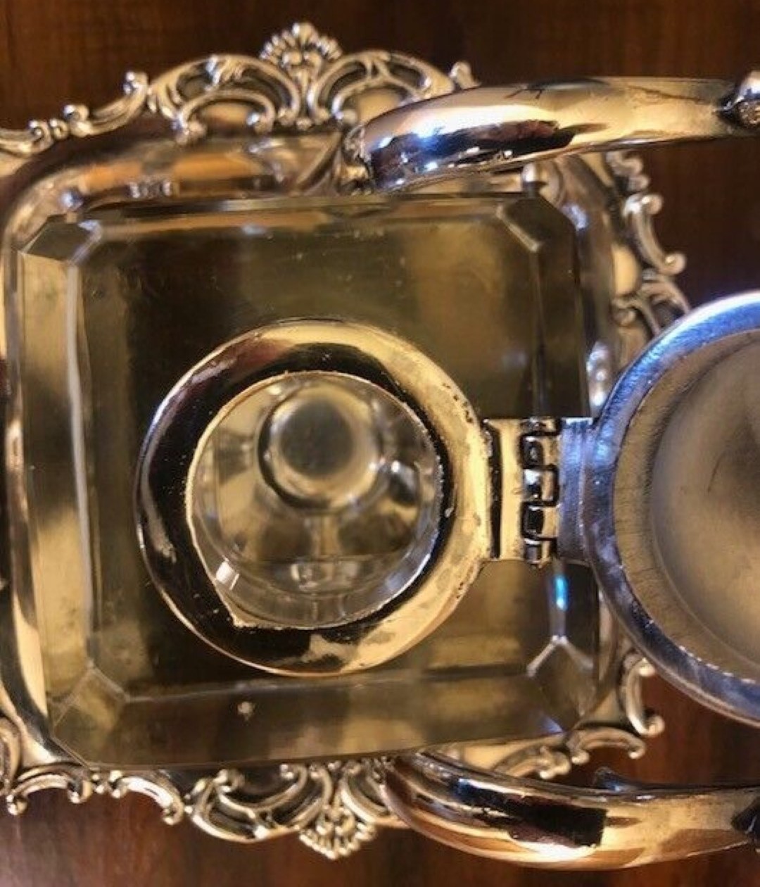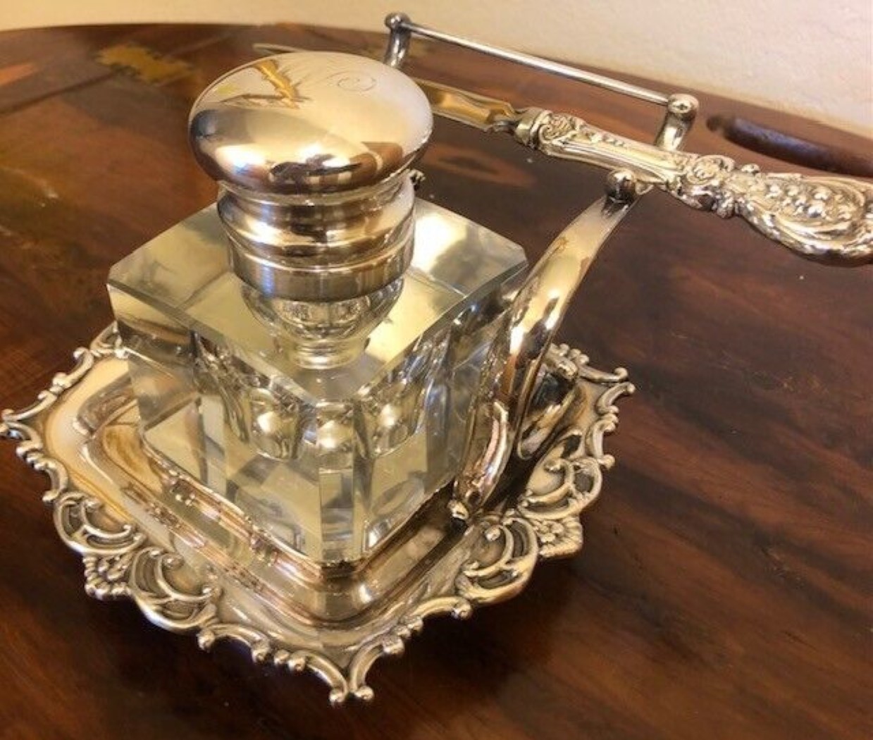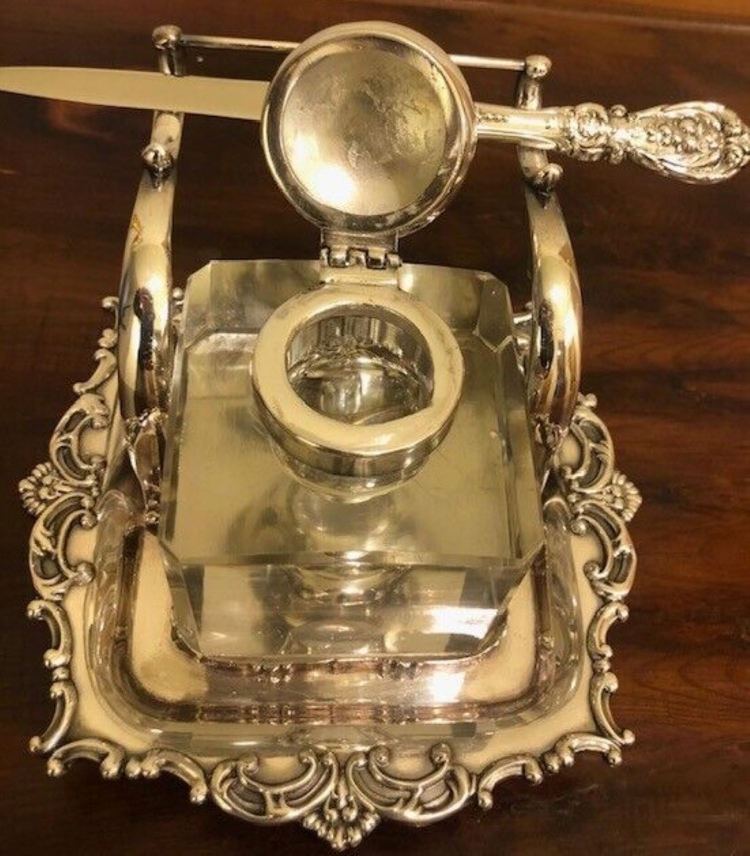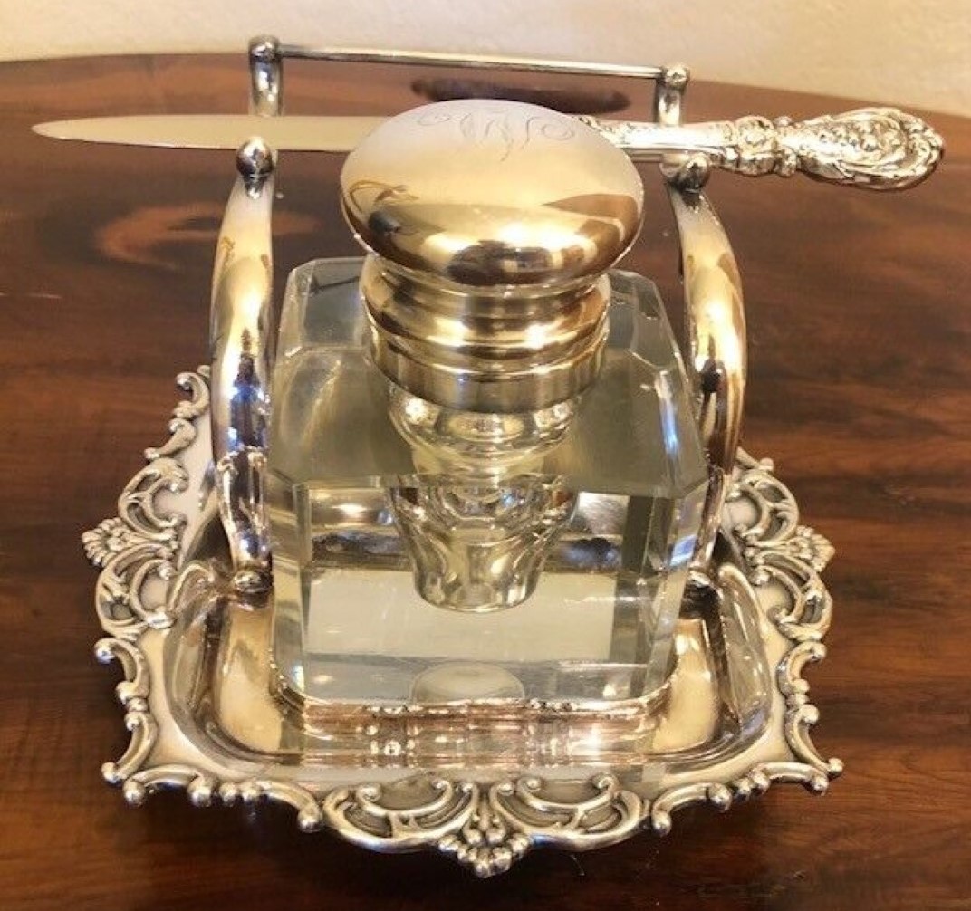 Silverplate inkstand with pen holder and crystal inkwell with silver hinged lid. The bottom is marked “Adelphi Silver Co., Quadruple Plated Silver, New York, 33”. The lid is monogramed with a “W”.