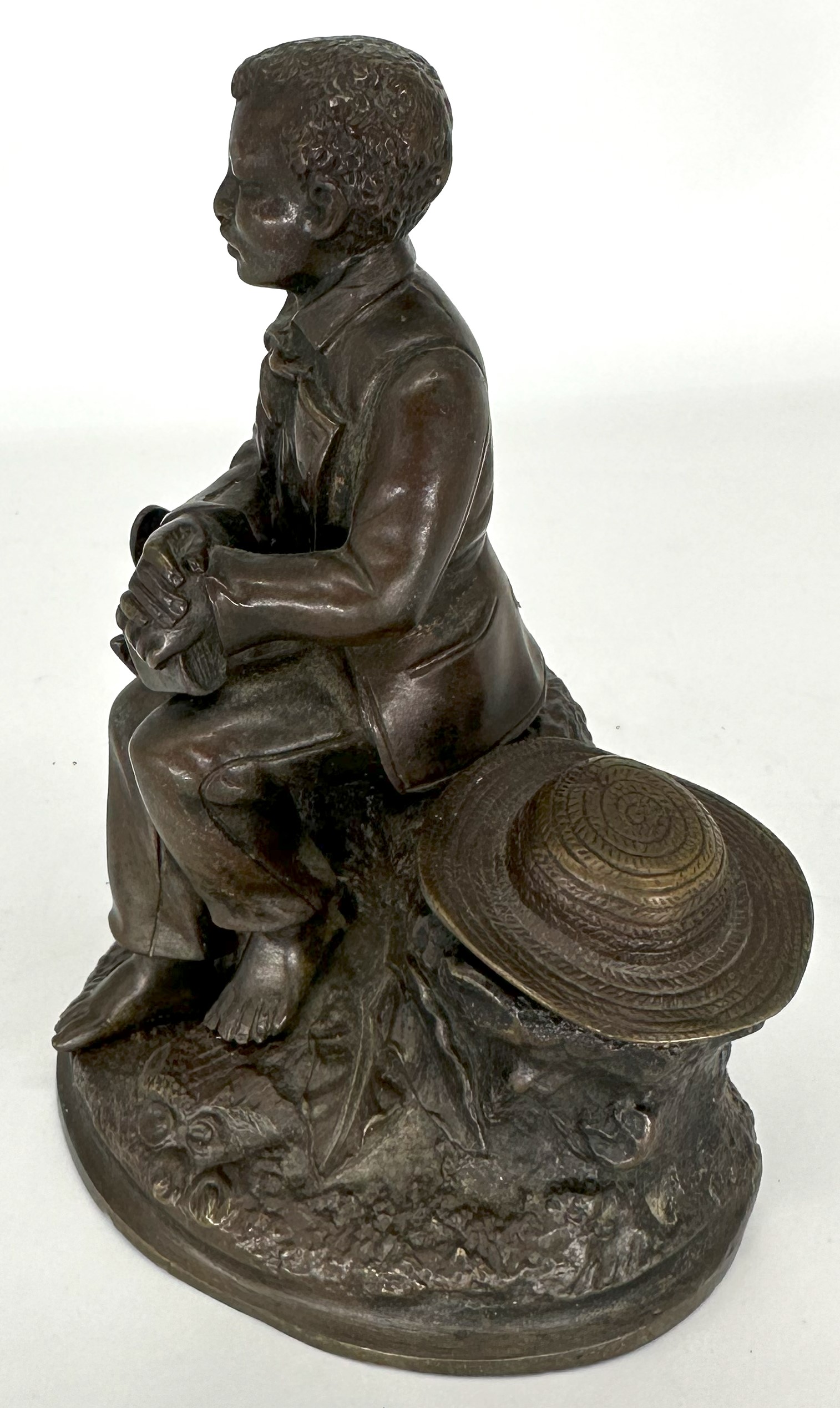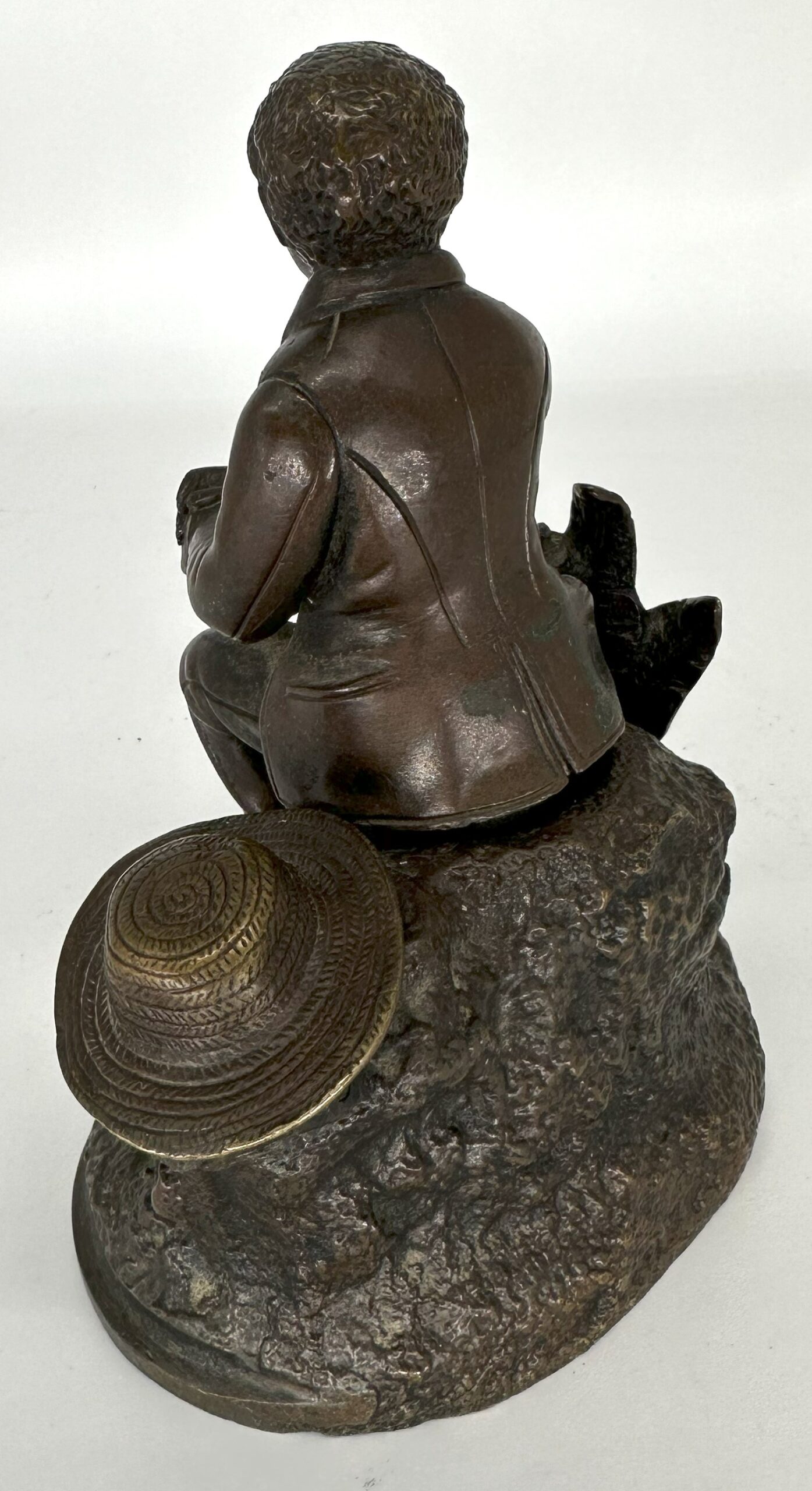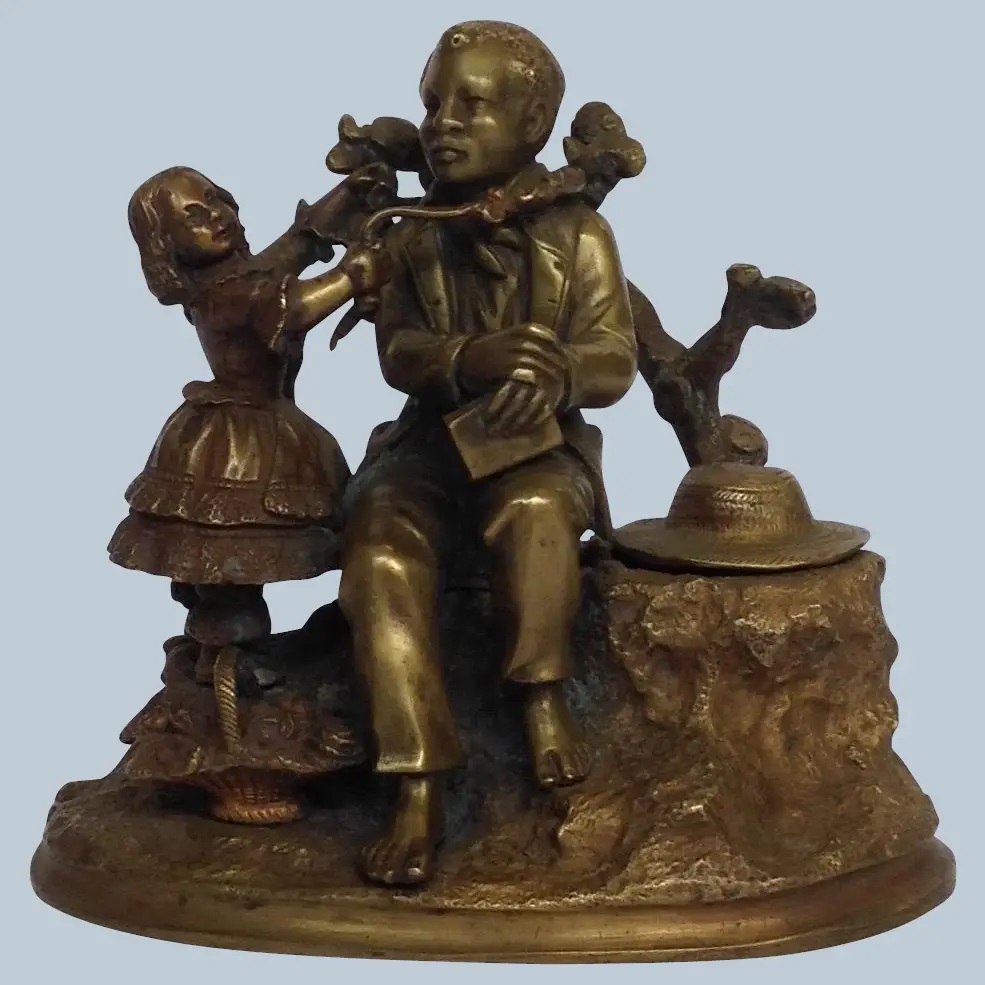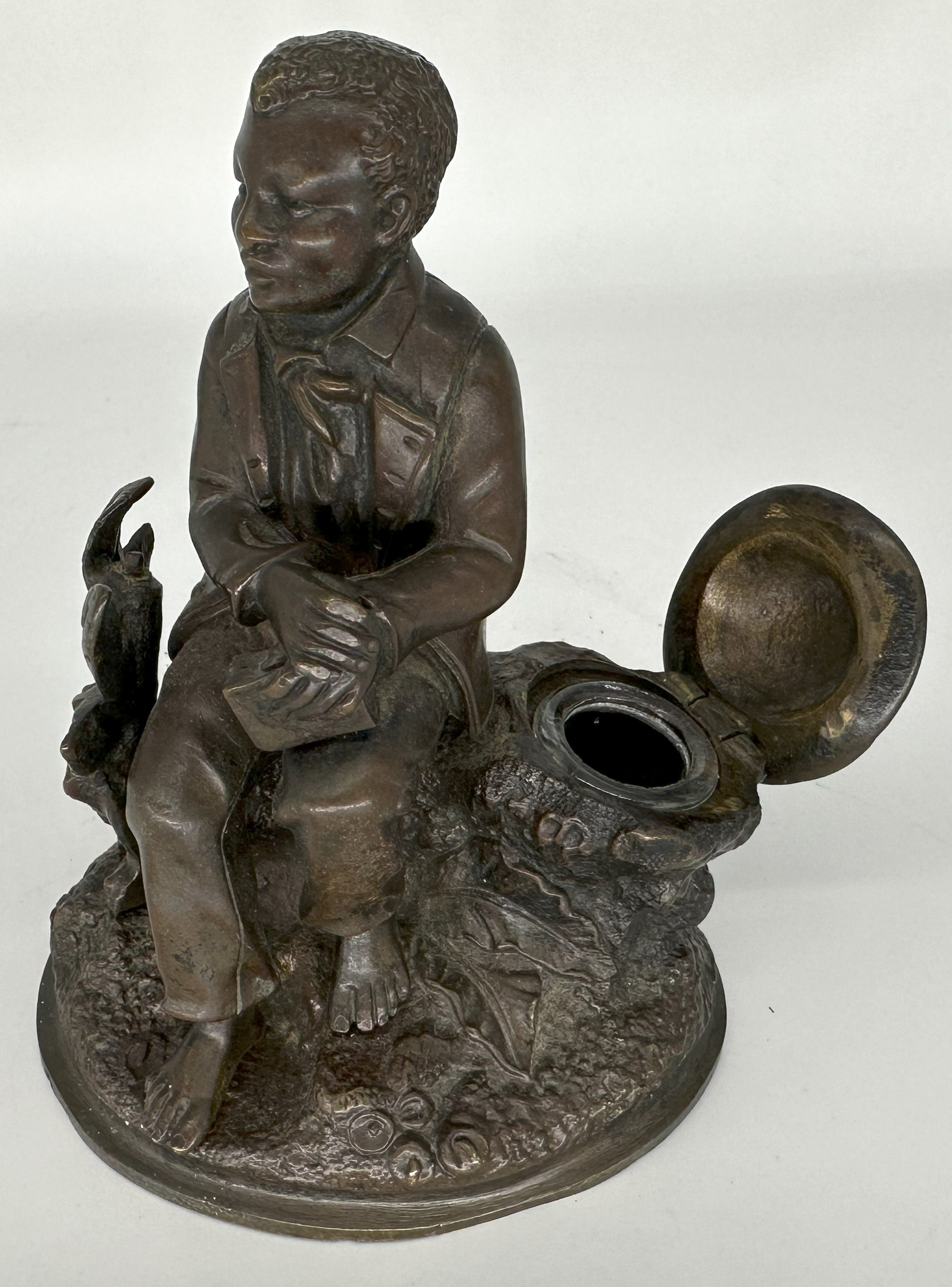 Two depictions of a bronze Uncle Tom inkwell are shown. The first shows Uncle sitting on a rock. His hat serves as a hinged lid which opens to access the inkwell. The second depiction includes Little Eva placing a garland of flowers around Uncle Tom.