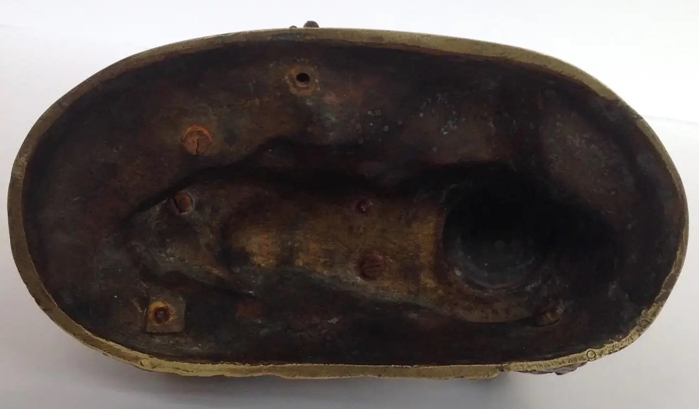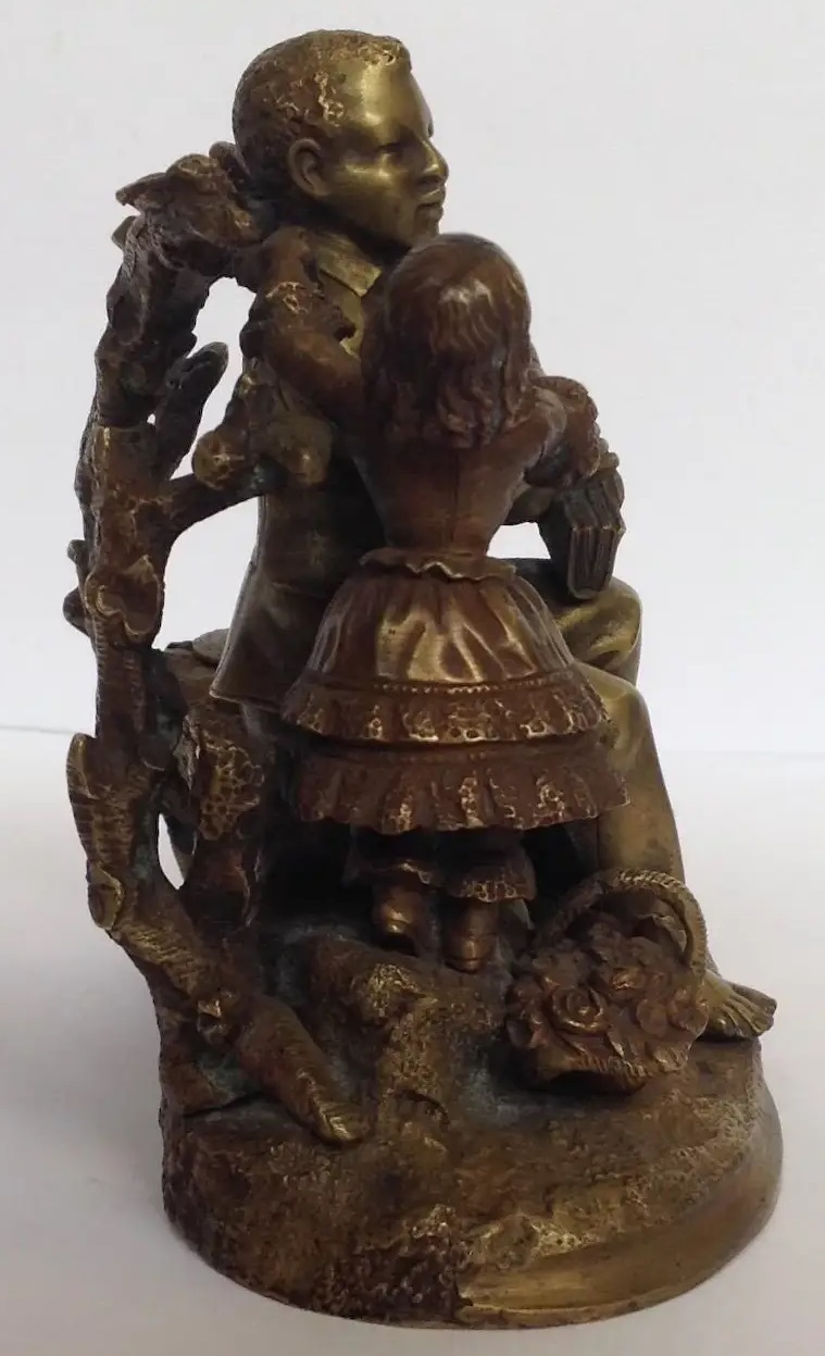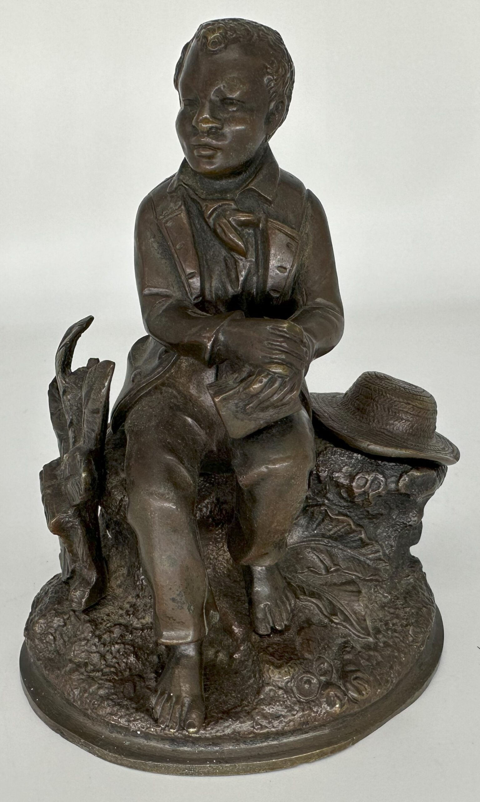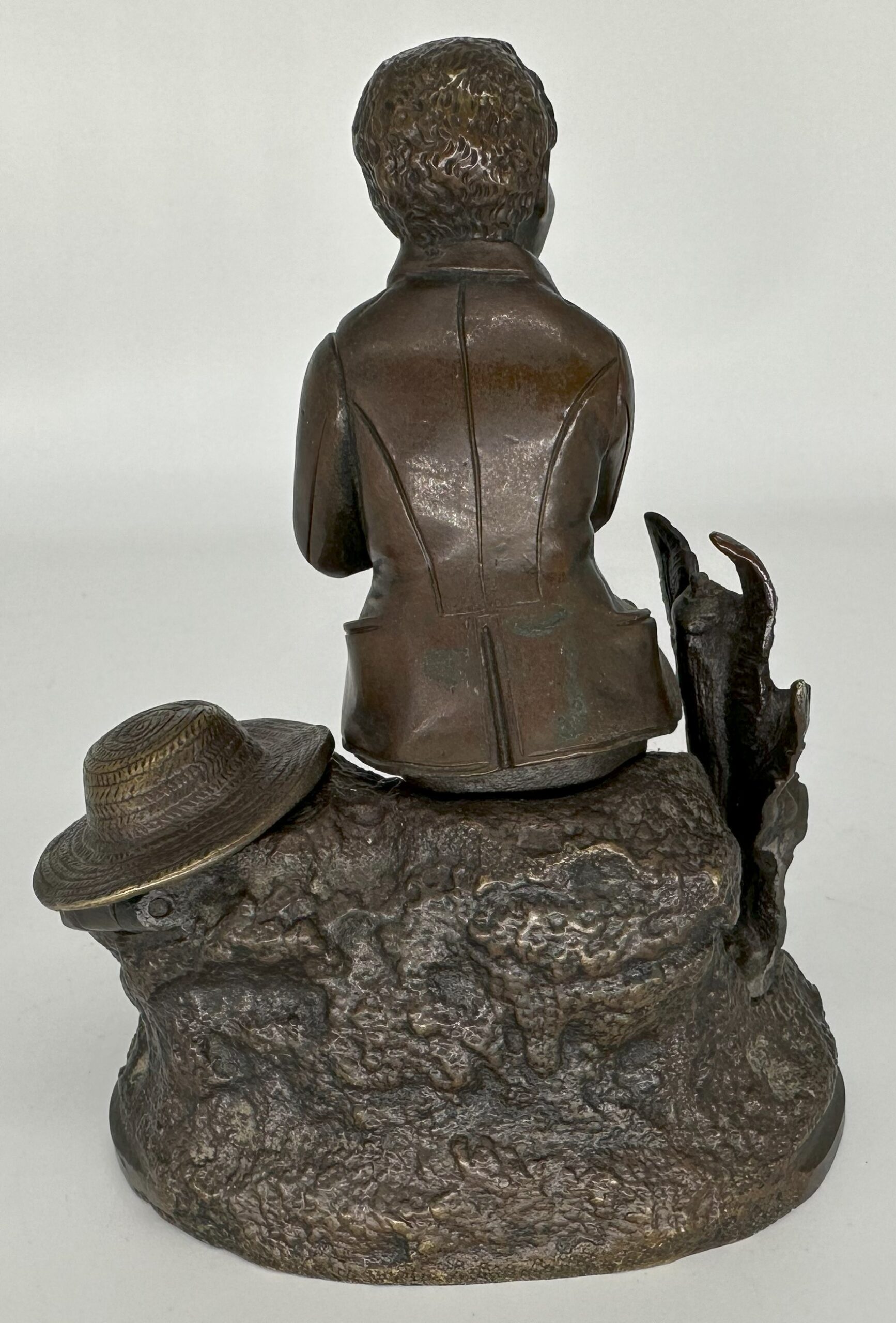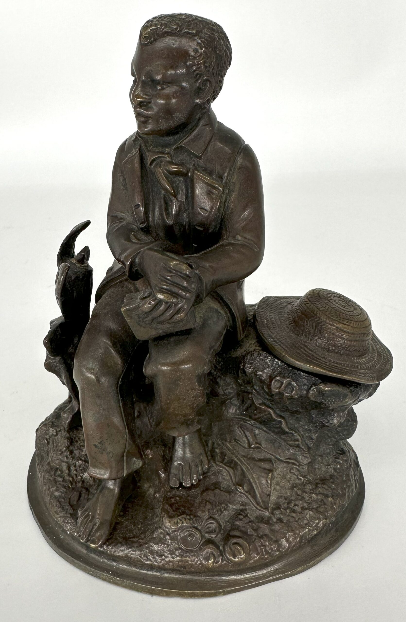 Two depictions of a bronze Uncle Tom inkwell are shown. The first shows Uncle sitting on a rock. His hat serves as a hinged lid which opens to access the inkwell. The second depiction includes Little Eva placing a garland of flowers around Uncle Tom.