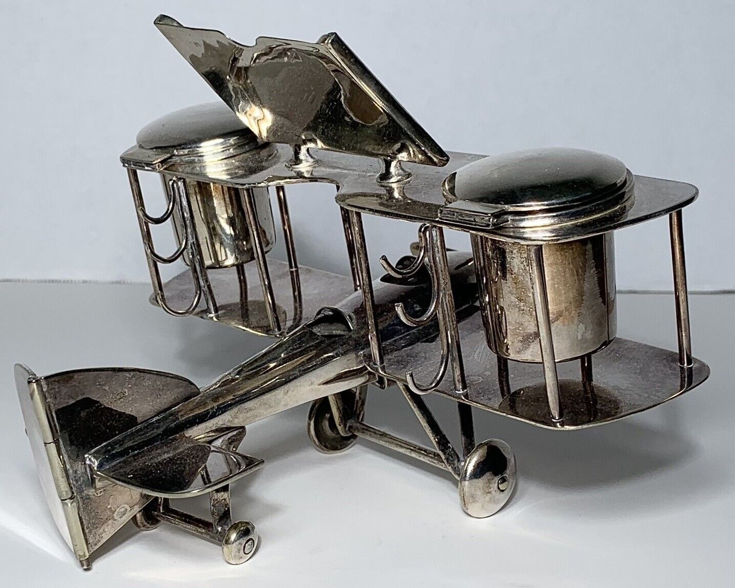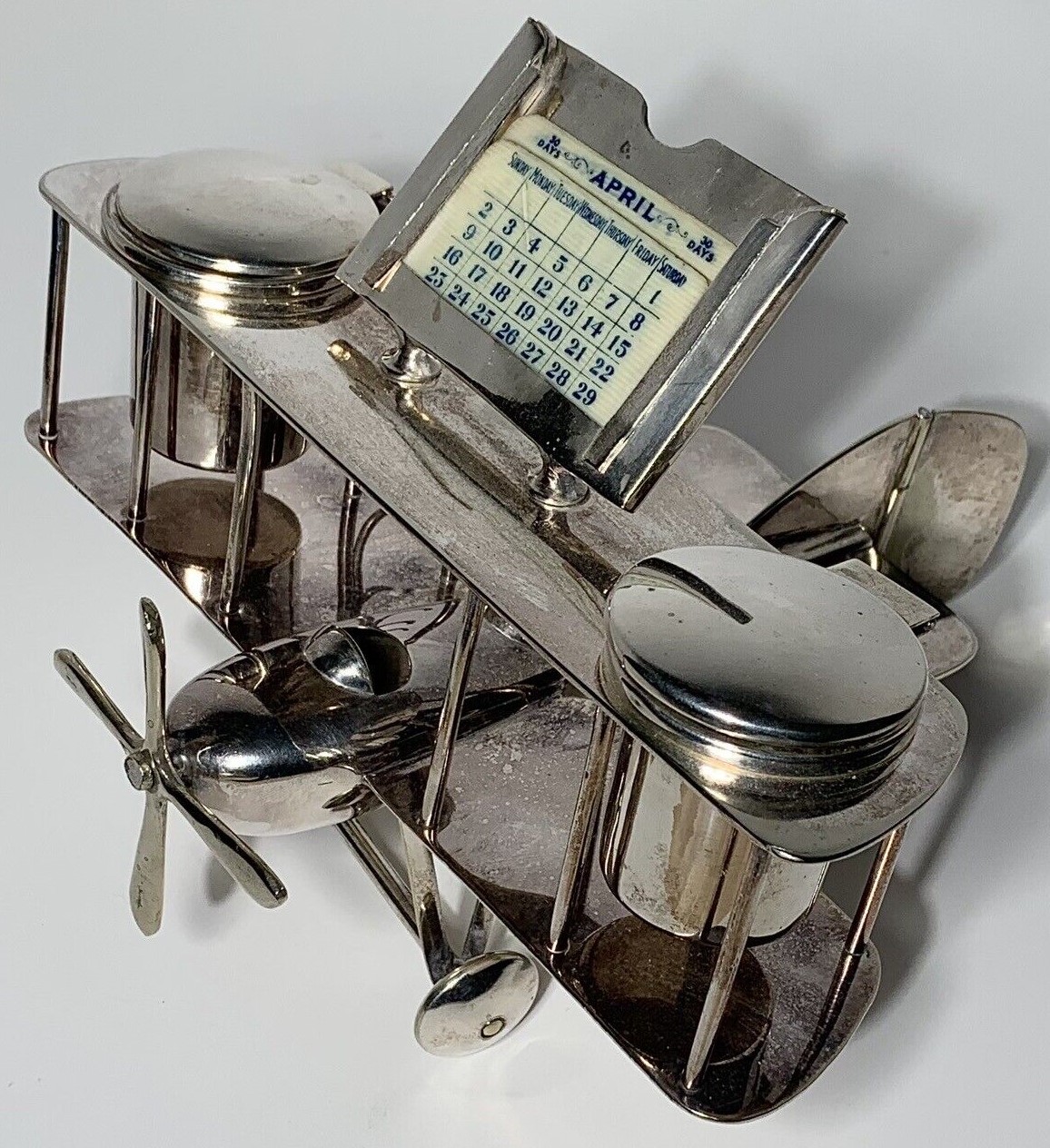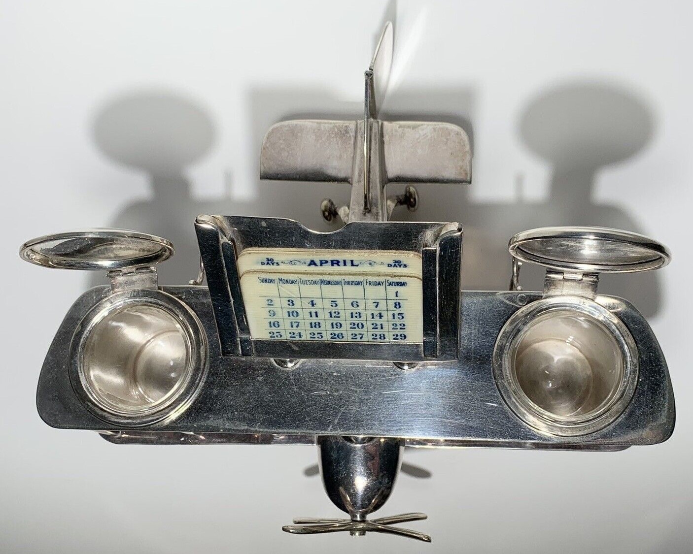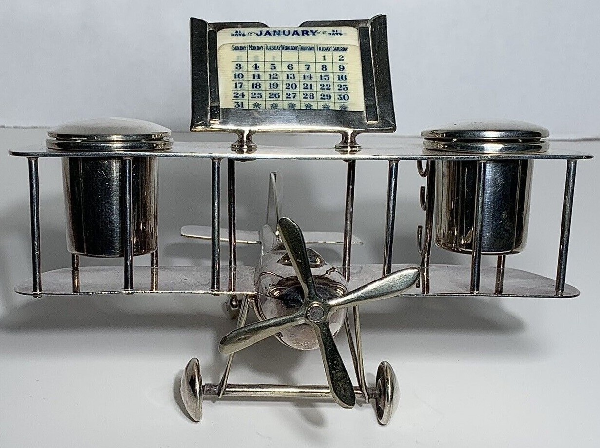 Chromed metal biplane fashioned as an inkstand. It includes a perpetual calendar, two inkwells, and hooks to hold three pens. An English registry mark is impressed on the tail.