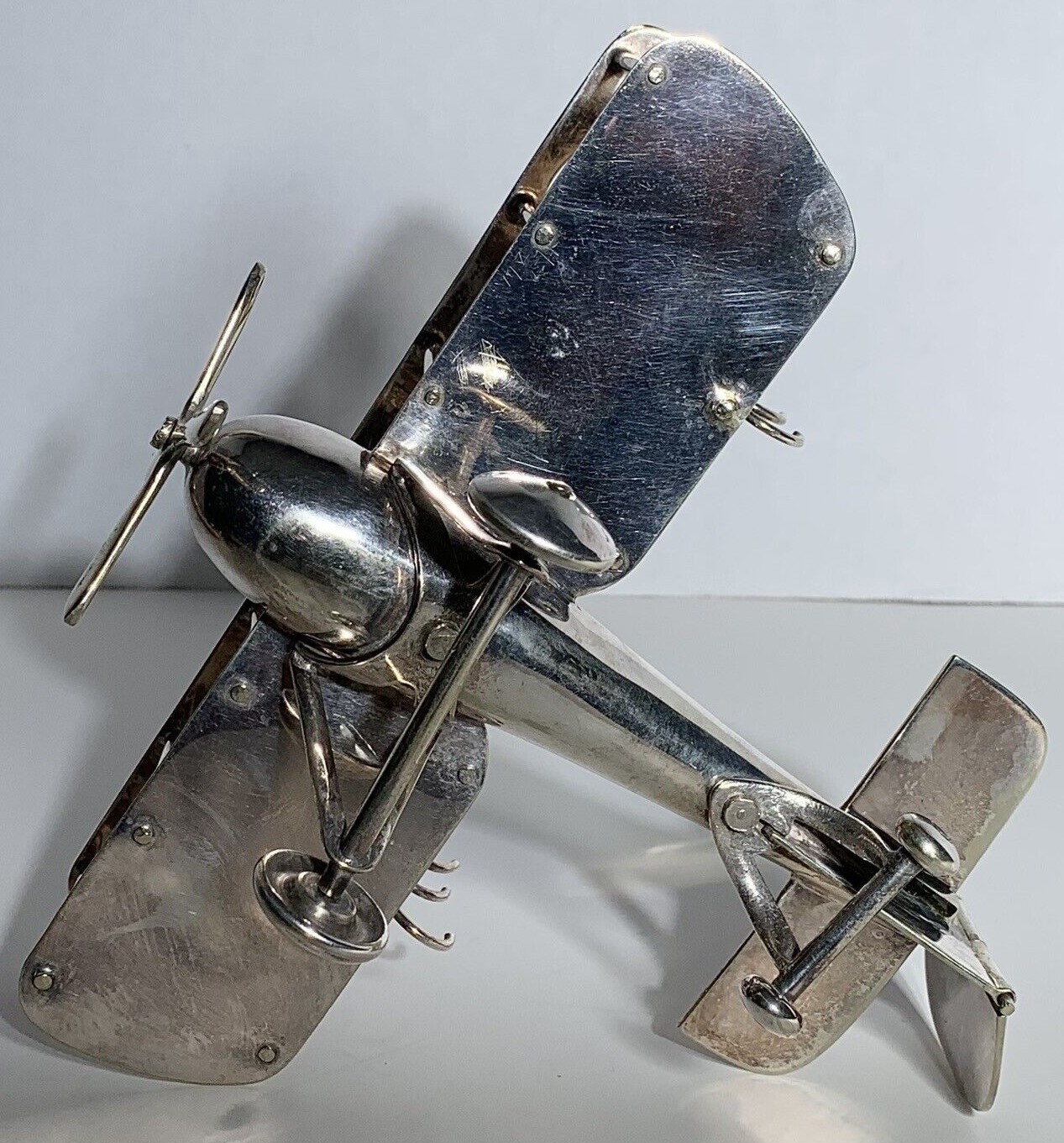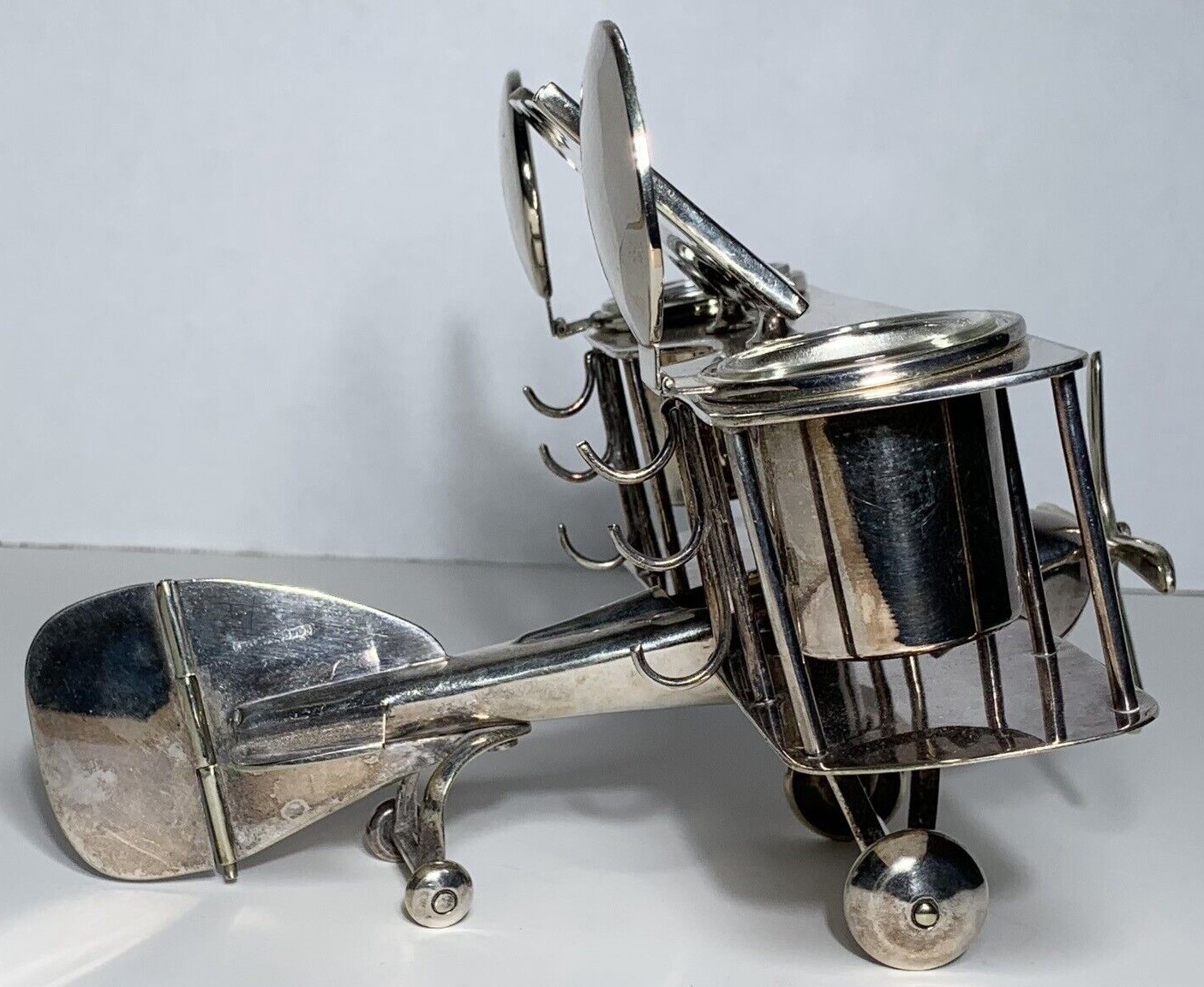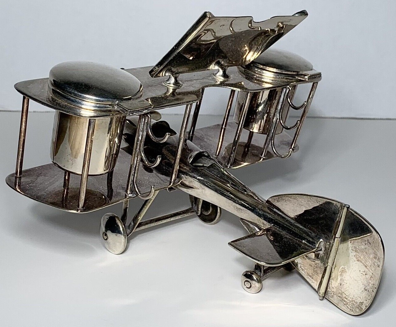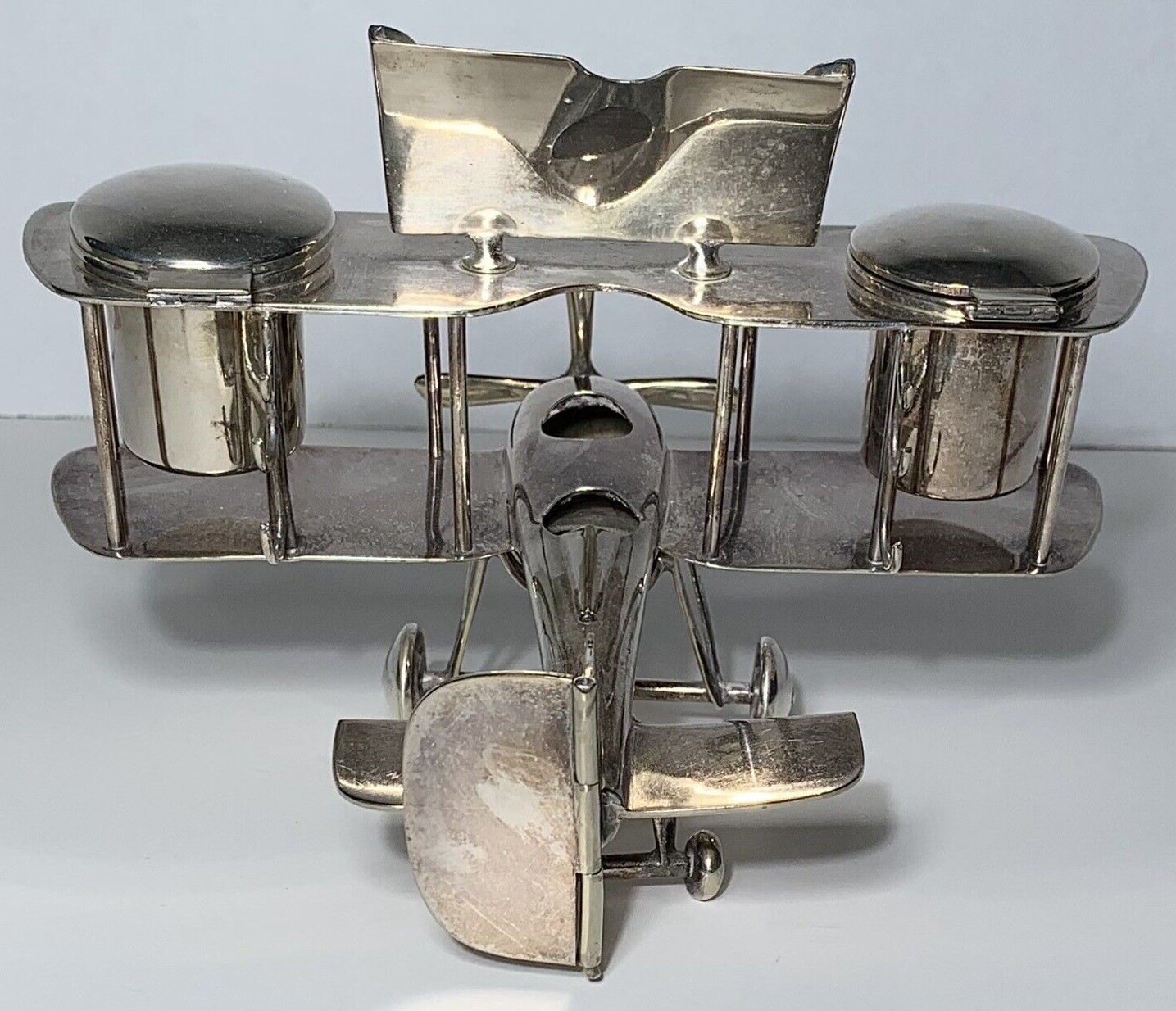 Chromed metal biplane fashioned as an inkstand. It includes a perpetual calendar, two inkwells, and hooks to hold three pens. An English registry mark is impressed on the tail.