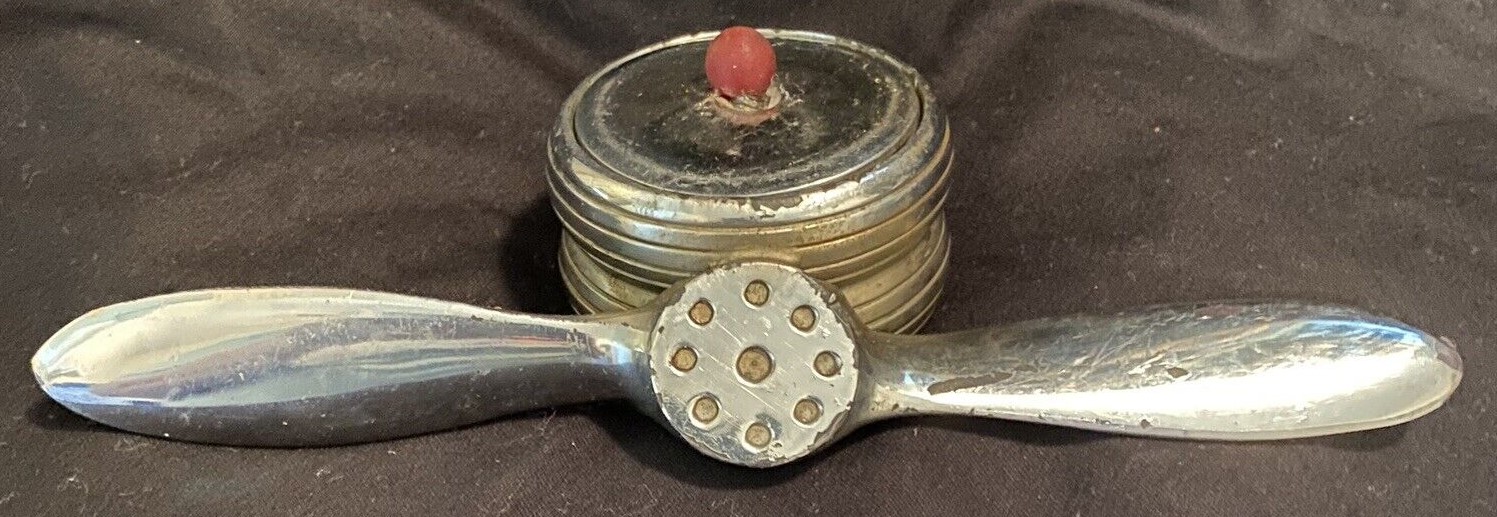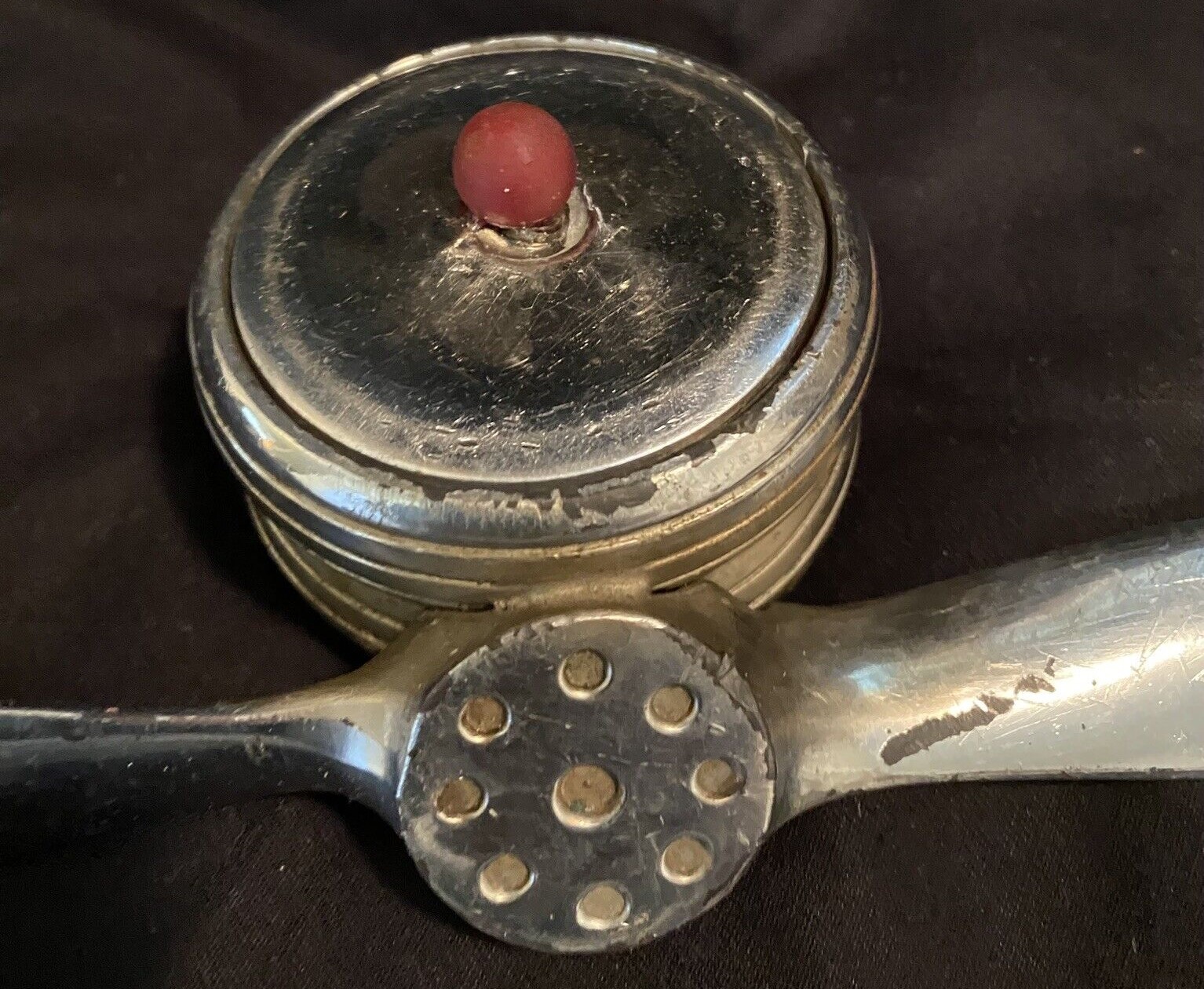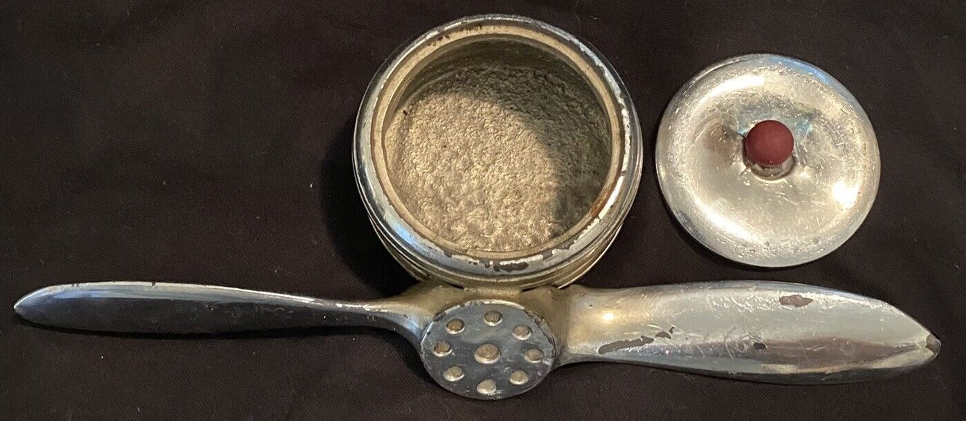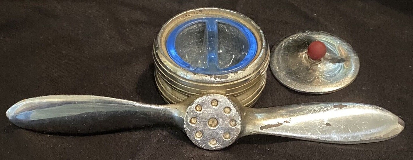 Airplane propeller inkstand with a blue glass divided insert. The inkwell has a lid with a red knob. The metal is chromed, though a bit of the chrome has flaked off.