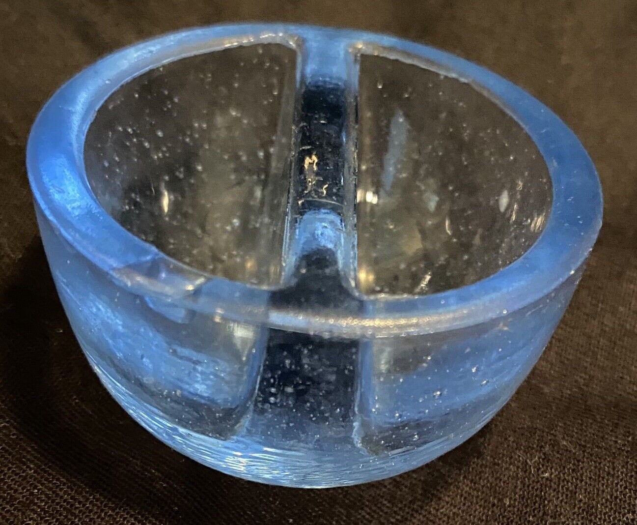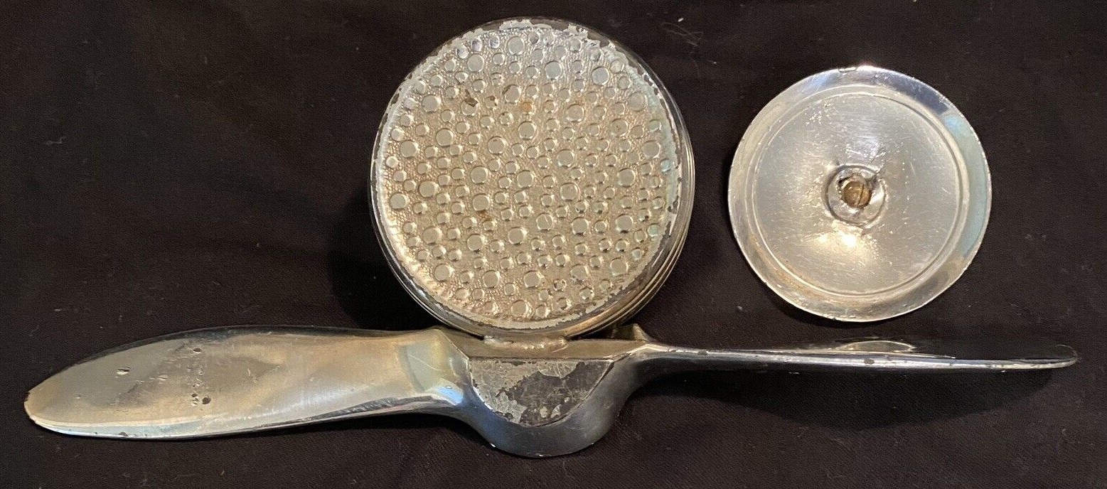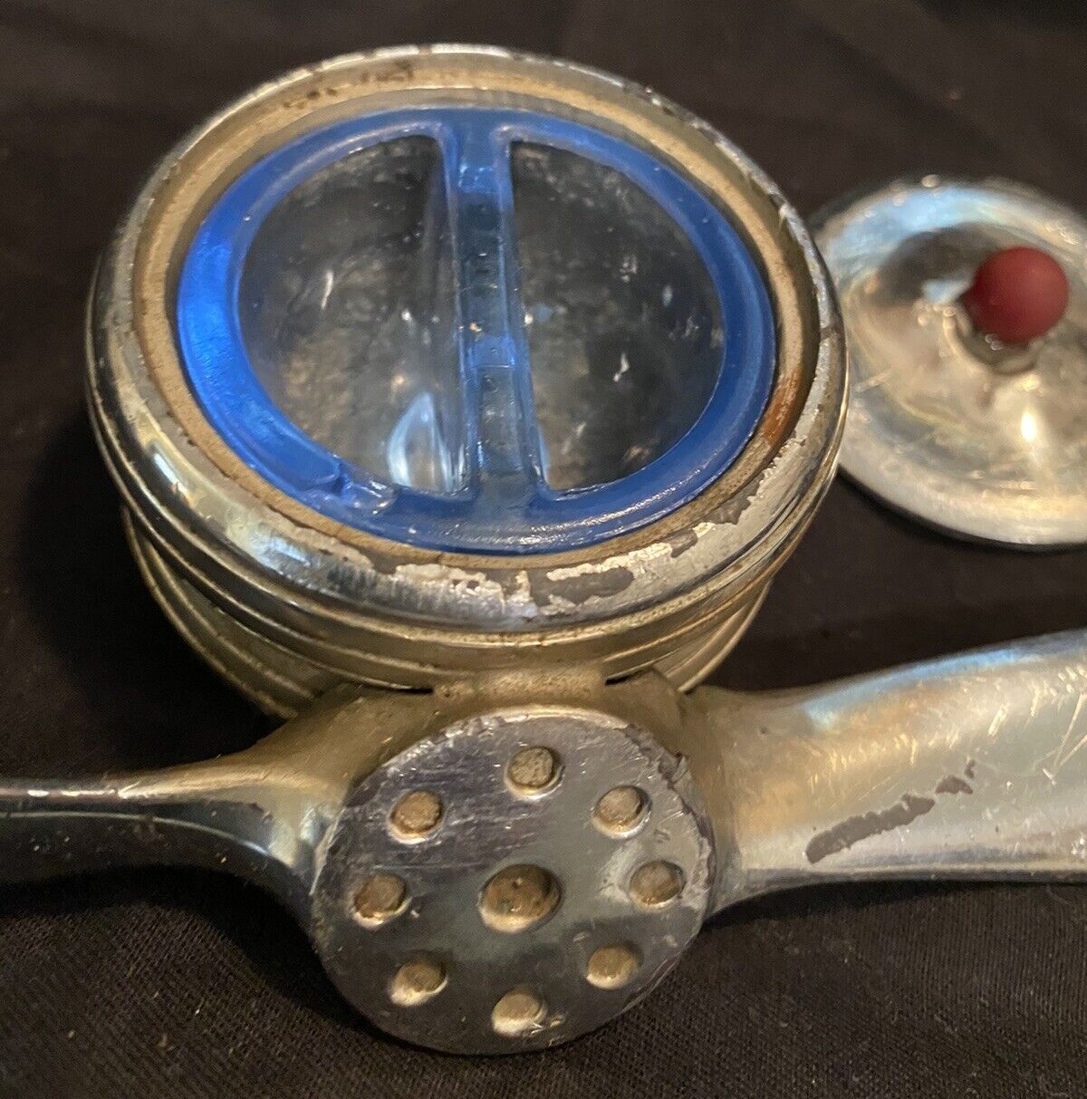Airplane propeller inkstand with a blue glass divided insert. The inkwell has a lid with a red knob. The metal is chromed, though a bit of the chrome has flaked off.