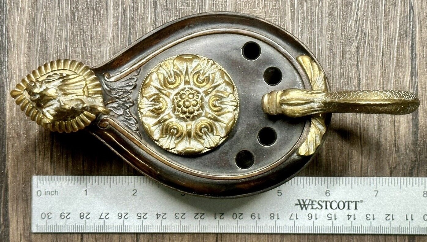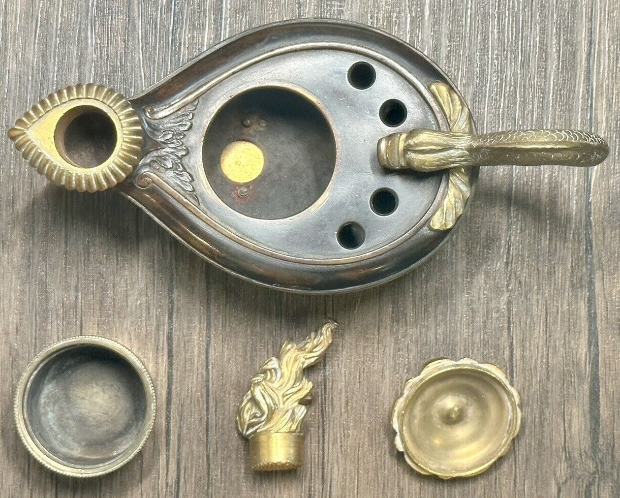 A figural inkstand in the form of an ancient oil lamp like Aladdin’s lamp. It has a serpentine handle and a flame coming out of its spout. The removable flame is a wax seal. The lid covering the inkwell is a separate piece. There are four holes for pens.