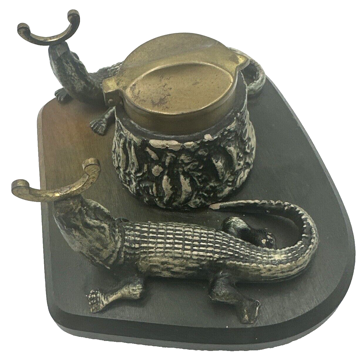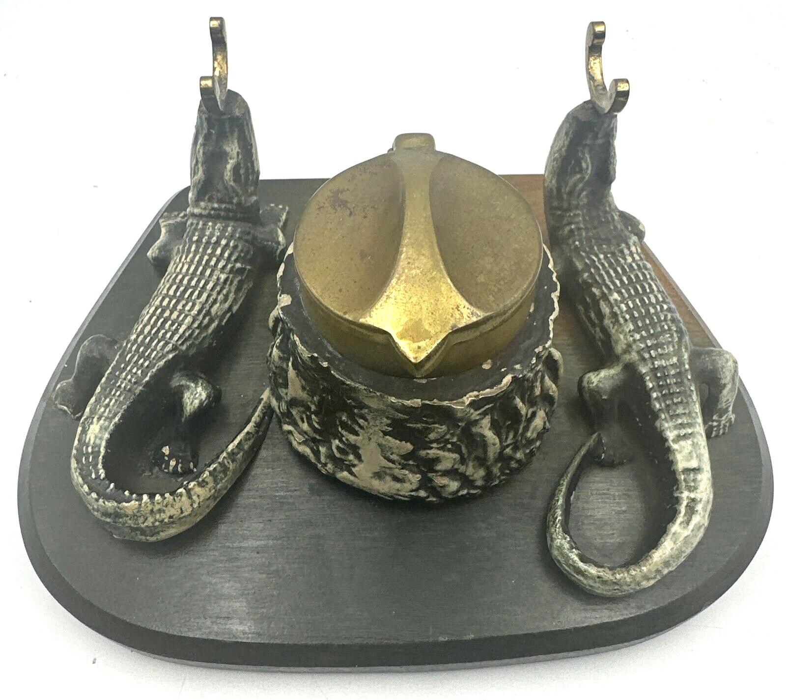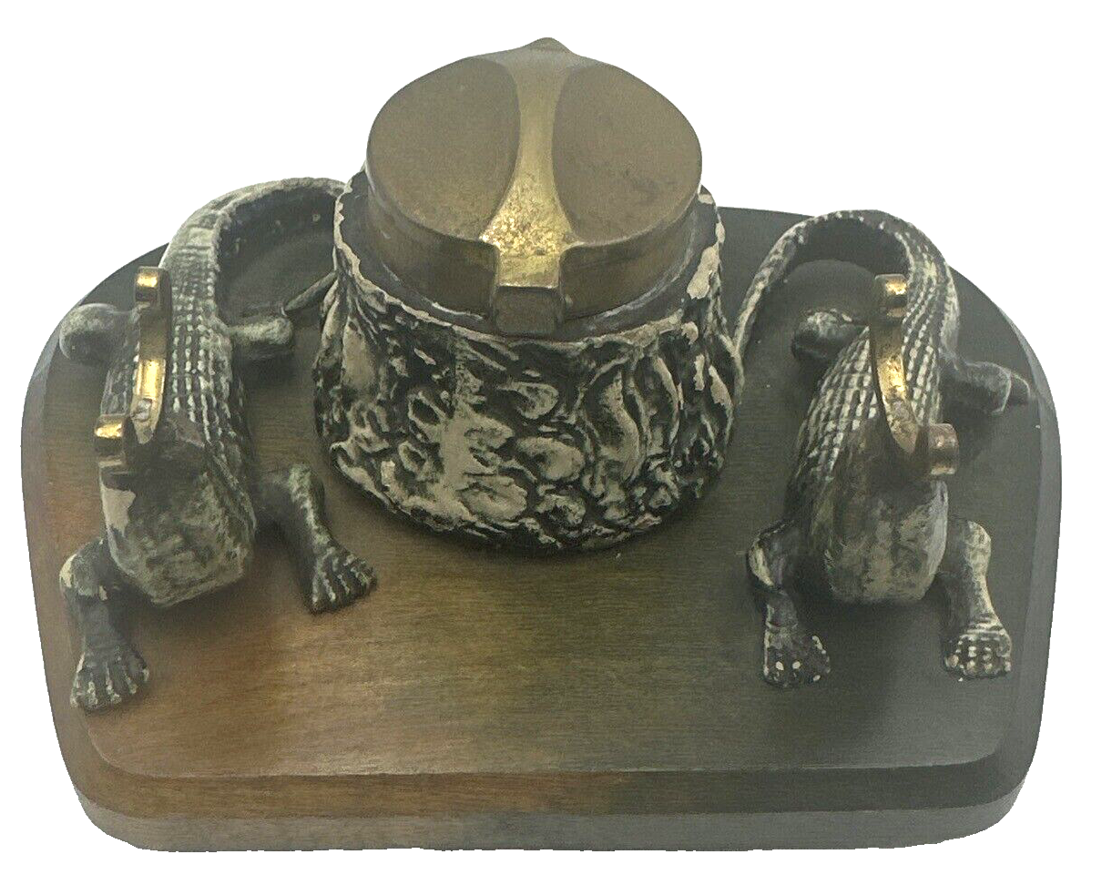 Careful when you pick up that pen! Two alligators supporting the pen holder may chomp down on your hand! This inkstand features, in addition to the composition gators, includes an inkwell with hinged brass lid covering the stump inkwell and brass hooks to hold a pen, all on a wood base.