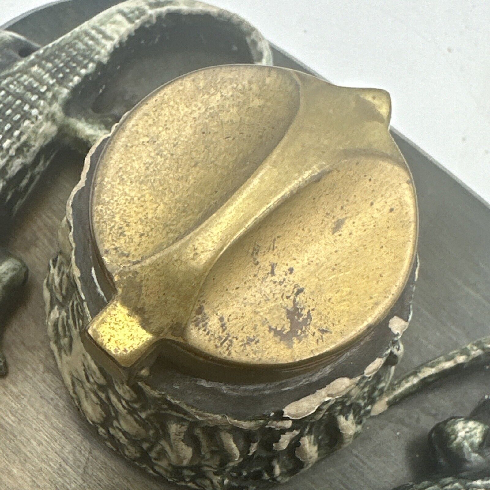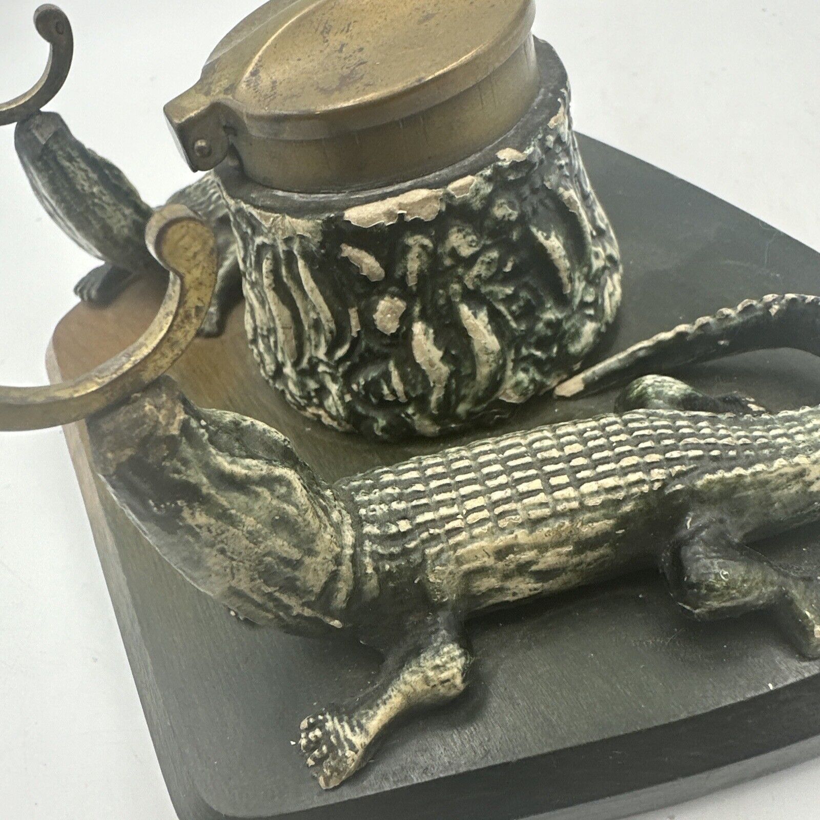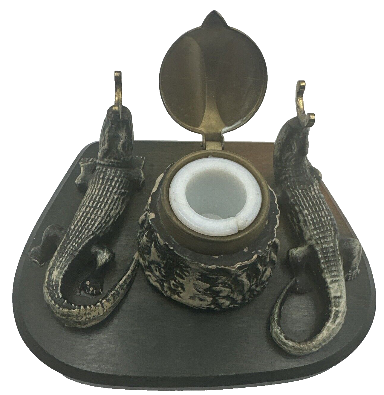 Careful when you pick up that pen! Two alligators supporting the pen holder may chomp down on your hand! This inkstand features, in addition to the composition gators, includes an inkwell with hinged brass lid covering the stump inkwell and brass hooks to hold a pen, all on a wood base.