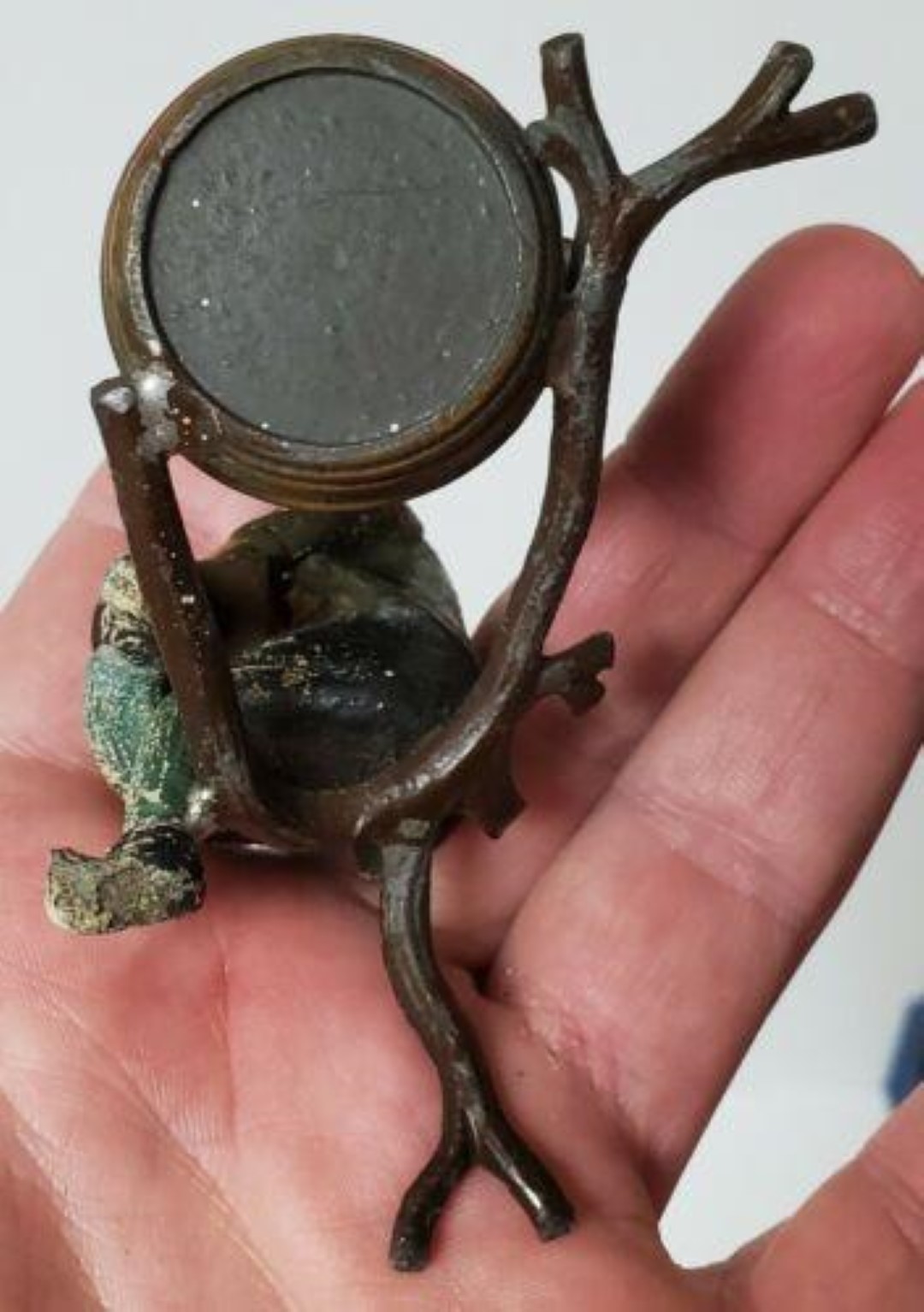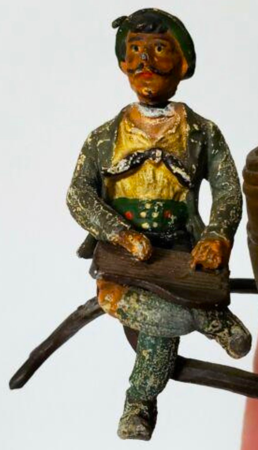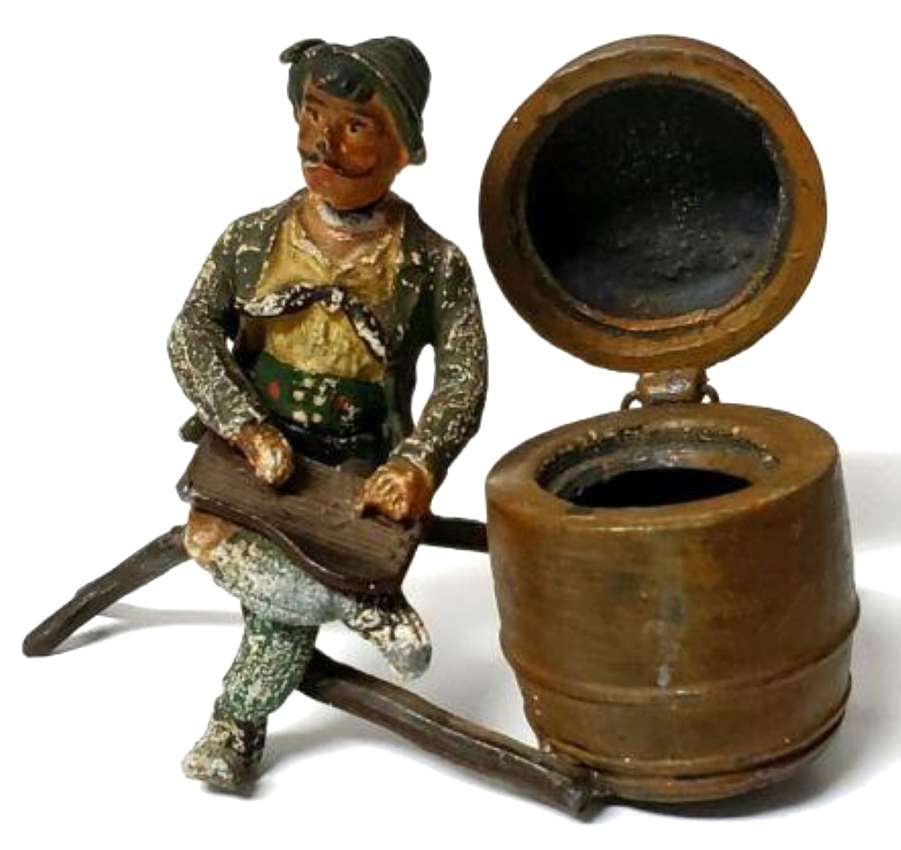 A man dressed in Alpine garb, playing a zither, sits next to a barrel, the inkwell (missing insert). The man’s head bobbles when the piece is moved.