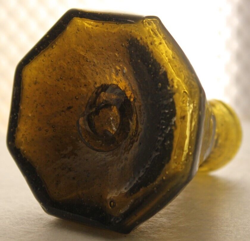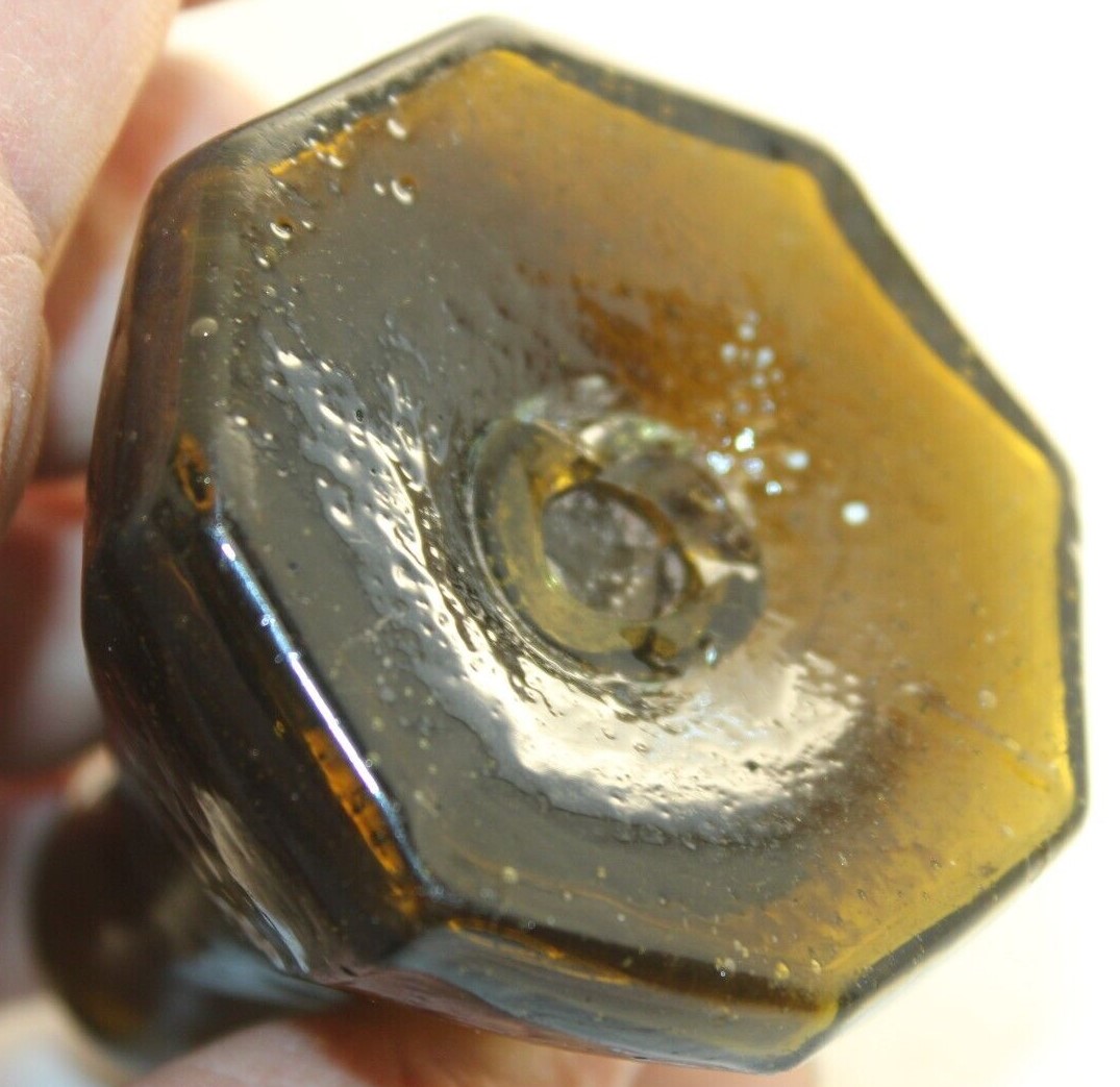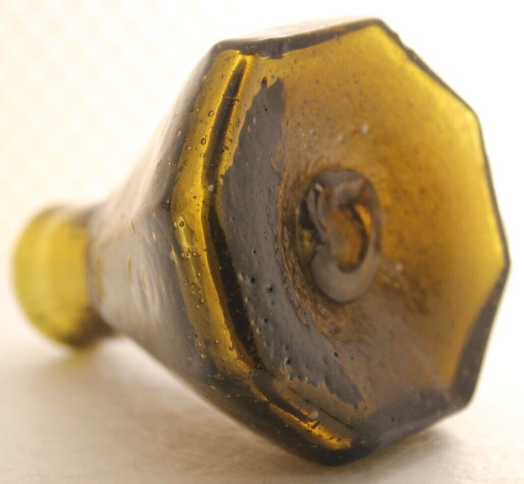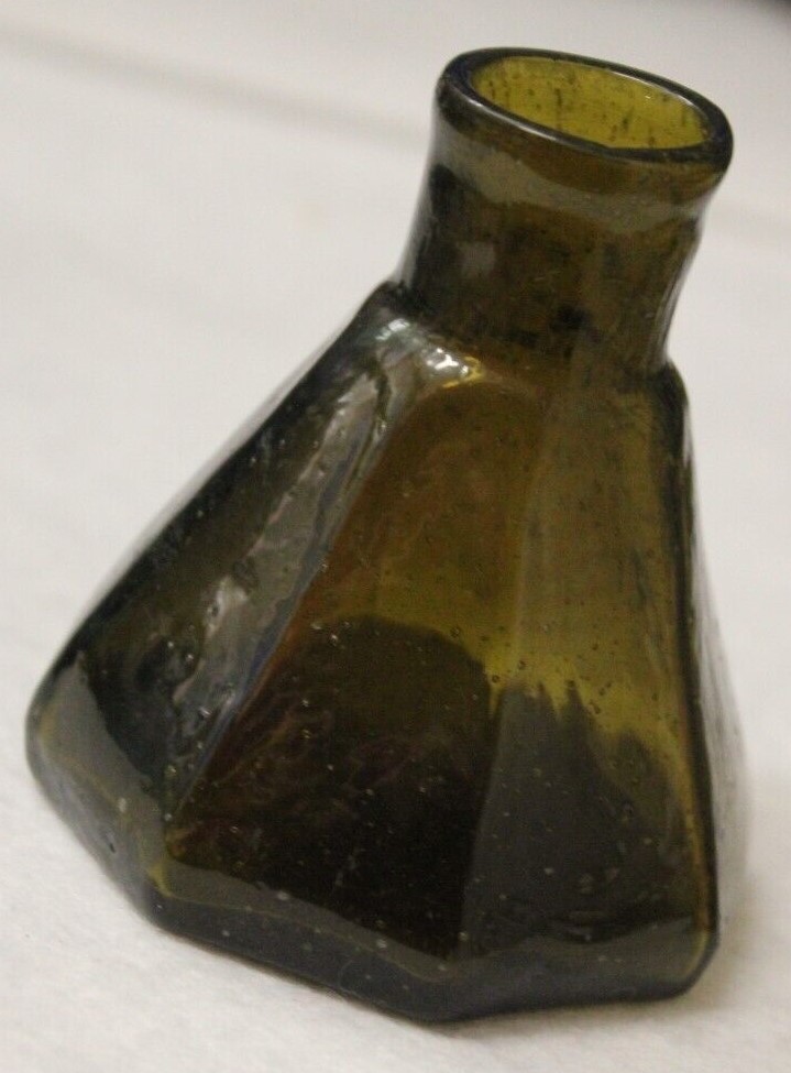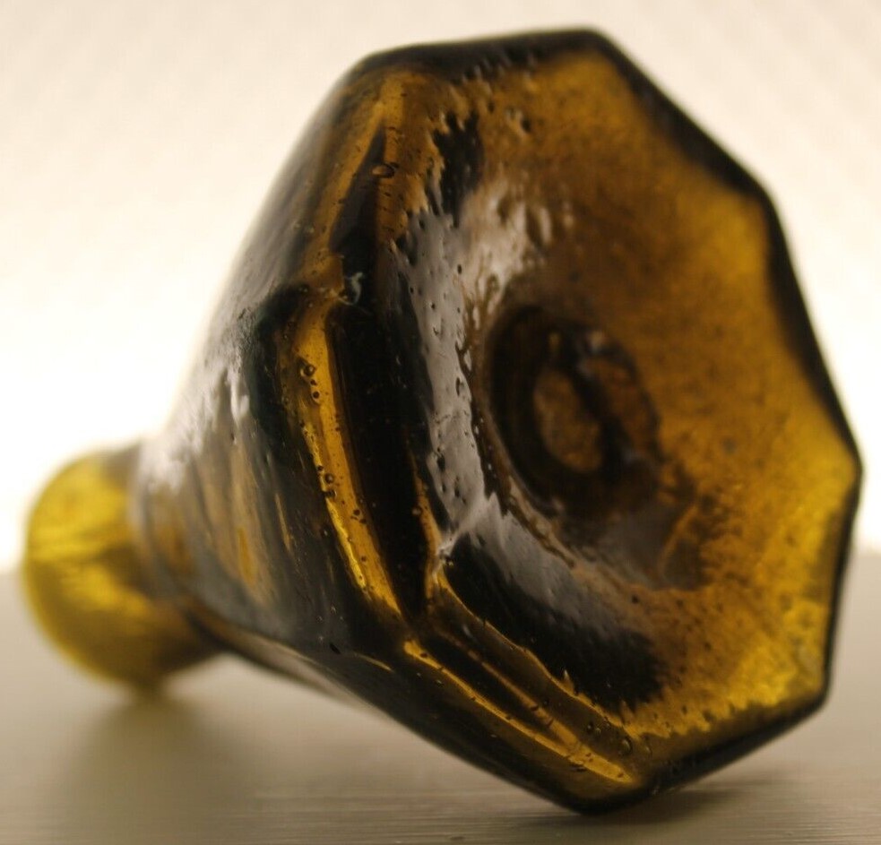 This Stoddard (New Hampshire) 8-sided glass umbrella ink bottle with a tiny tubular pontil was blown in an unusual color: olive-amber.