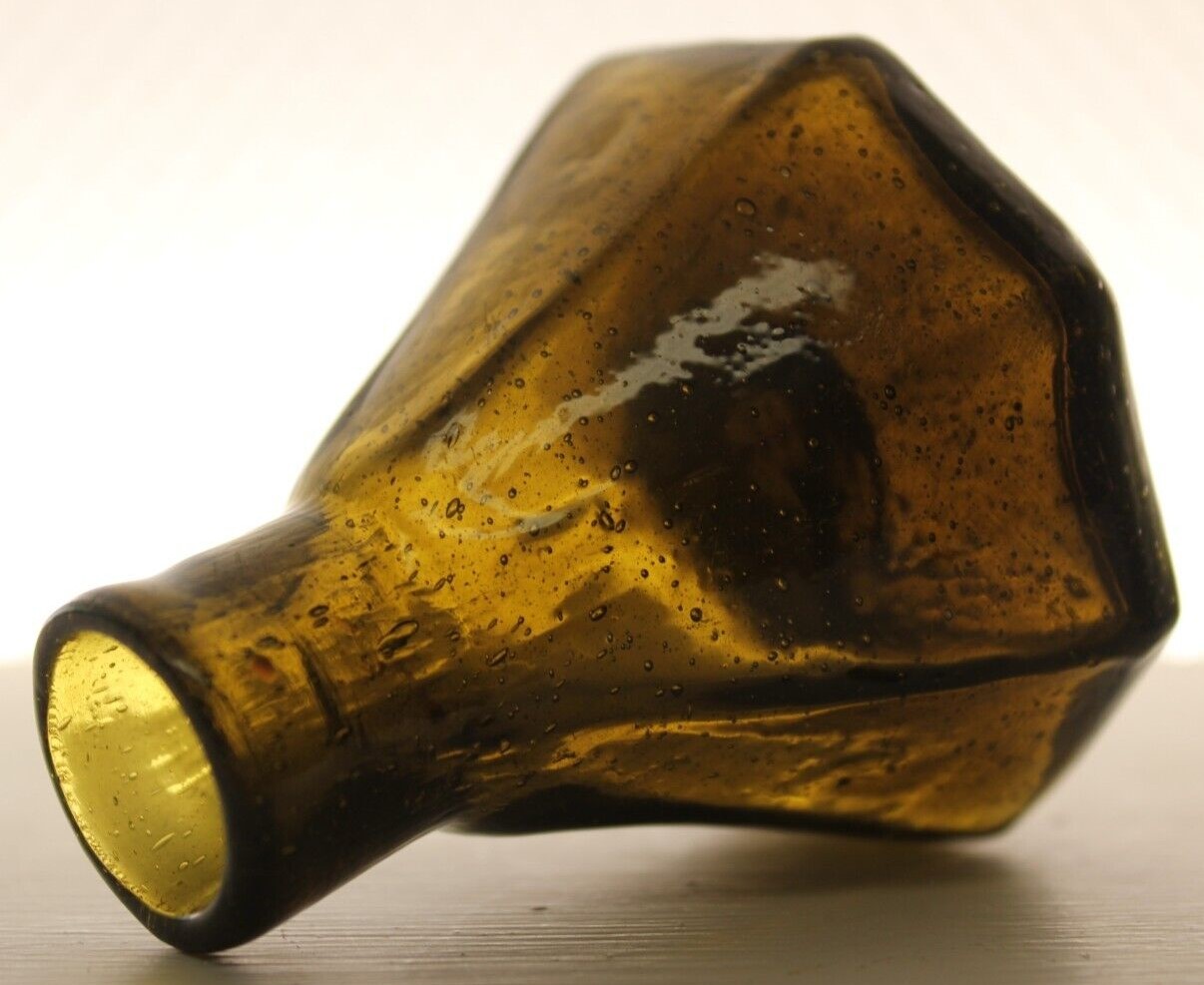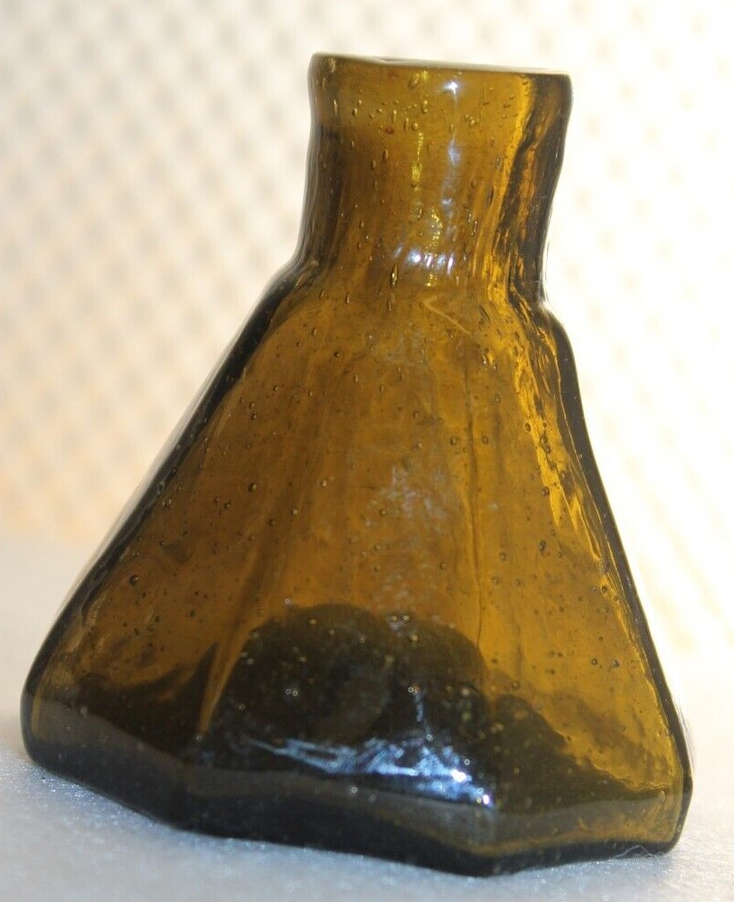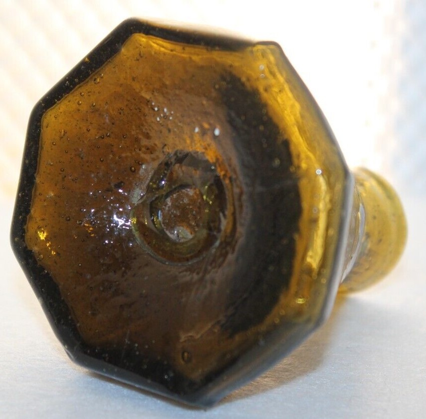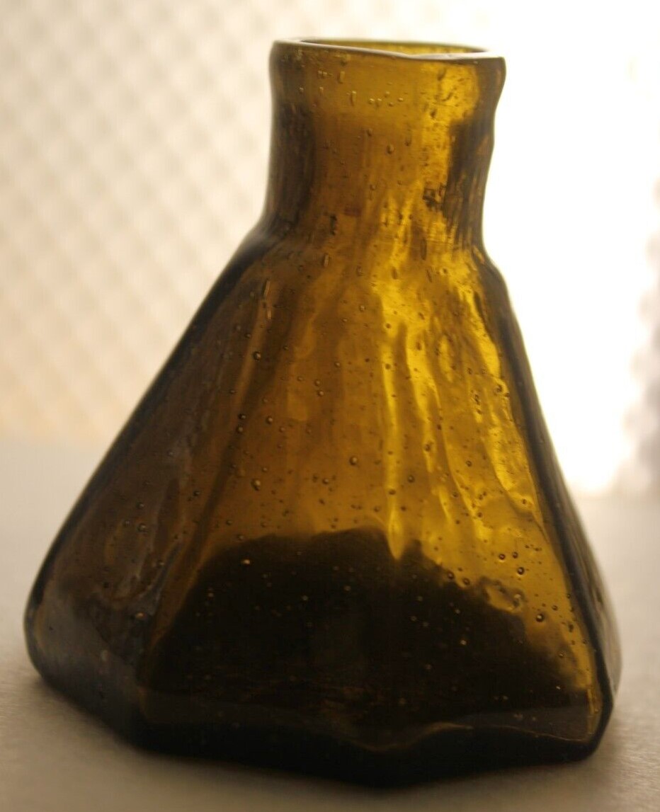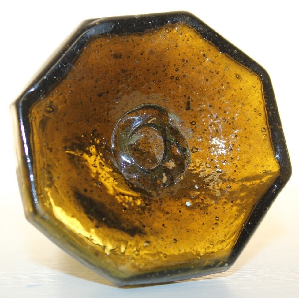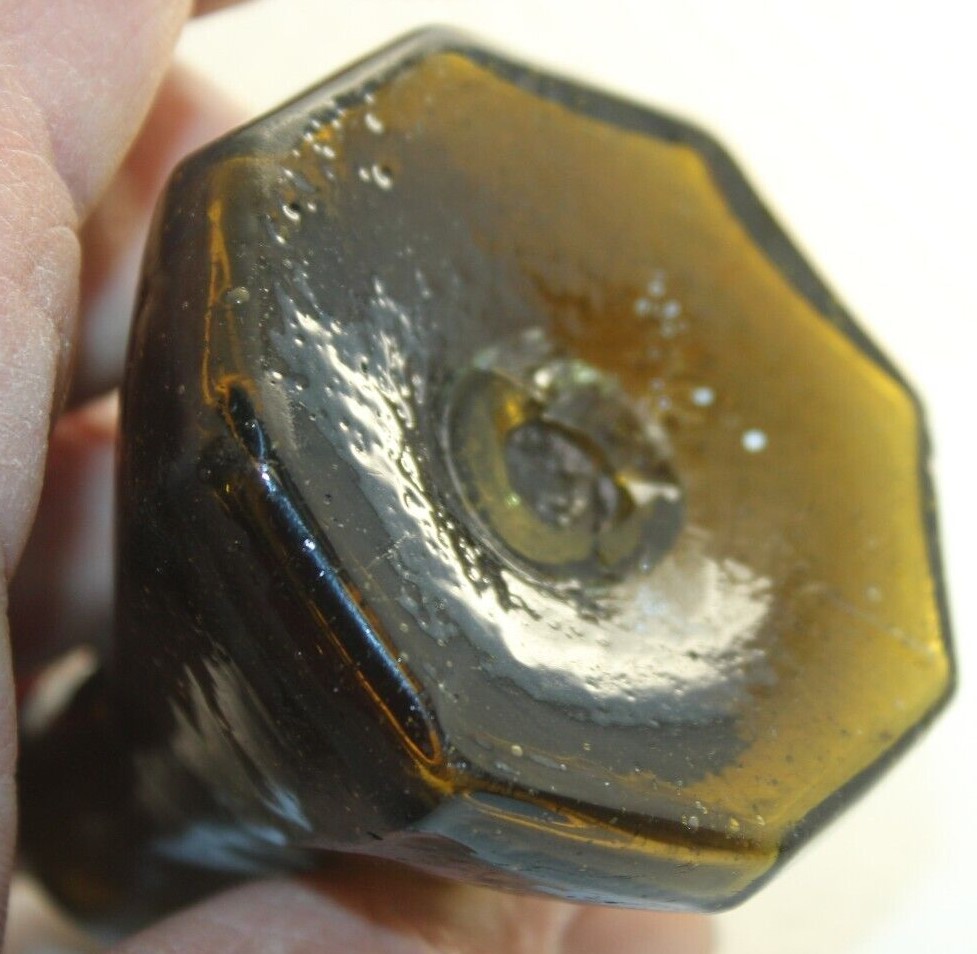 This Stoddard (New Hampshire) 8-sided glass umbrella ink bottle with a tiny tubular pontil was blown in an unusual color: olive-amber.