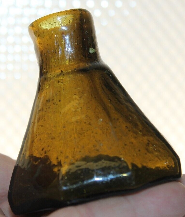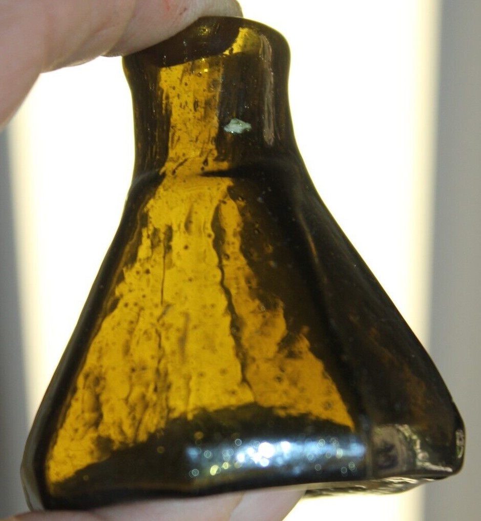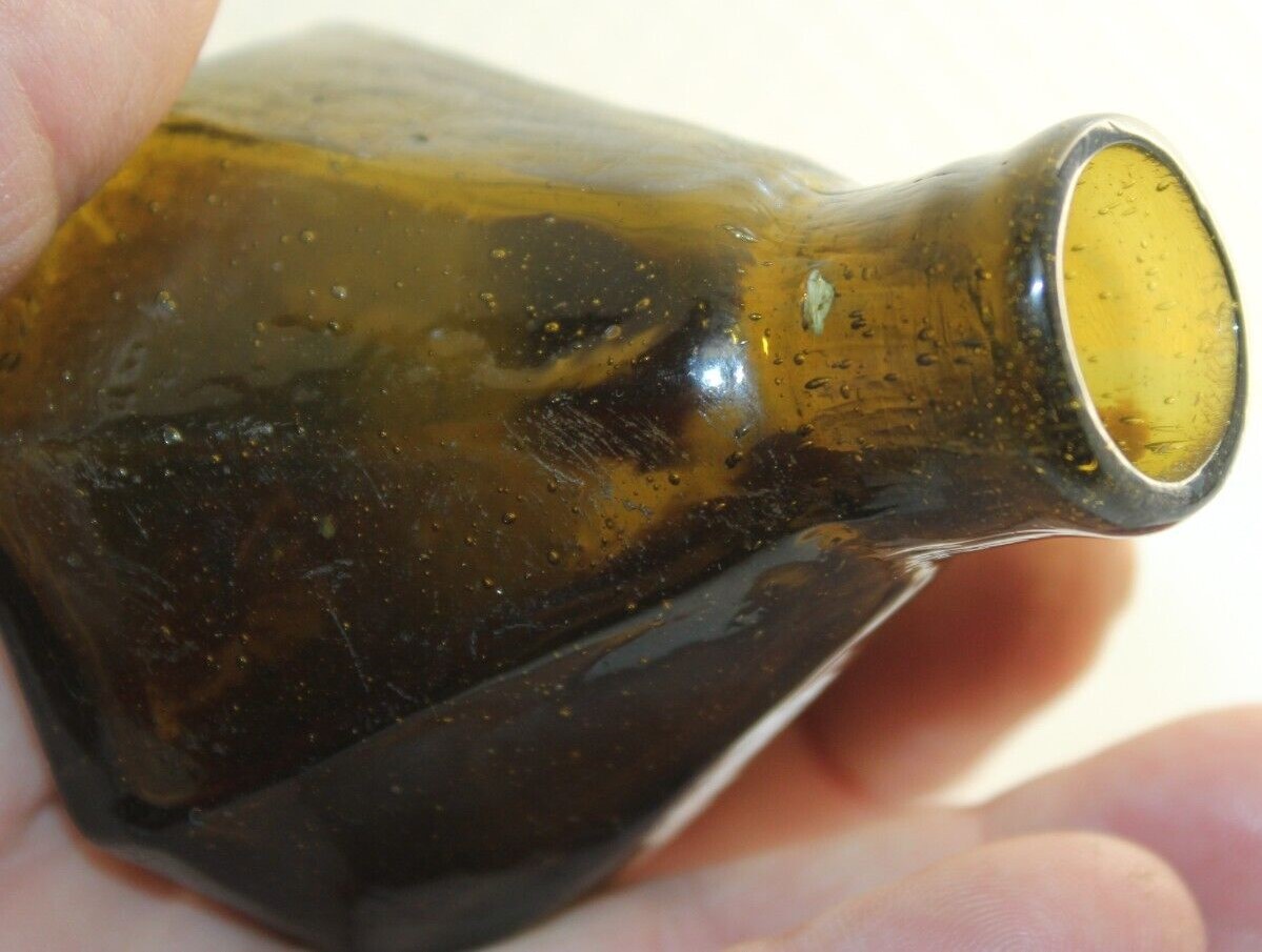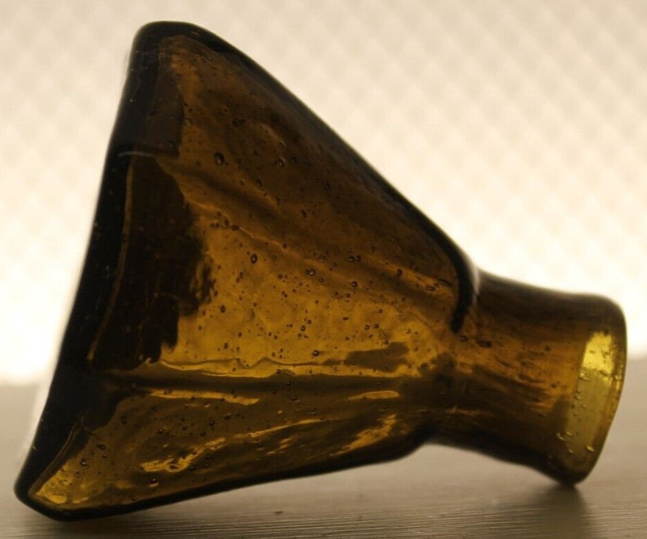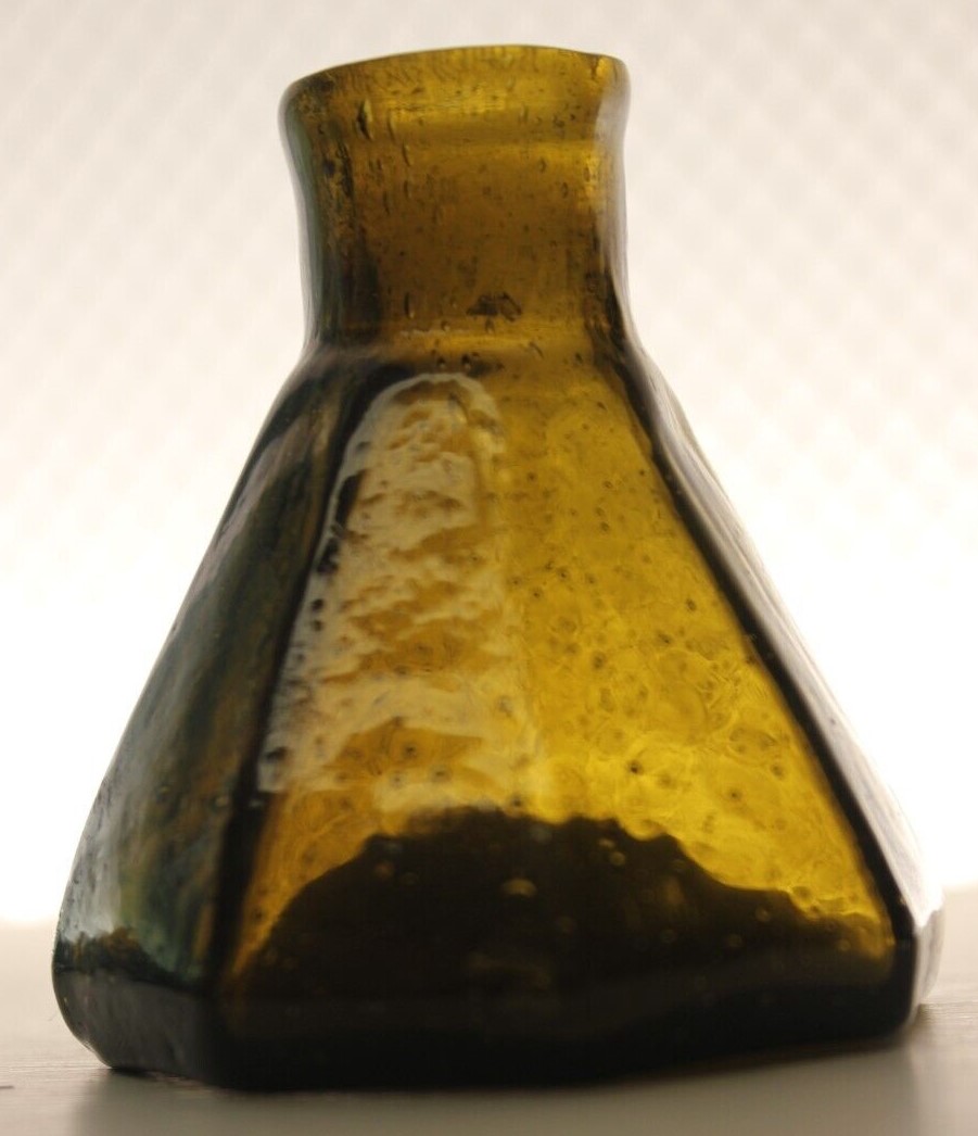 This Stoddard (New Hampshire) 8-sided glass umbrella ink bottle with a tiny tubular pontil was blown in an unusual color: olive-amber.