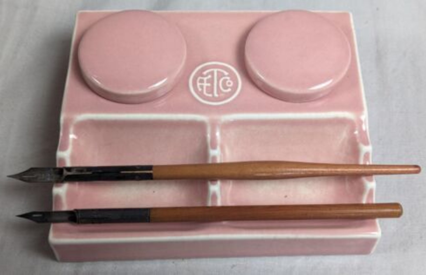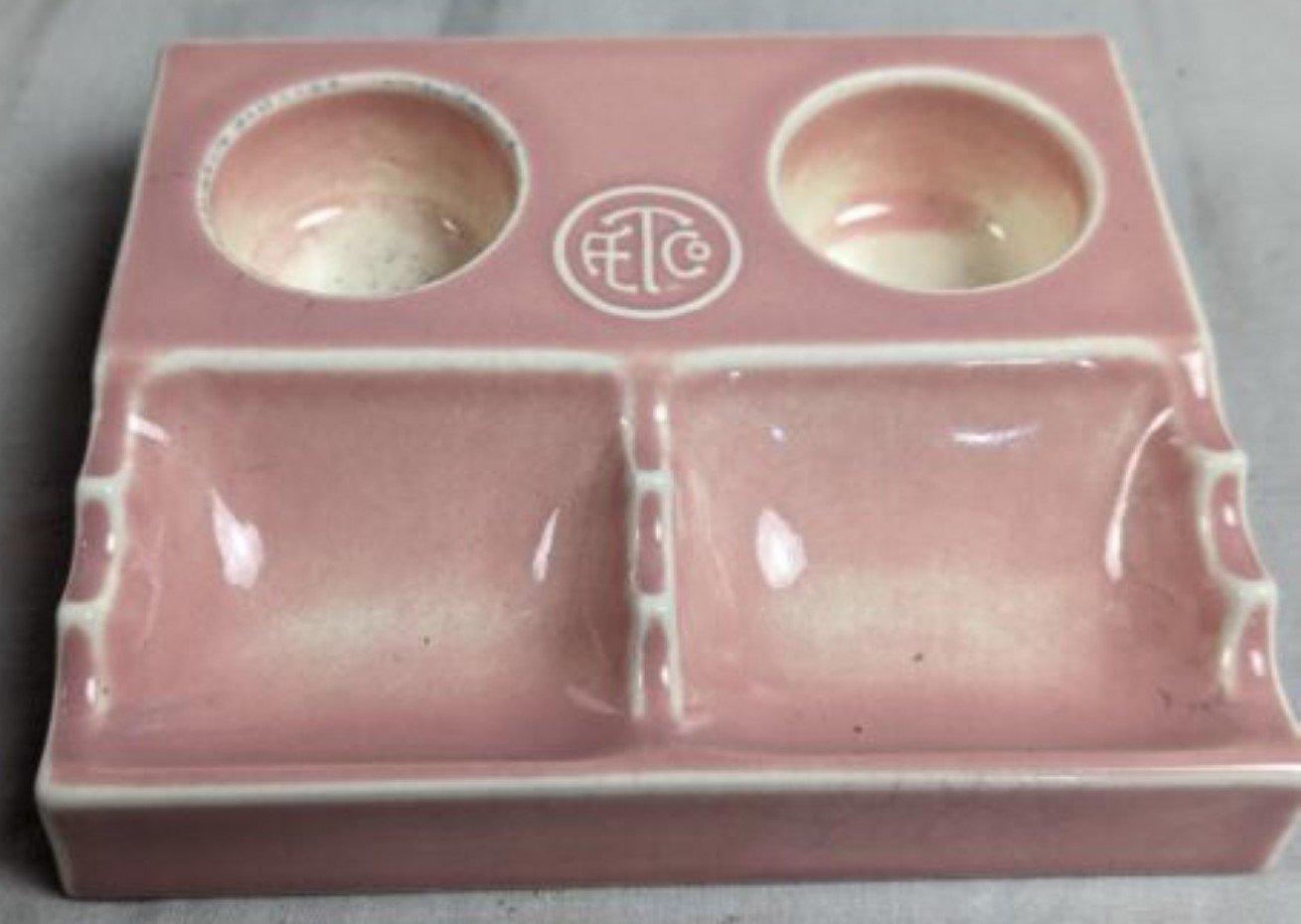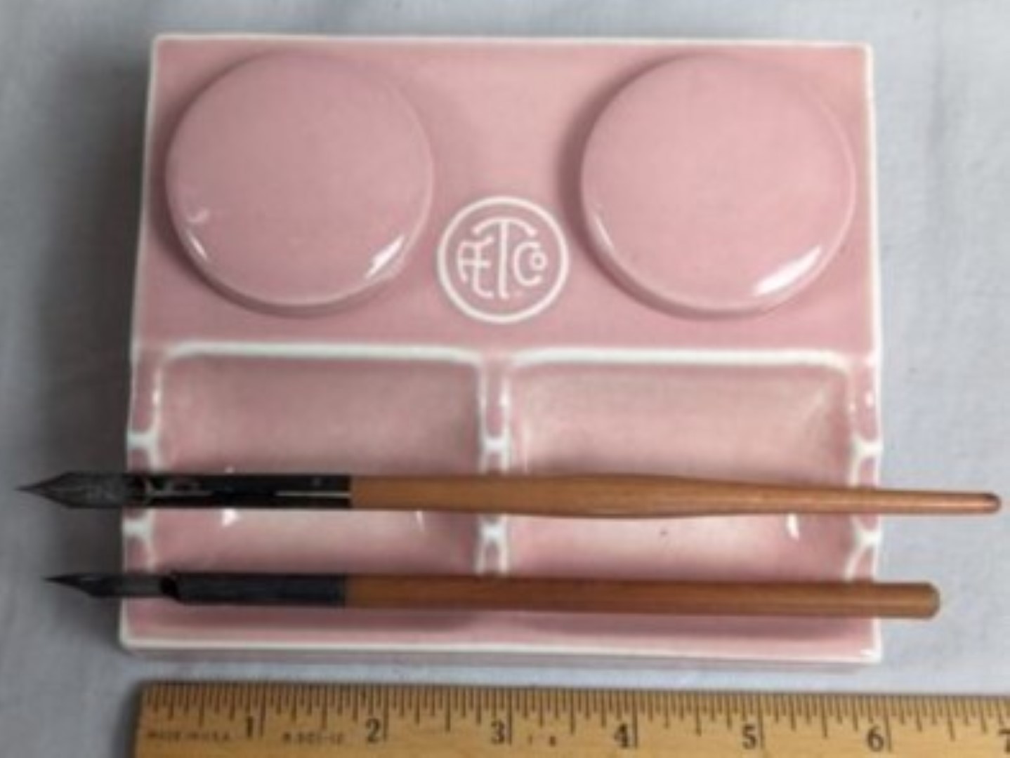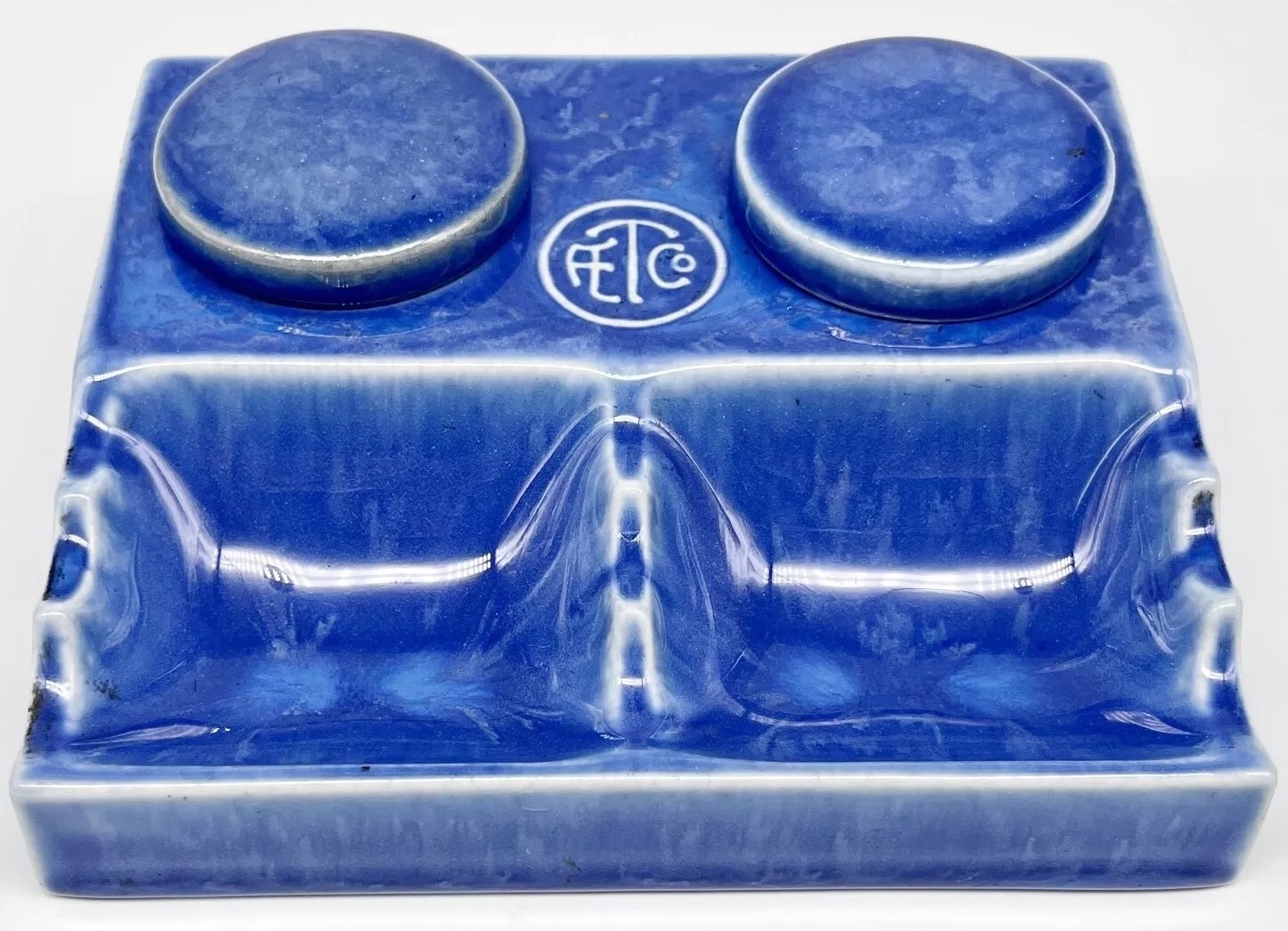 This advertising piece was made for the American Encaustic Tile Co. (AETCO) in Zanesville, Ohio. In between two inkwells with removeable lids is the AETCO logo within a circle. The area below the notches for holding up to three pens serves for storage of implements. Two examples – one pink, one blue – are pictured.