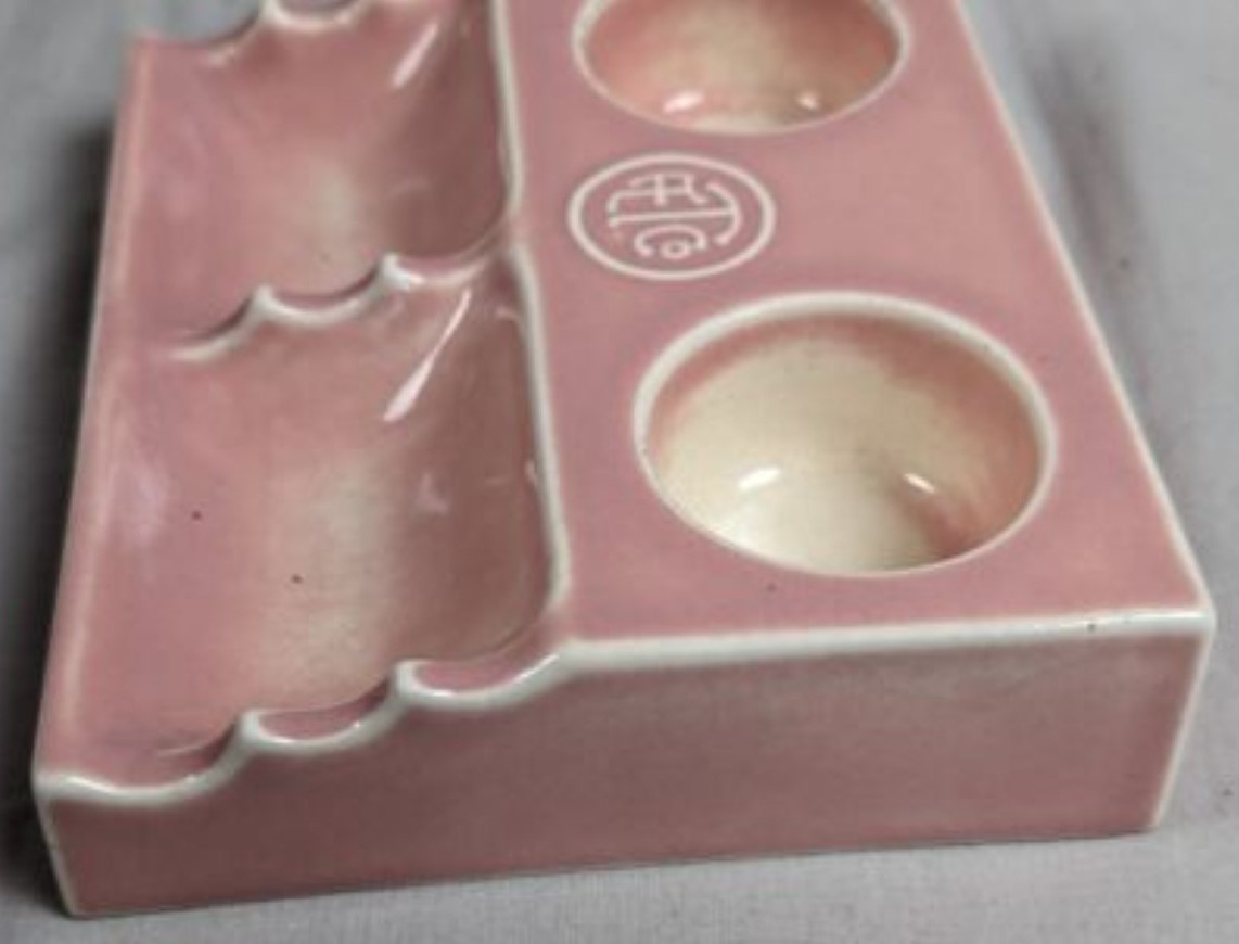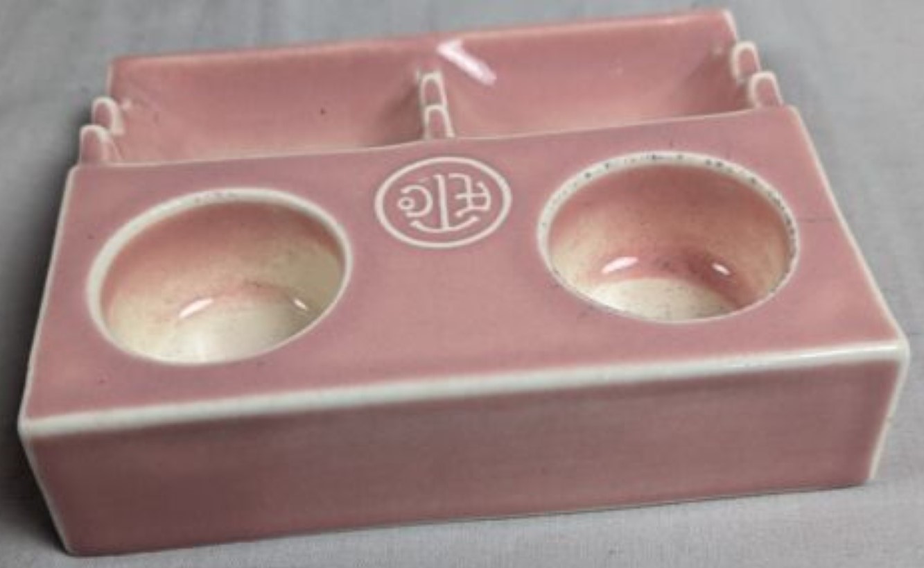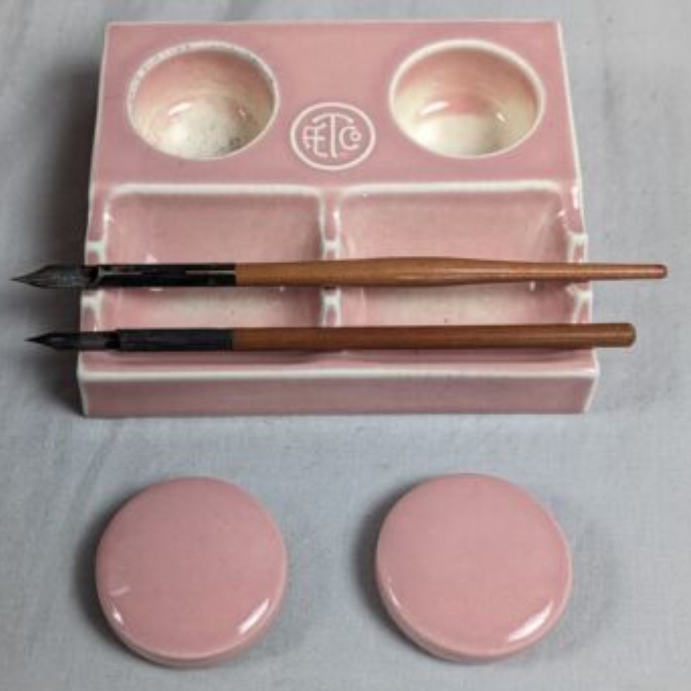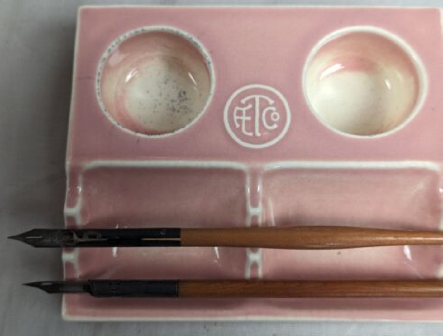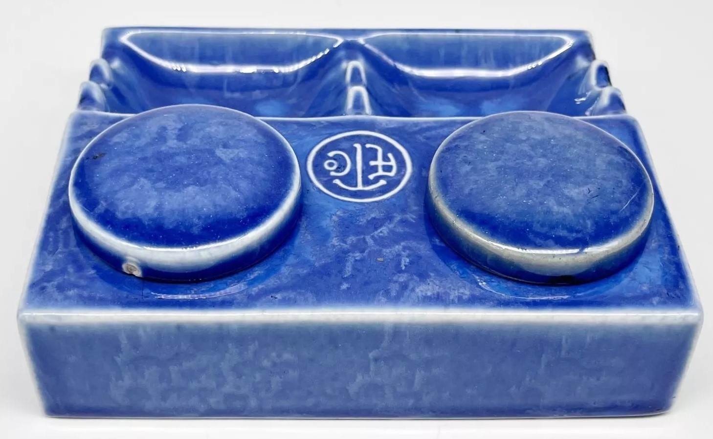 This advertising piece was made for the American Encaustic Tile Co. (AETCO) in Zanesville, Ohio. In between two inkwells with removeable lids is the AETCO logo within a circle. The area below the notches for holding up to three pens serves for storage of implements. Two examples – one pink, one blue – are pictured.