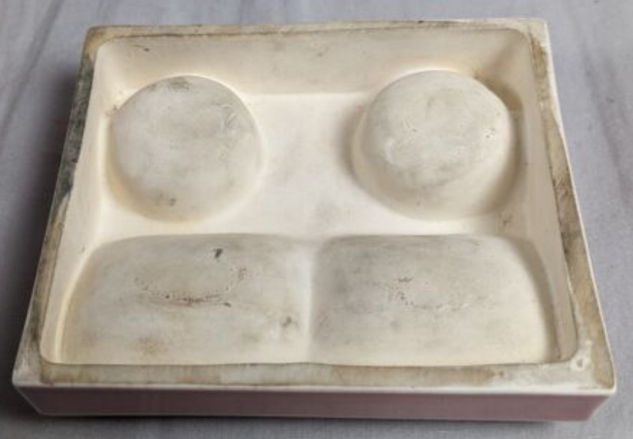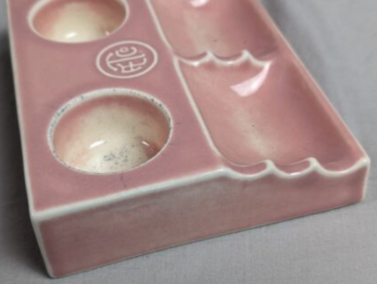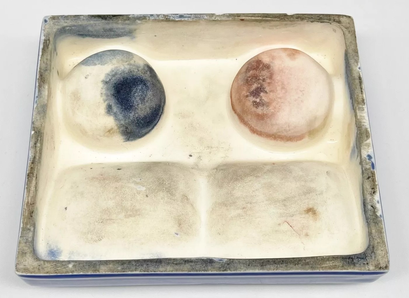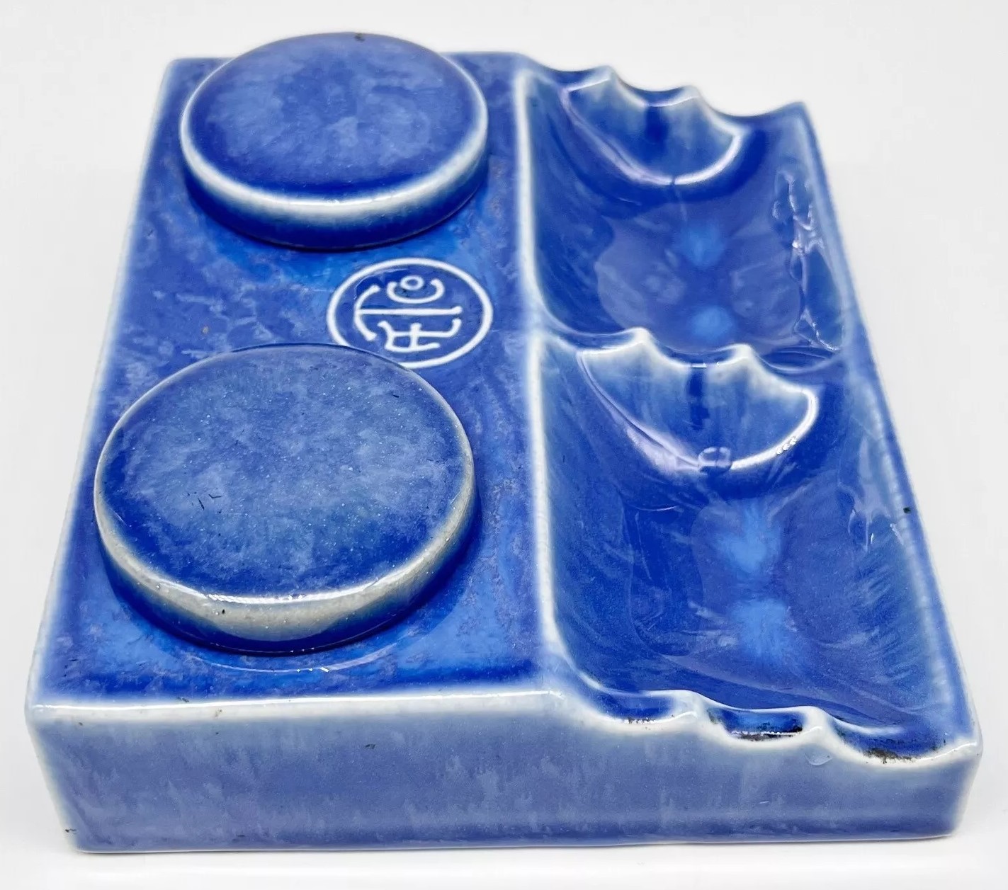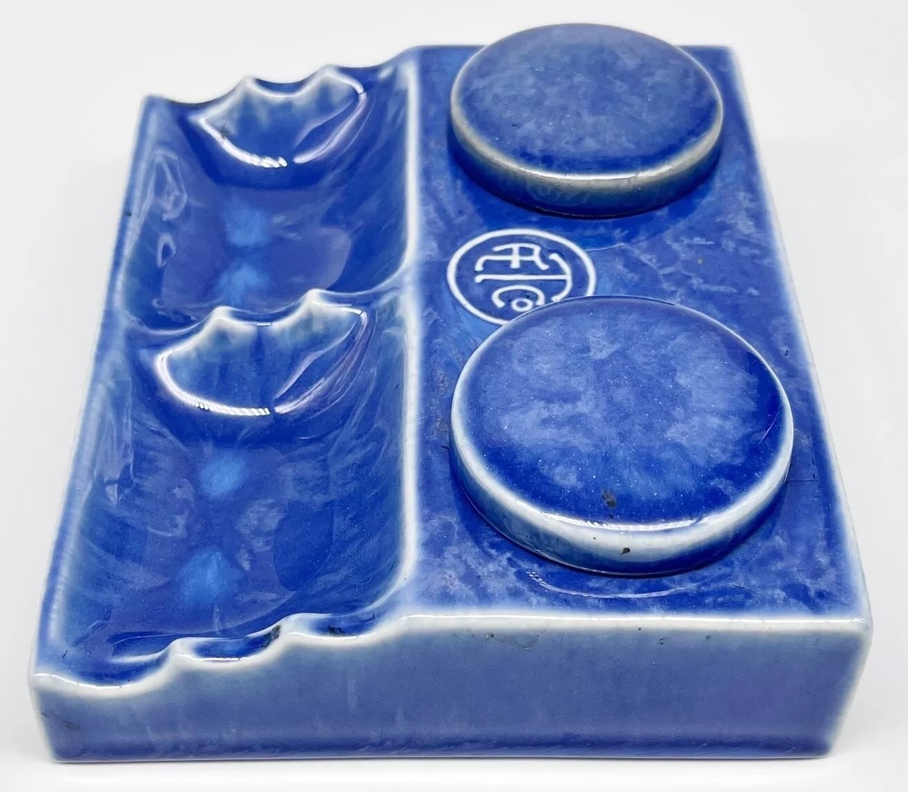 This advertising piece was made for the American Encaustic Tile Co. (AETCO) in Zanesville, Ohio. In between two inkwells with removeable lids is the AETCO logo within a circle. The area below the notches for holding up to three pens serves for storage of implements. Two examples – one pink, one blue – are pictured.